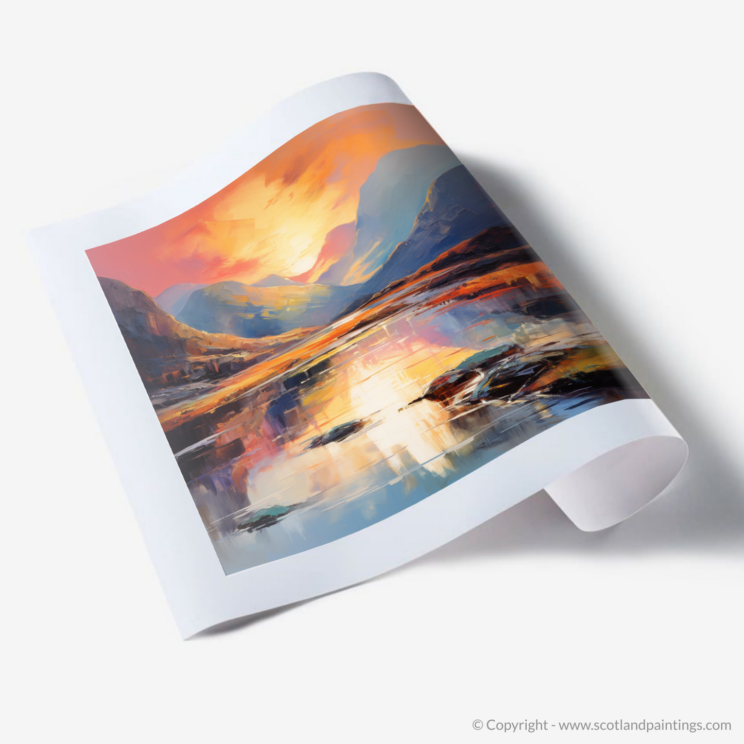 This piece transports you to a place where the distinction between earth and water blurs, and the sky's fiery spectacle becomes an integral part of the Highland's landscape. Offering more than just a visual escape, this print is an emotional journey that resonates with the tumultuous history and the soul-stirring magnificence of one of Scotland's most iconic locations. Add a touch of the wild and free essence of Glencoe to your space with this exquisite abstract expressionist print.
