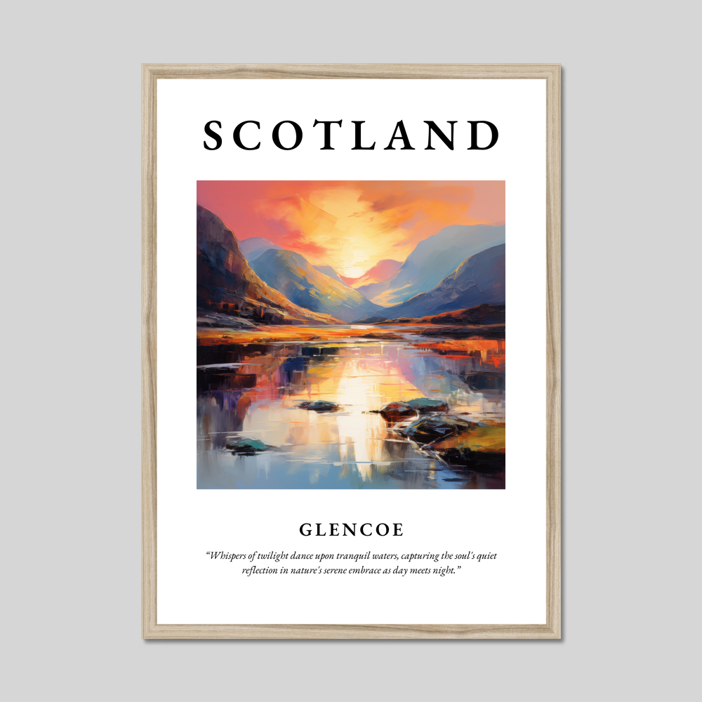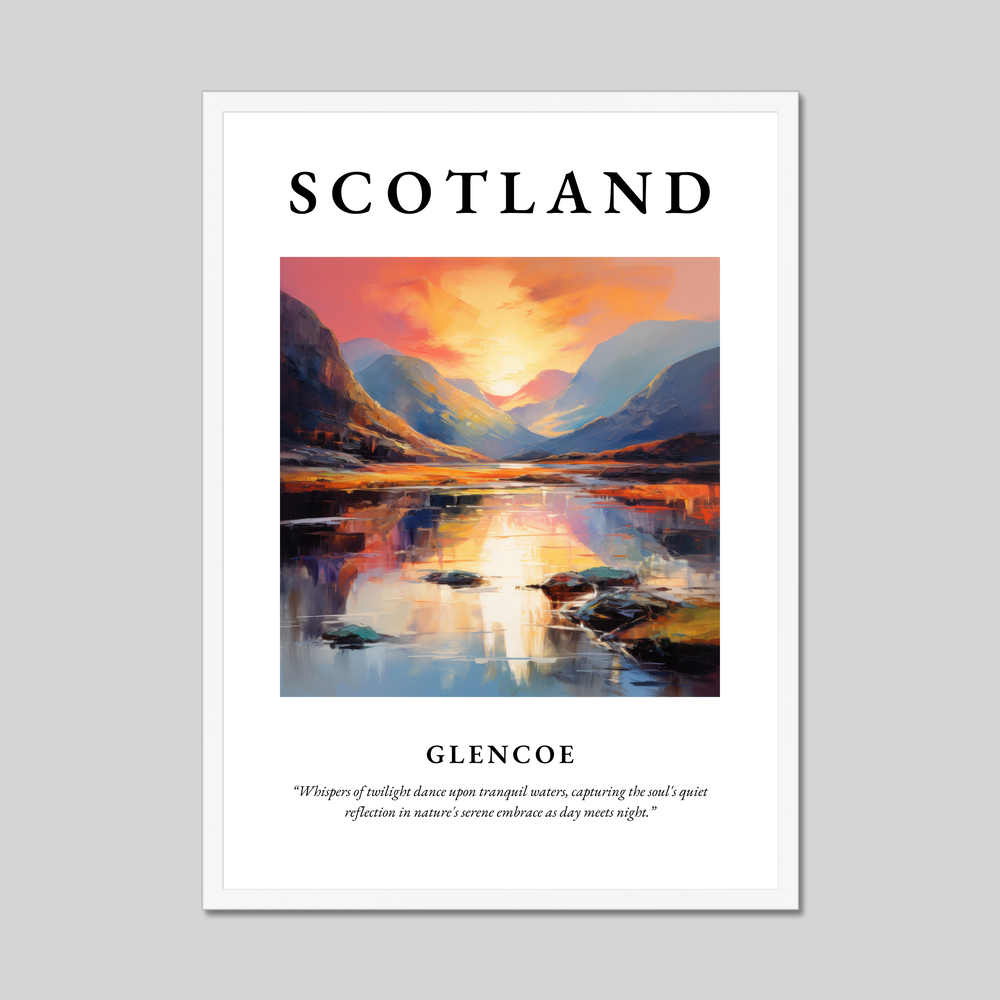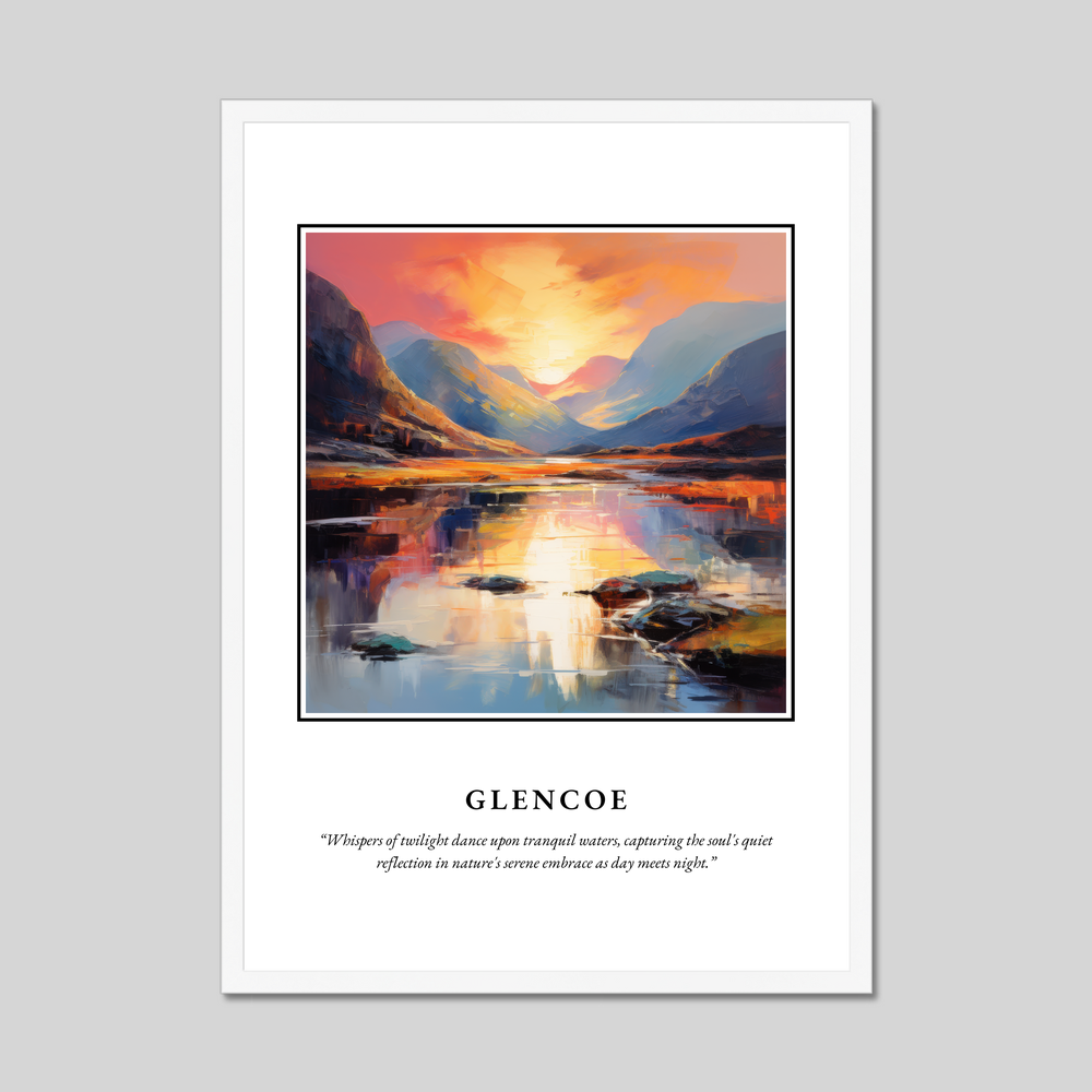 The centrepiece of this remarkable poster is a breathtaking painting of Glencoe, rendered in the evocative style of Abstract Expressionism. Bursting with a symphony of colours, the artwork captures the raw, untamed essence of Glencoe’s landscape. Swirling strokes of vivid orange and calming blue conjure the sun's tender hues as it dips below the rugged mountains, reflecting upon tranquil waters. Beneath this visual masterpiece lies the poetic quote, “Whispers of twilight dance upon tranquil waters, capturing the soul's quiet reflection in nature's serene embrace as day meets night,” perfectly capturing the tranquil spirit of Scotland's wilderness.