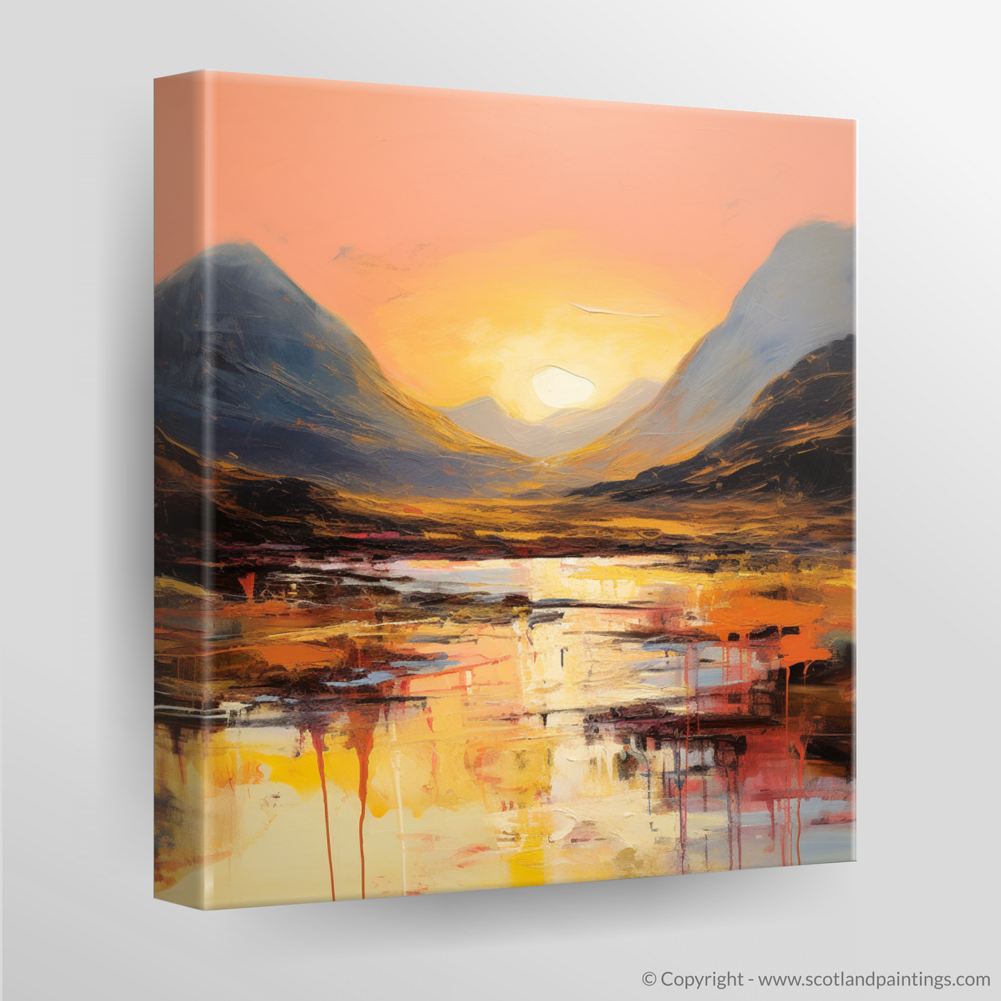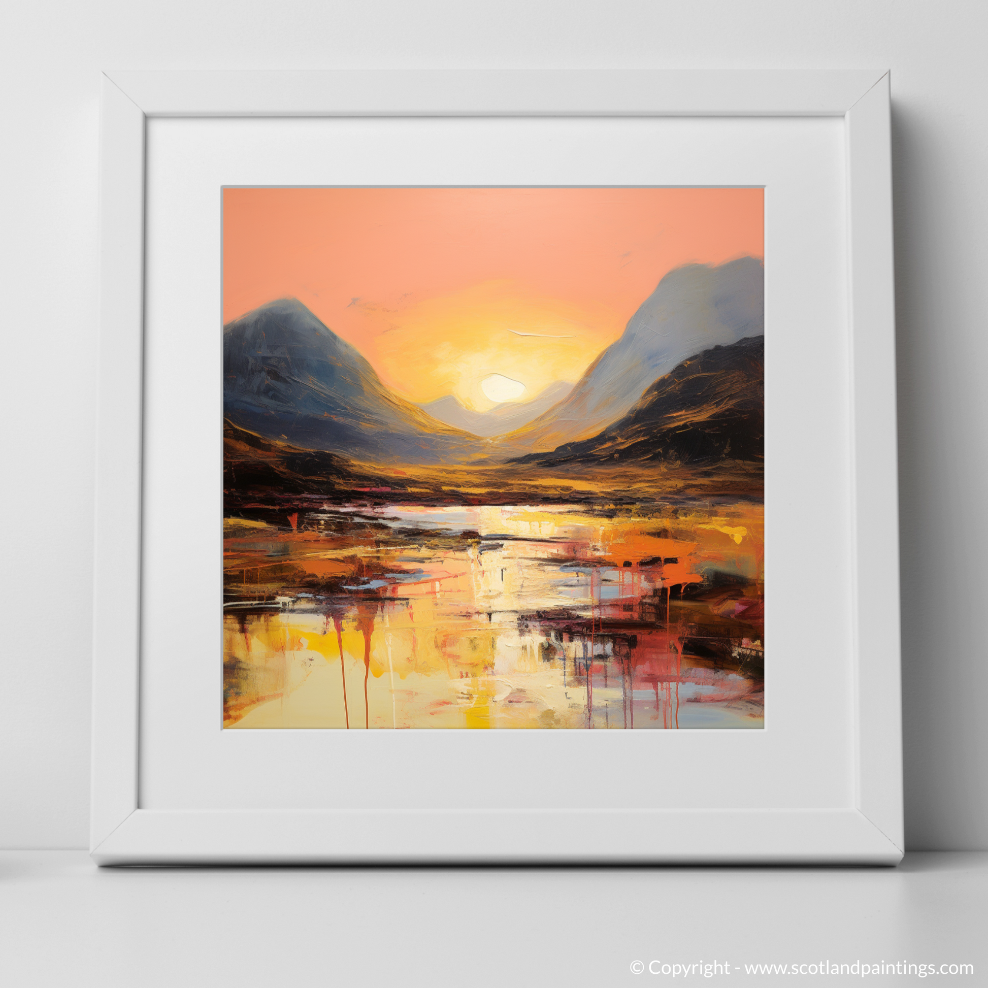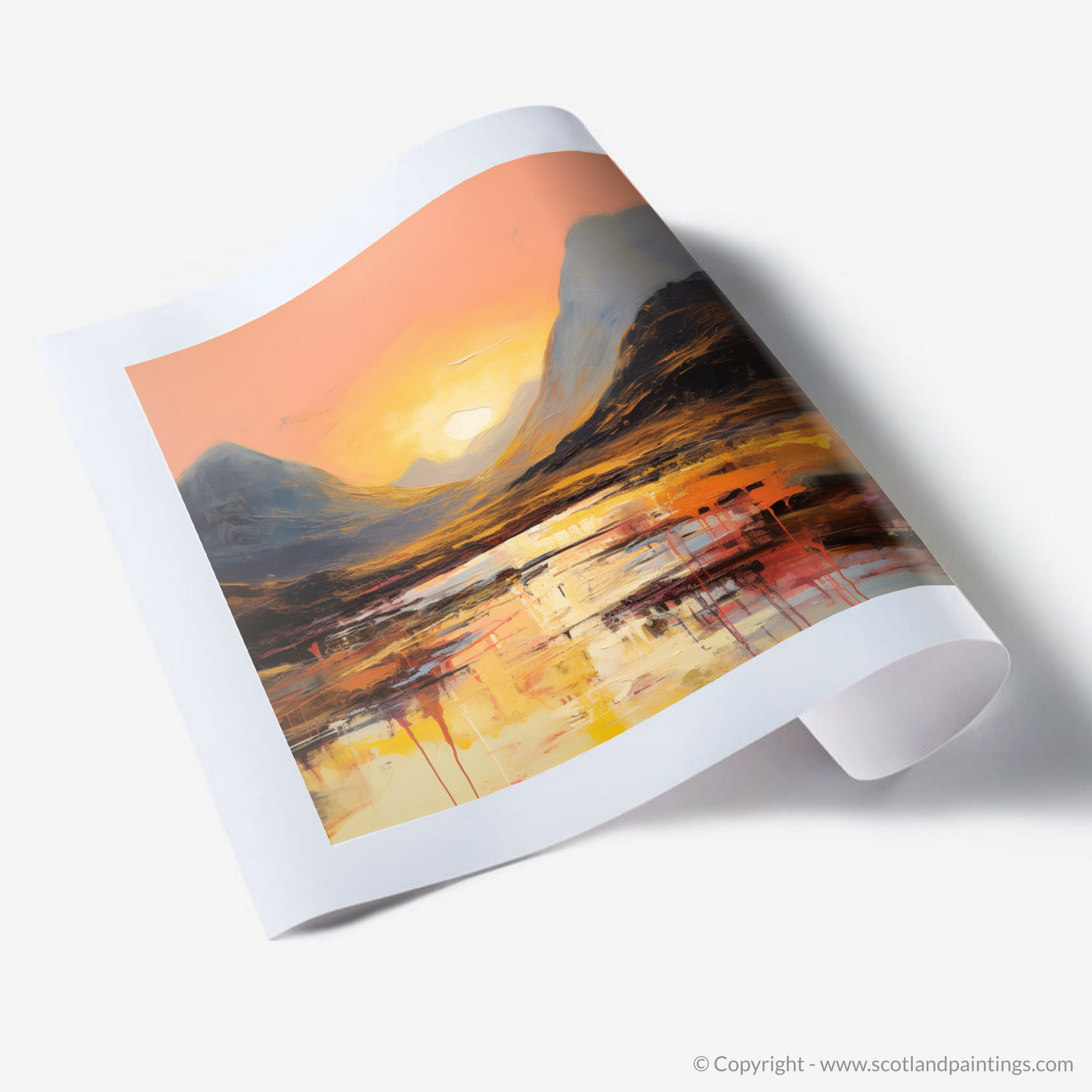As the sun dips towards the horizon, casting its glowing embrace across the rugged landscape, this abstract rendition of Buachaille during the golden hour is a symphony of colour and emotion. Soft coral and peach hues blend into the canvas, illuminating the sky in a spectacle that is both tranquil and fiery.