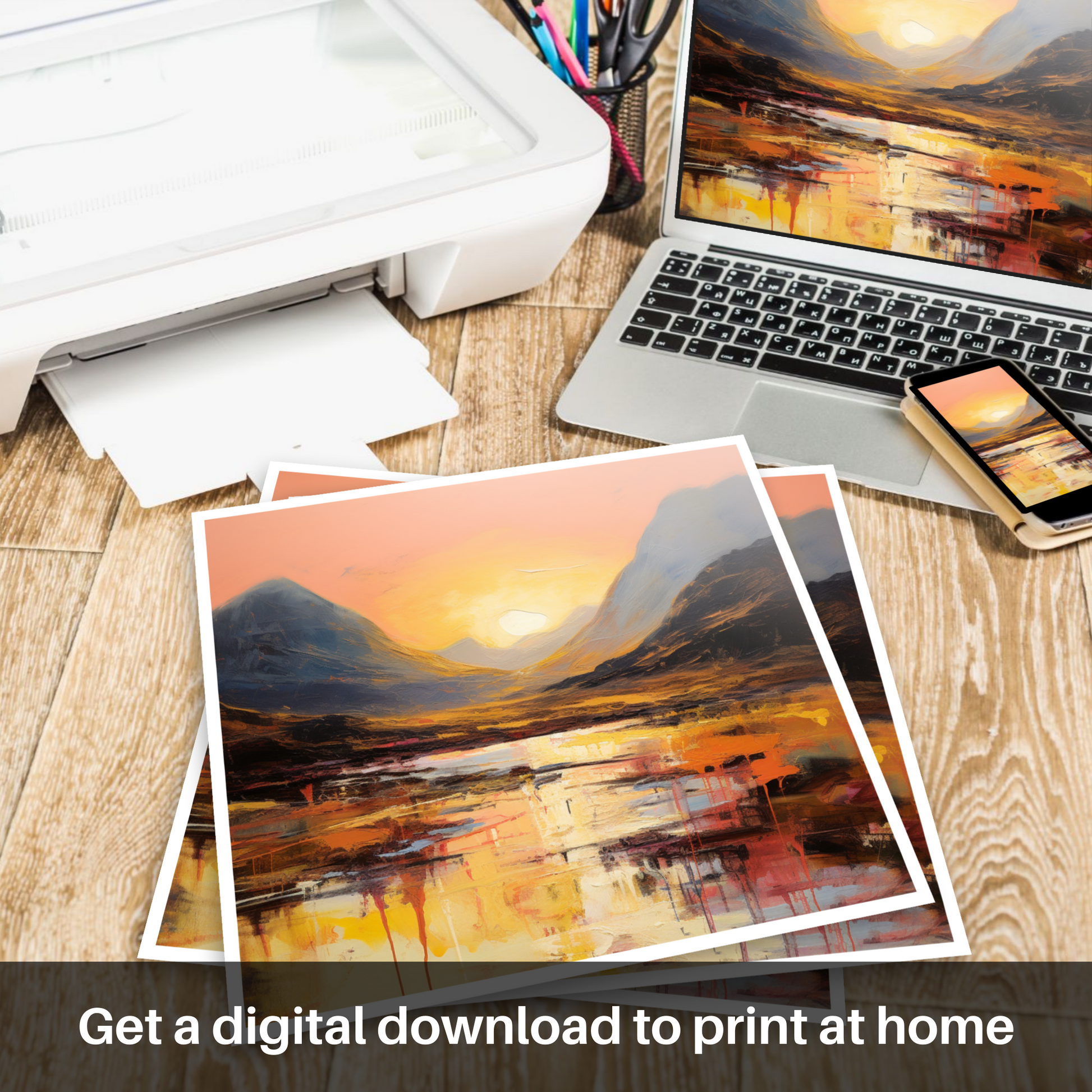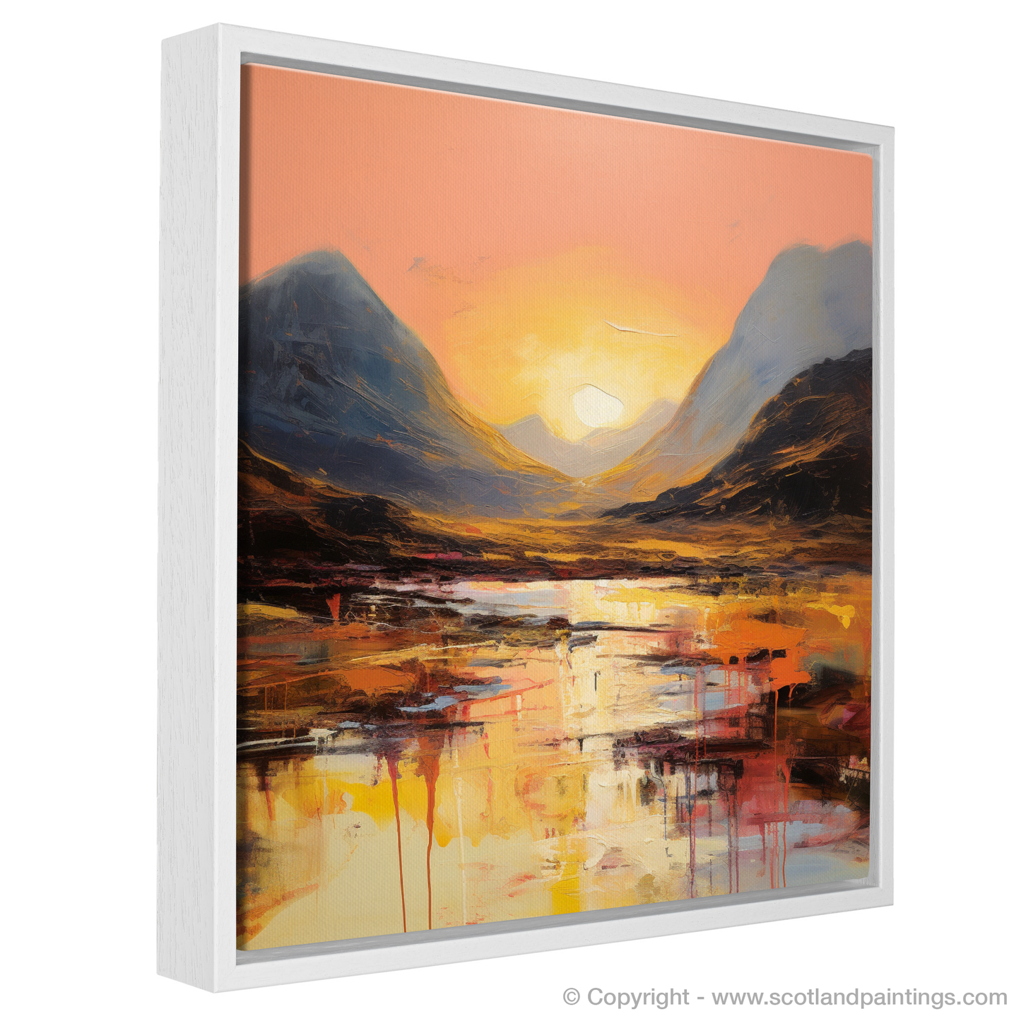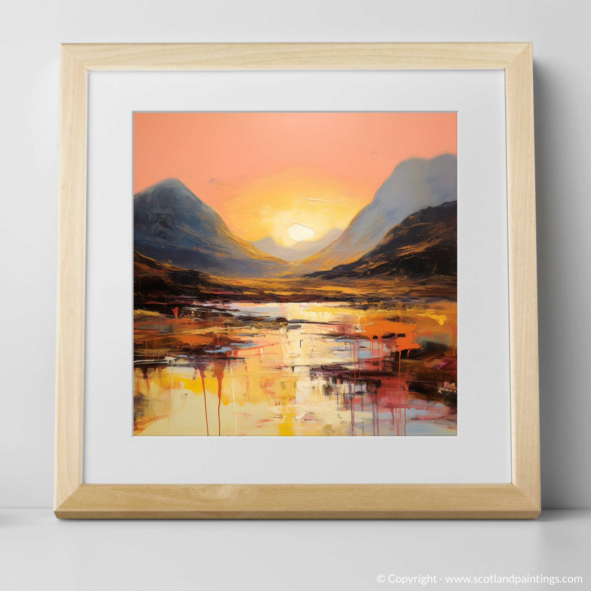 As the sun dips towards the horizon, casting its glowing embrace across the rugged landscape, this abstract rendition of Buachaille during the golden hour is a symphony of colour and emotion. Soft coral and peach hues blend into the canvas, illuminating the sky in a spectacle that is both tranquil and fiery.