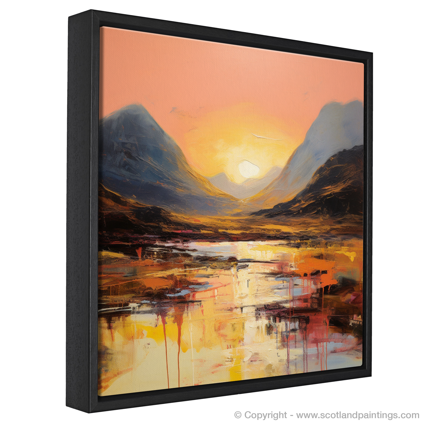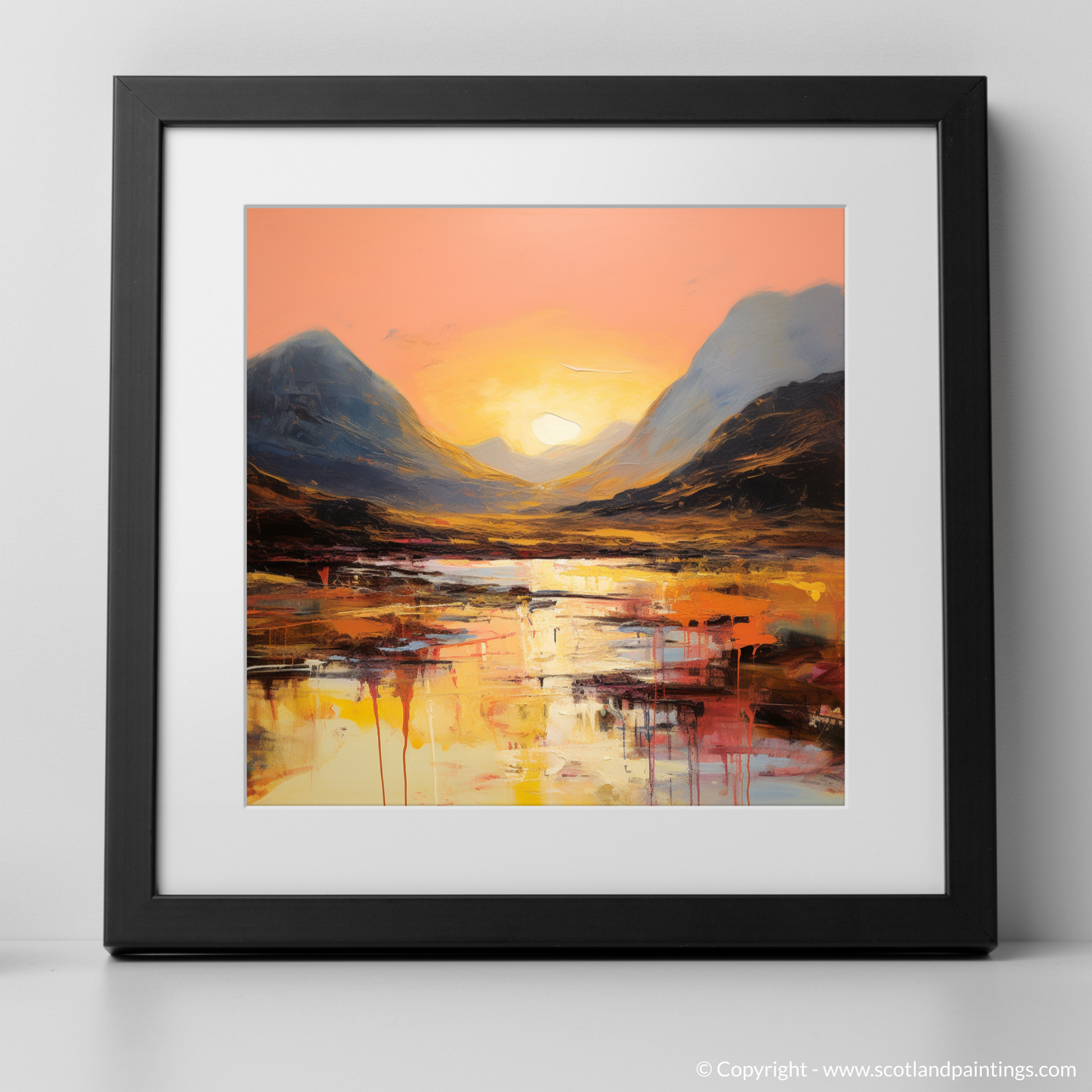 Bold strokes capture the dramatic silhouettes of Buachaille's proud peaks, their dark forms set against the backlit sky, shaping the valley with their unmistakable presence. Flecks of amber, ochre, and russet dance among the shadows, hinting at the wild heath and untamed moorland that define Glencoe's natural grandeur.