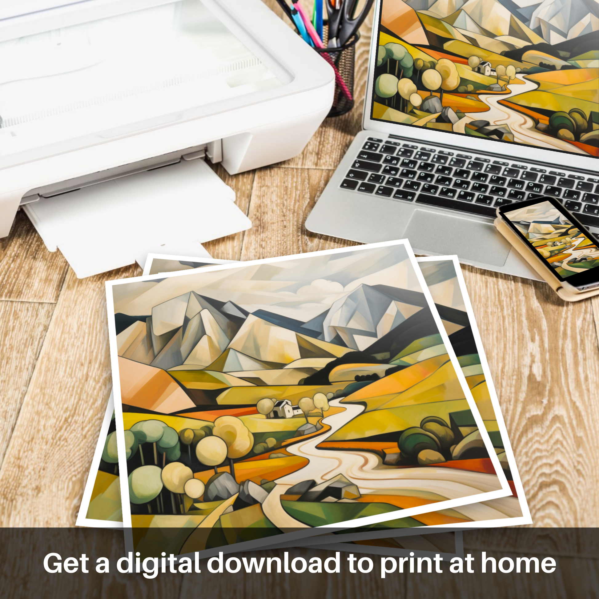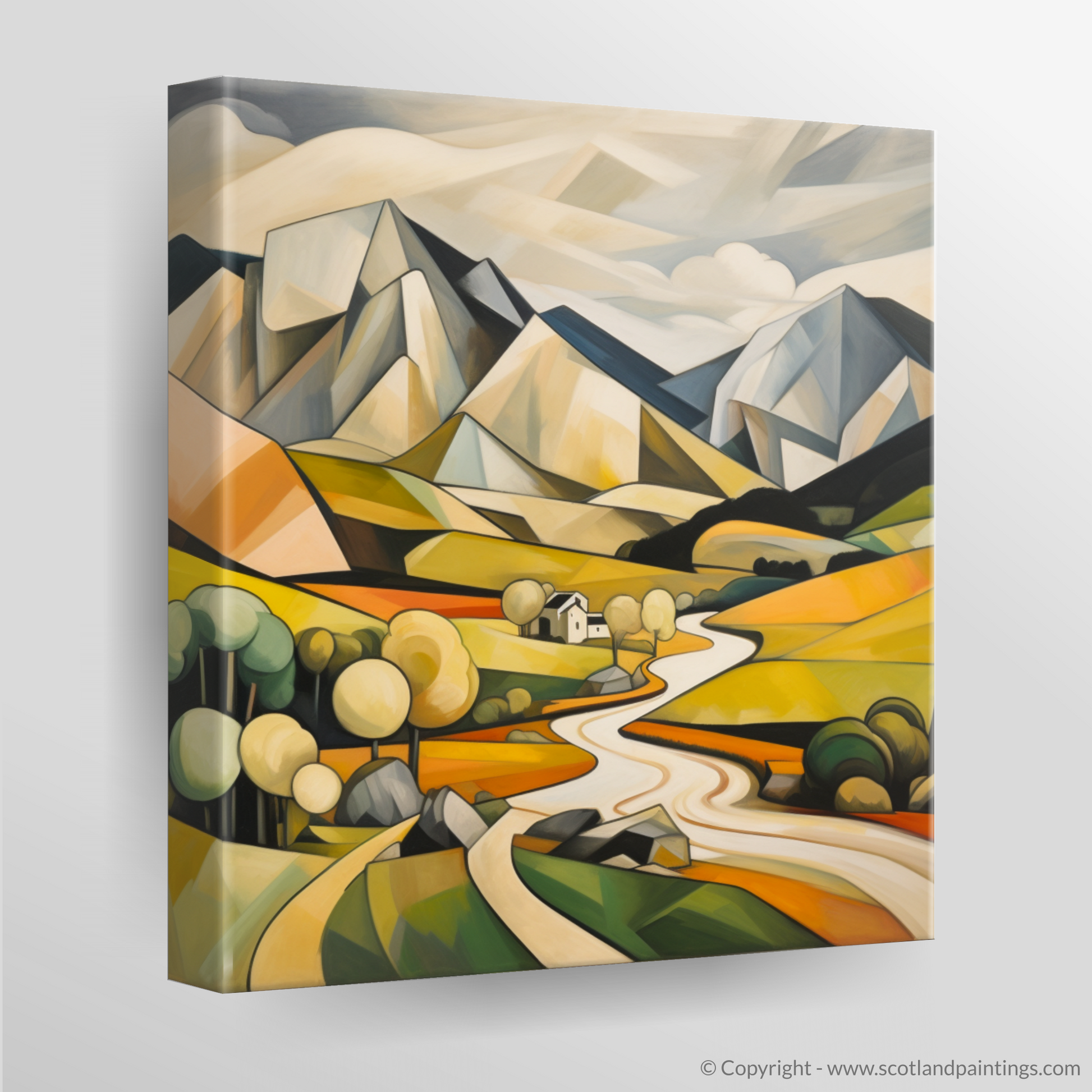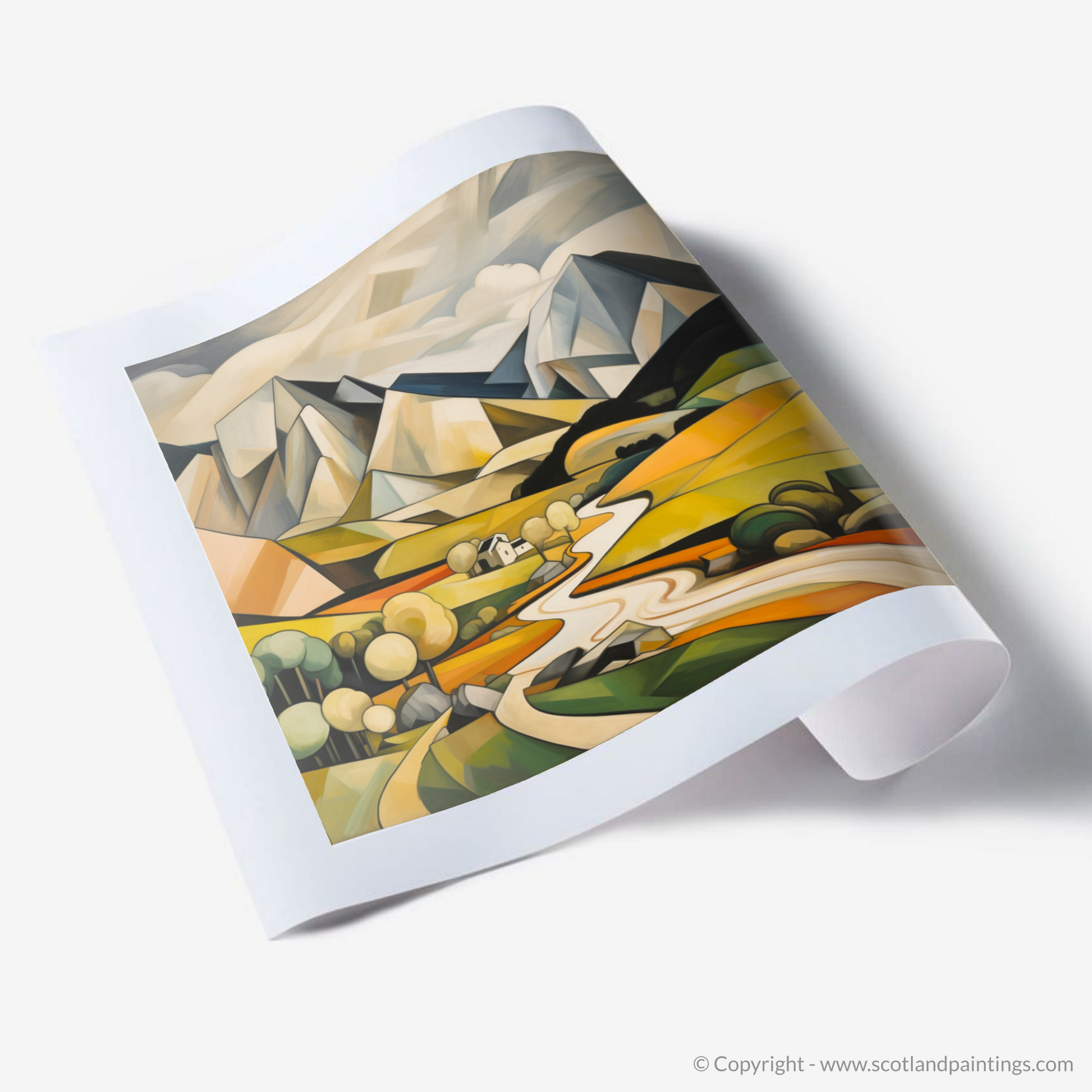 Immerse yourself in the angular beauty of the Scottish Highlands with this captivating cubist interpretation of Meall Corranaich, a renowned Munro that commands the landscape with its rugged peaks. Angular planes dissect the natural form of the mountains into an array of geometric facets, casting shadows and reflecting light in a palette of earthy tones and understated contrasts.