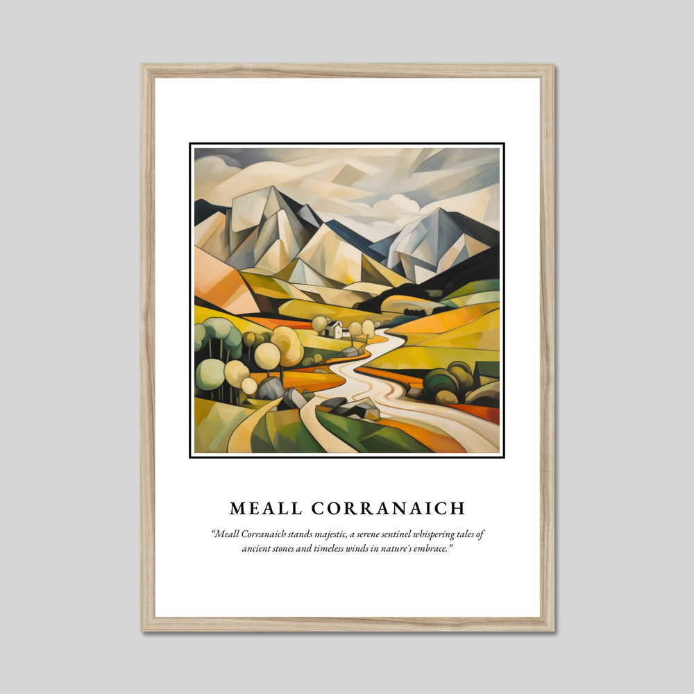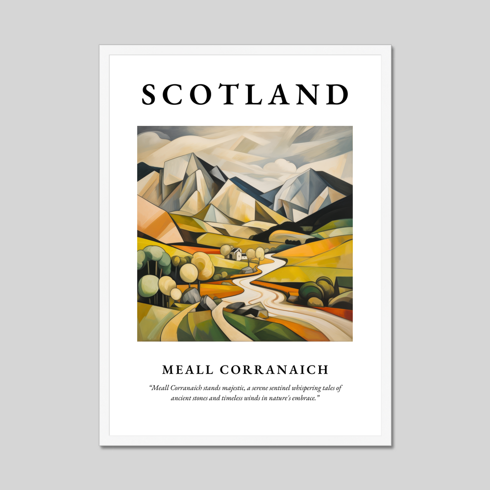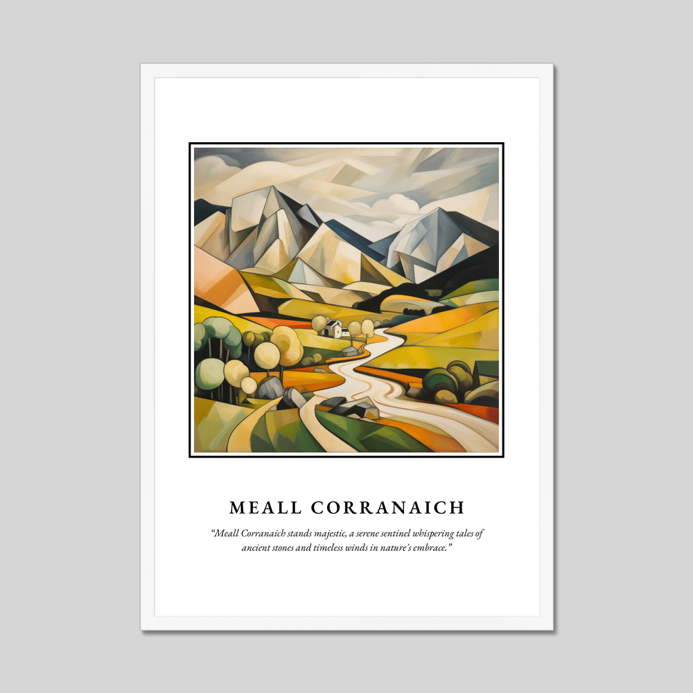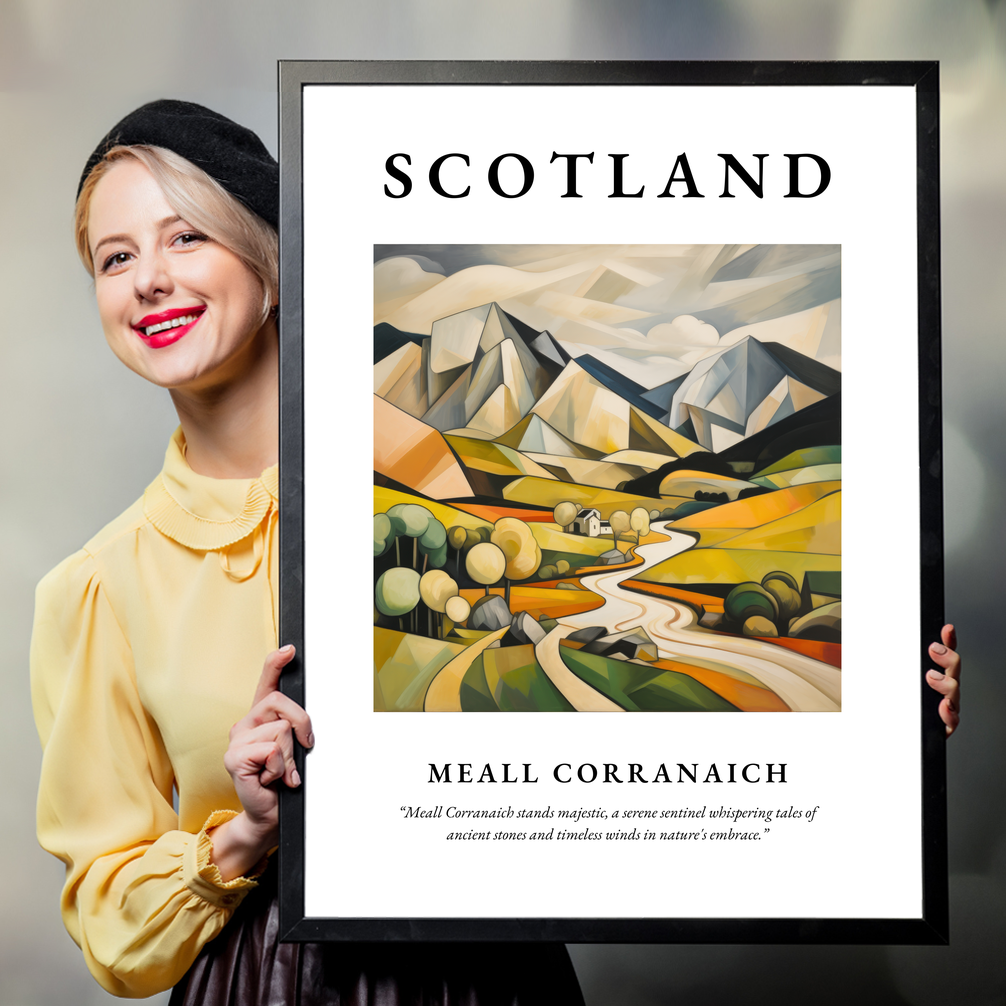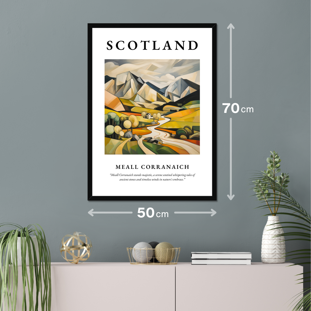 The poster commands attention with its striking black, white, or natural wood-effect frame, designed to complement any decor style. At the top, "SCOTLAND" is emblazoned in bold lettering, drawing you into the heart of this dramatic vista. Below the beautifully fragmented image of Meall Corranaich lies a poetic homage: “Meall Corranaich stands majestic, a serene sentinel whispering tales of ancient stones and timeless winds in nature's embrace,” encapsulating the allure of this Highland treasure.