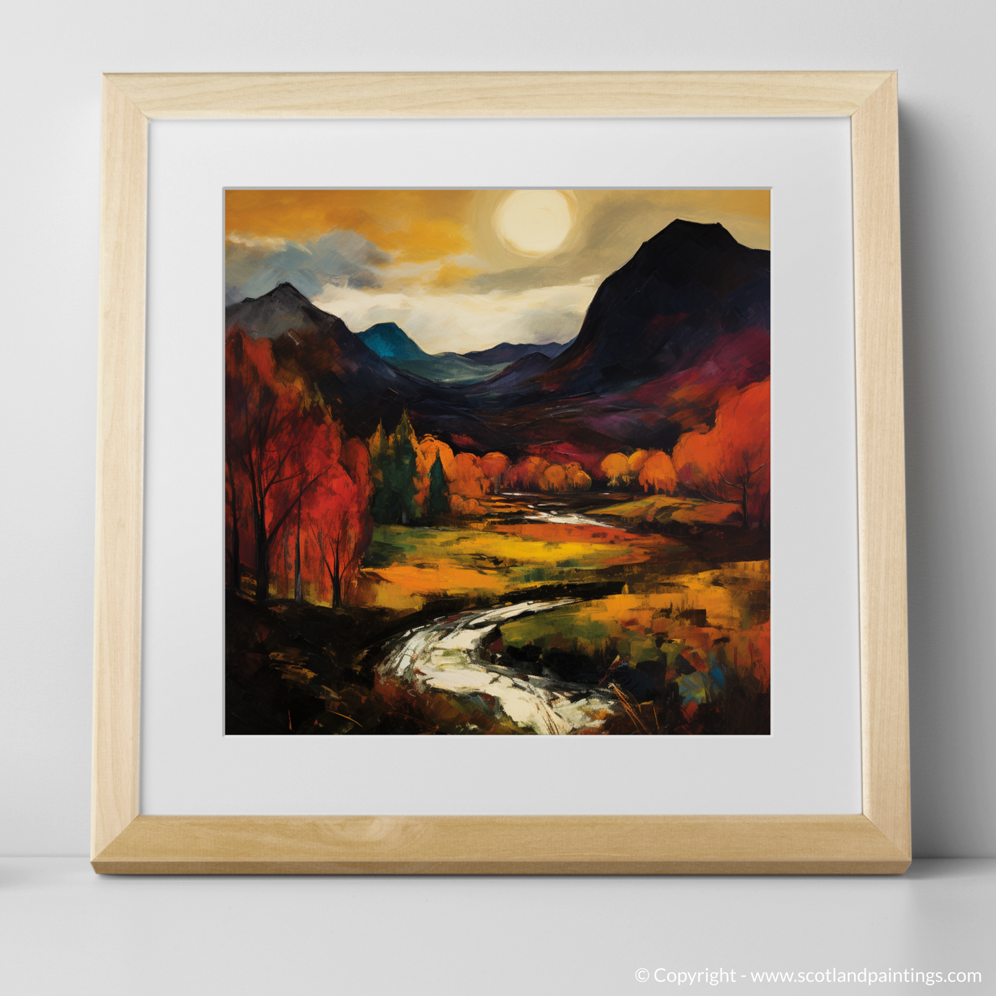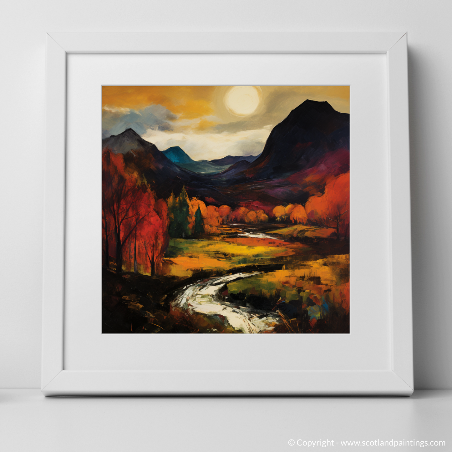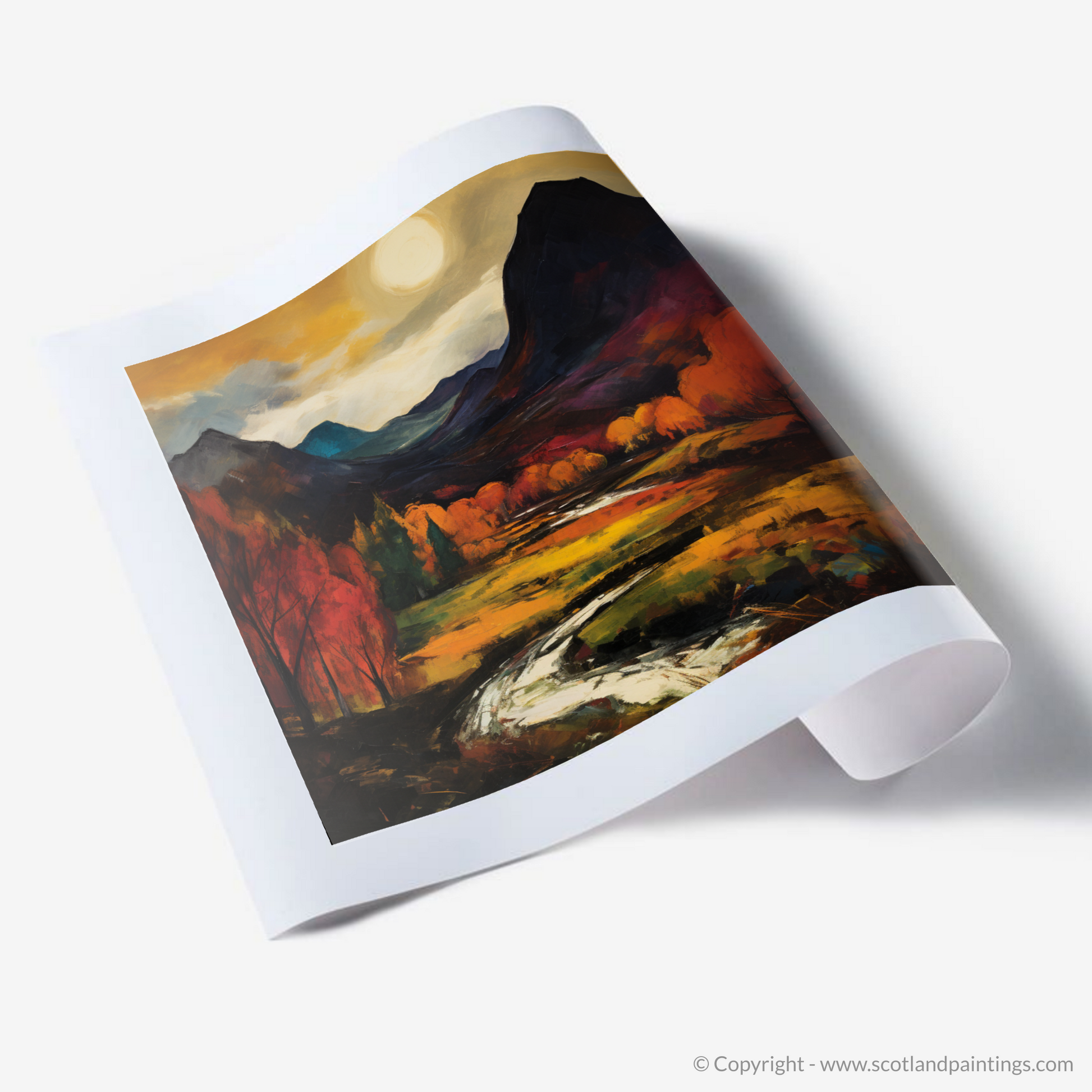 As autumn whispers through the Glencoe valley, this print captures the essence of the season with a fervour of colours that are reminiscent of the Fauvist movement's liberation from realism. The bold, expressive brushstrokes invite the viewer into a landscape ablaze with ochres, crimsons, and amber tones, which contrast exquisitely with the dusky purples and deep blues of the majestic highlands.
