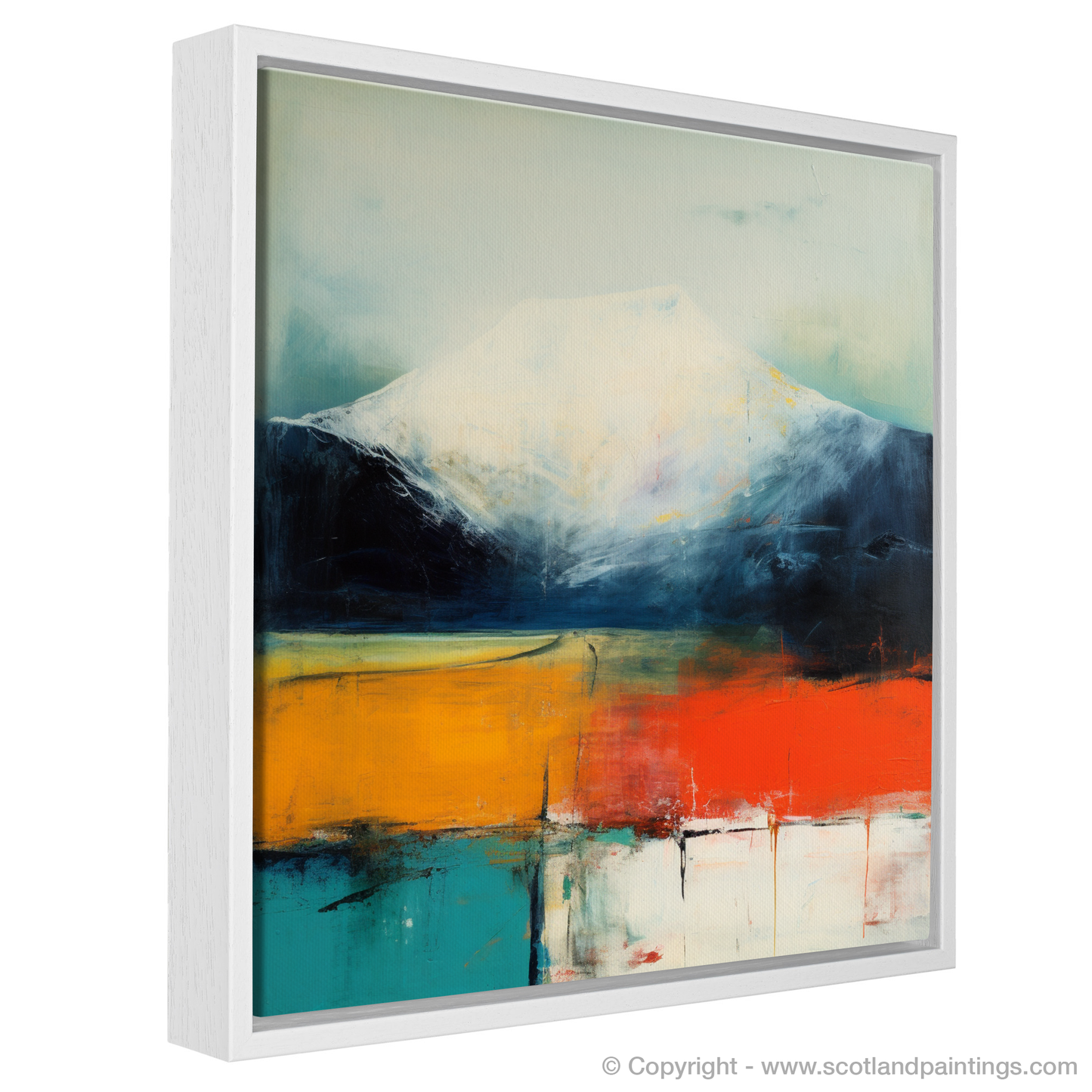 The foreground is a fierce orchestra of red and orange hues, bleeding into each other like the blaze of a Highland sunset. A hint of teal at the bottom captures the reflection of sky in water, suggesting the presence of a tranquil loch at the foot of the mountain. These warm, earthy tones contrast starkly with the cool, serene whites and blues that depict the mountain itself, crowning the composition with a sense of tranquility amid the abstract tumult. Yet, in the midst of this calm, wisps of dyn