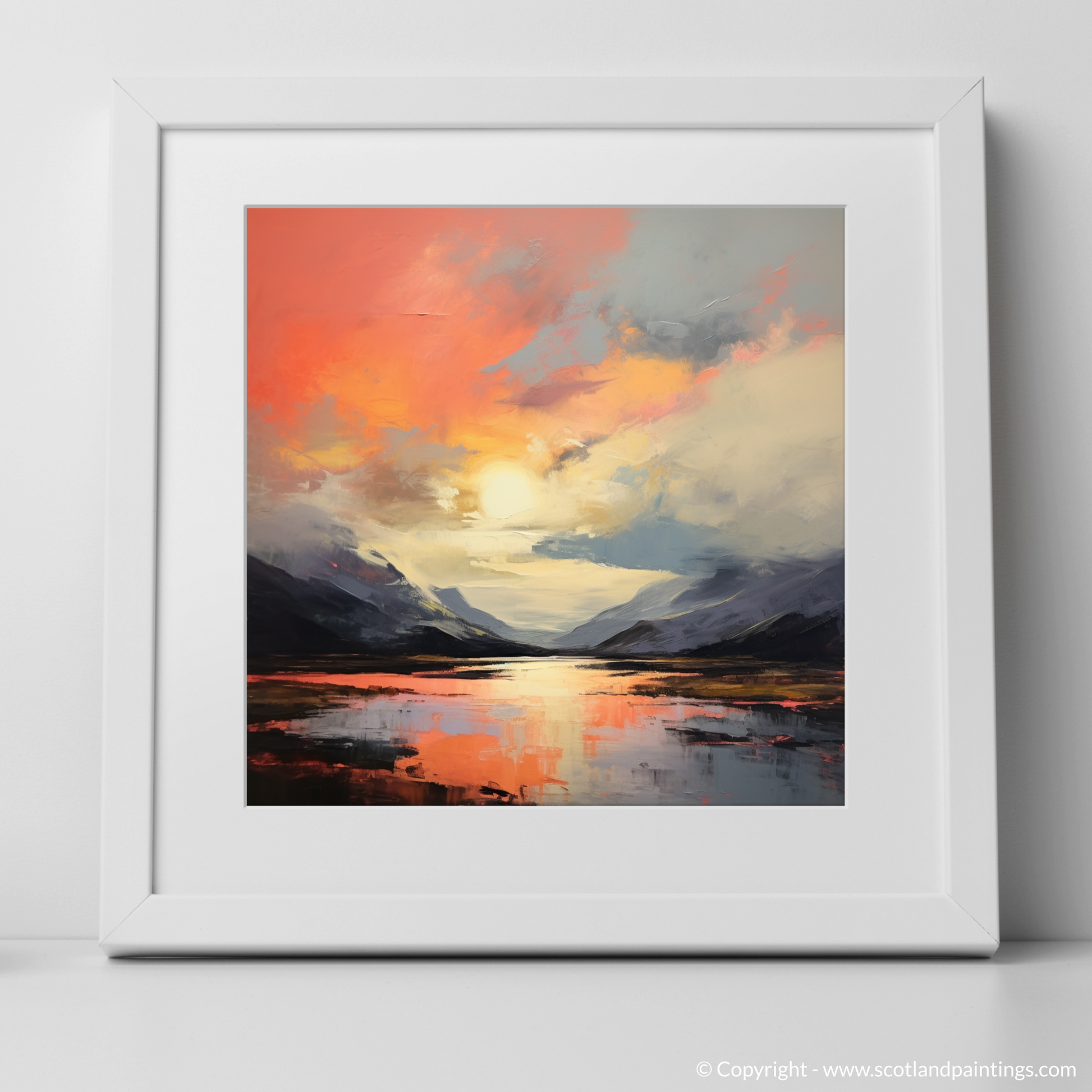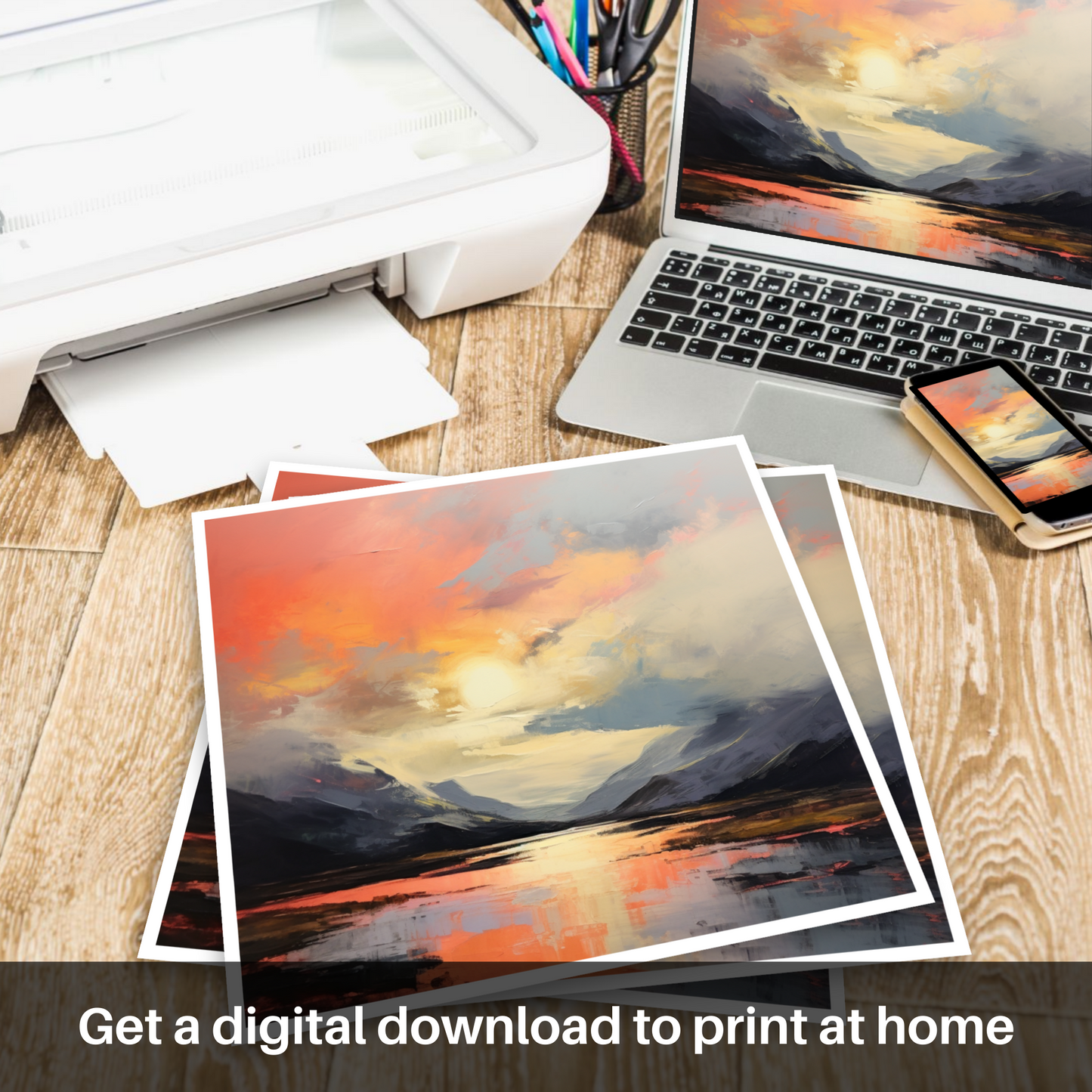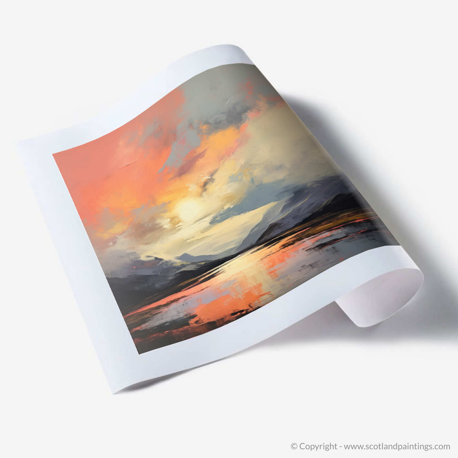 As the day draws to a close in the mystical lands of Glencoe, the heavens themselves seem to alight with a symphony of colour. This evocative print captures the ethereal beauty of moody clouds at sunset, their dance reflected in the tranquil waters below.