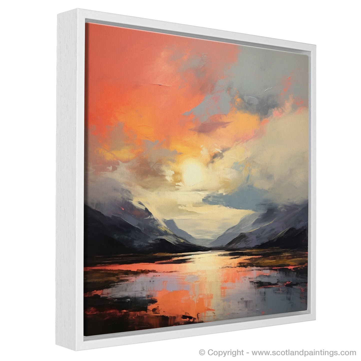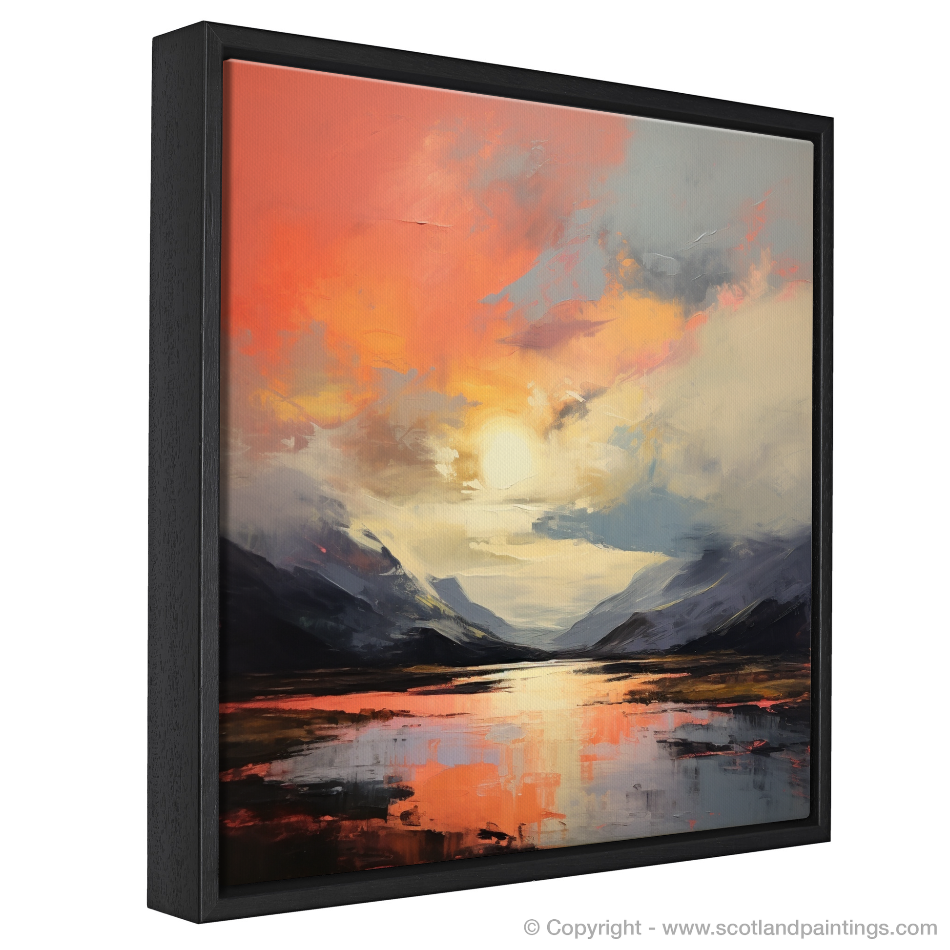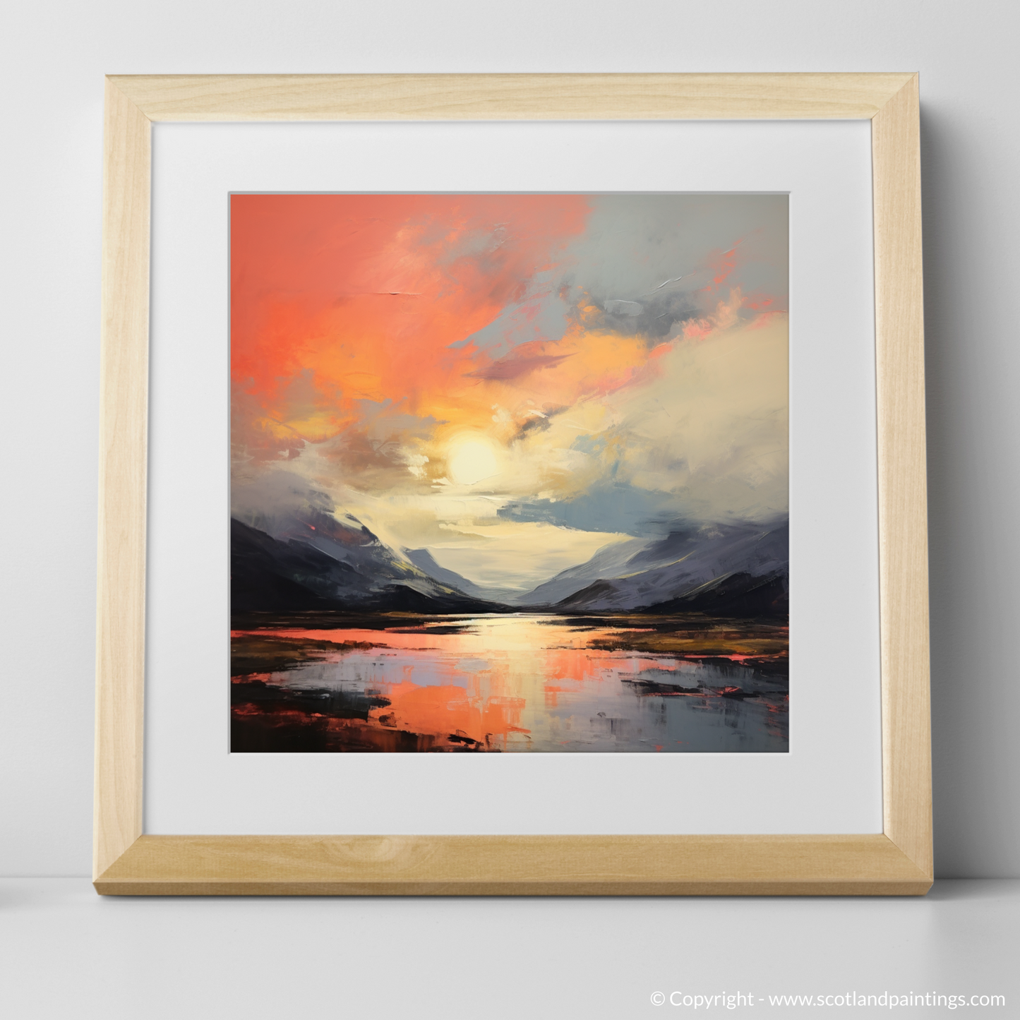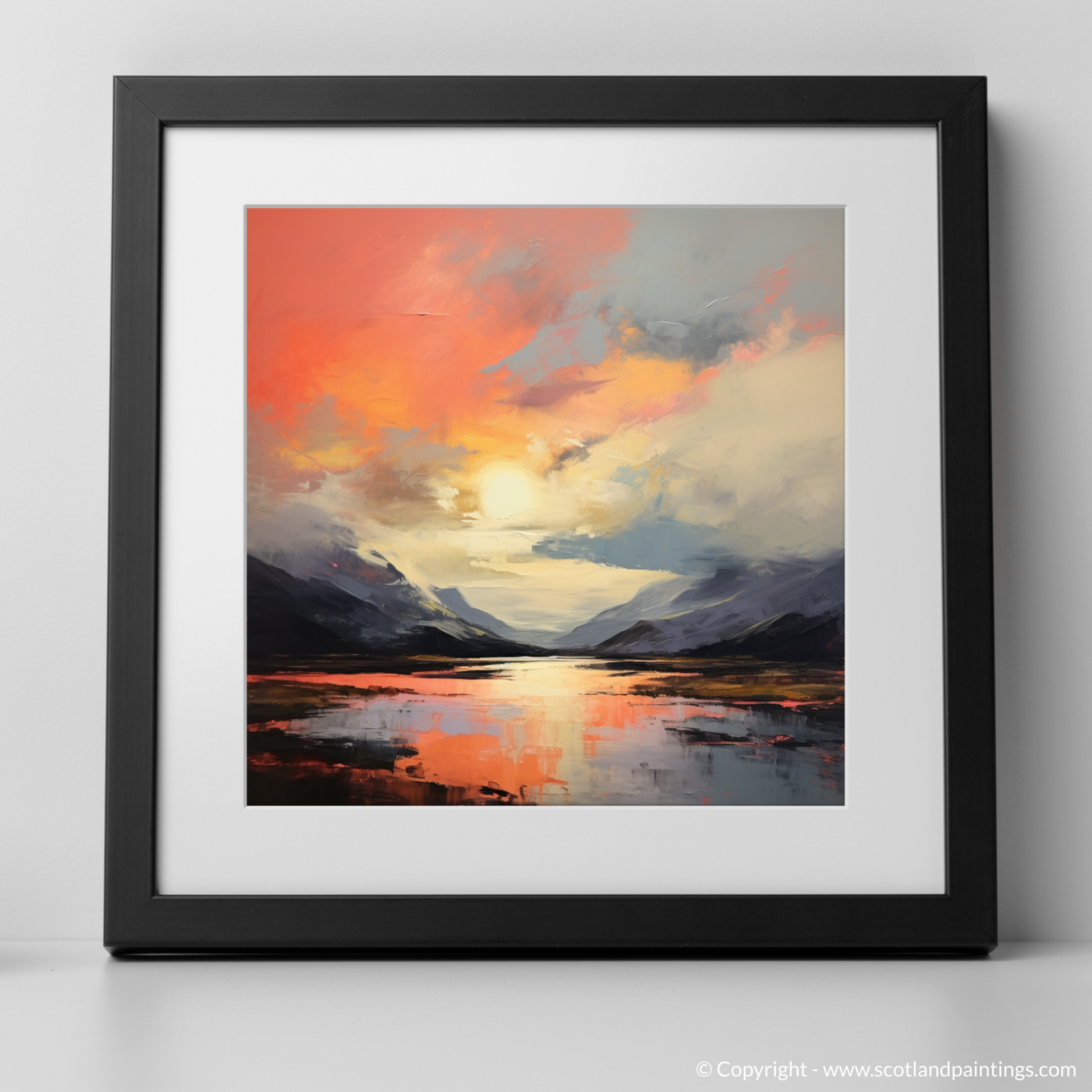 As the day draws to a close in the mystical lands of Glencoe, the heavens themselves seem to alight with a symphony of colour. This evocative print captures the ethereal beauty of moody clouds at sunset, their dance reflected in the tranquil waters below.