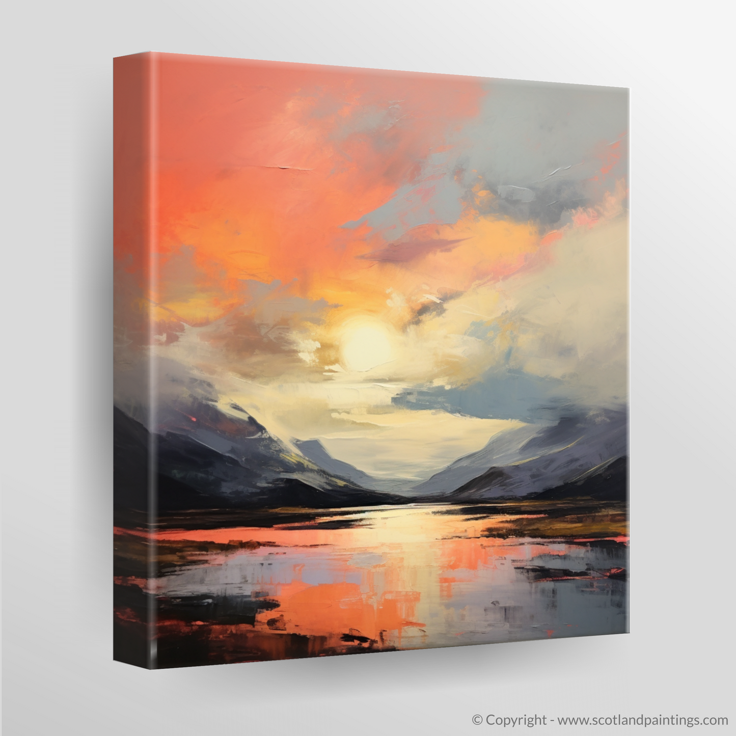 The essence of Minimalism breathes through this piece, where every stroke and hue contributes to a larger sense of peace and introspection. The sky, a canvas of deep oranges, fiery reds, and soothing yellows, converges into a glowing orb sinking into the horizon. This radiant sun, mirroring itself upon the serene loch, creates a pathway of light that invites one to traverse the divide between day and night.
