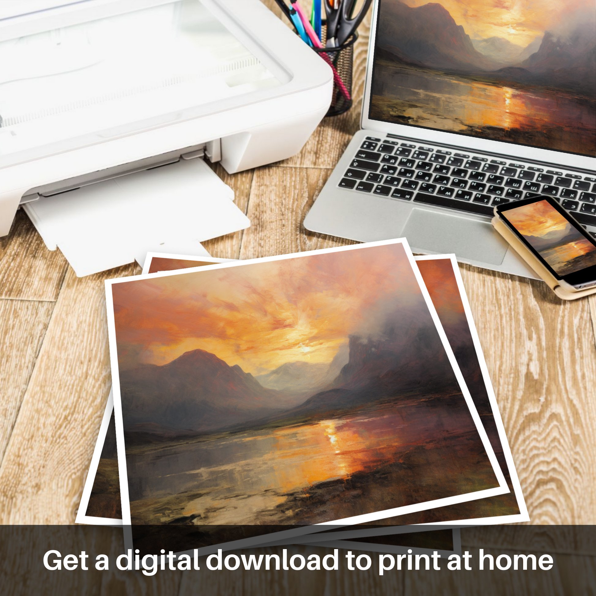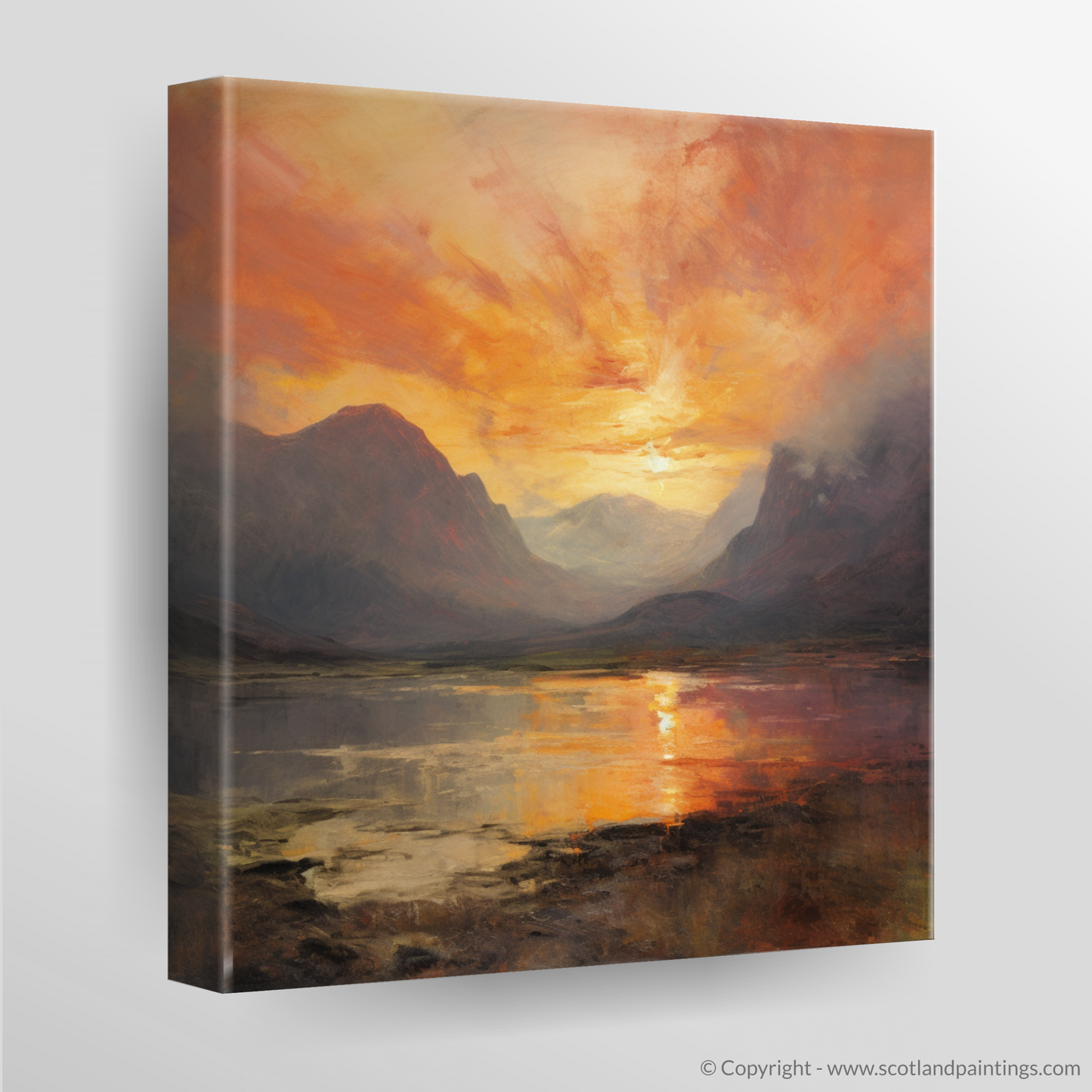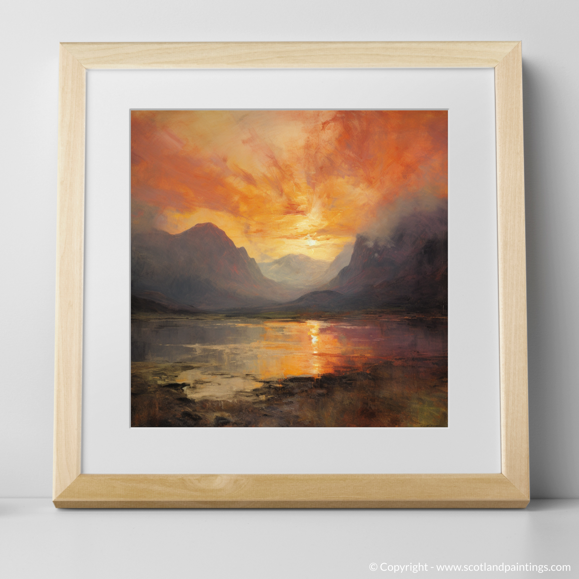 Awash with the warm glow of a setting sun, this captivating print transports viewers to the rugged heart of Glencoe. The embrace of fiery oranges, deep reds, and gentle yellows illuminates the canvas, reflecting a sky ablaze upon the serene waters below. This piece masterfully captures the fleeting moments of twilight, as light and shadow dance across the sky's expansive canvas, setting the heavens alight with colour.