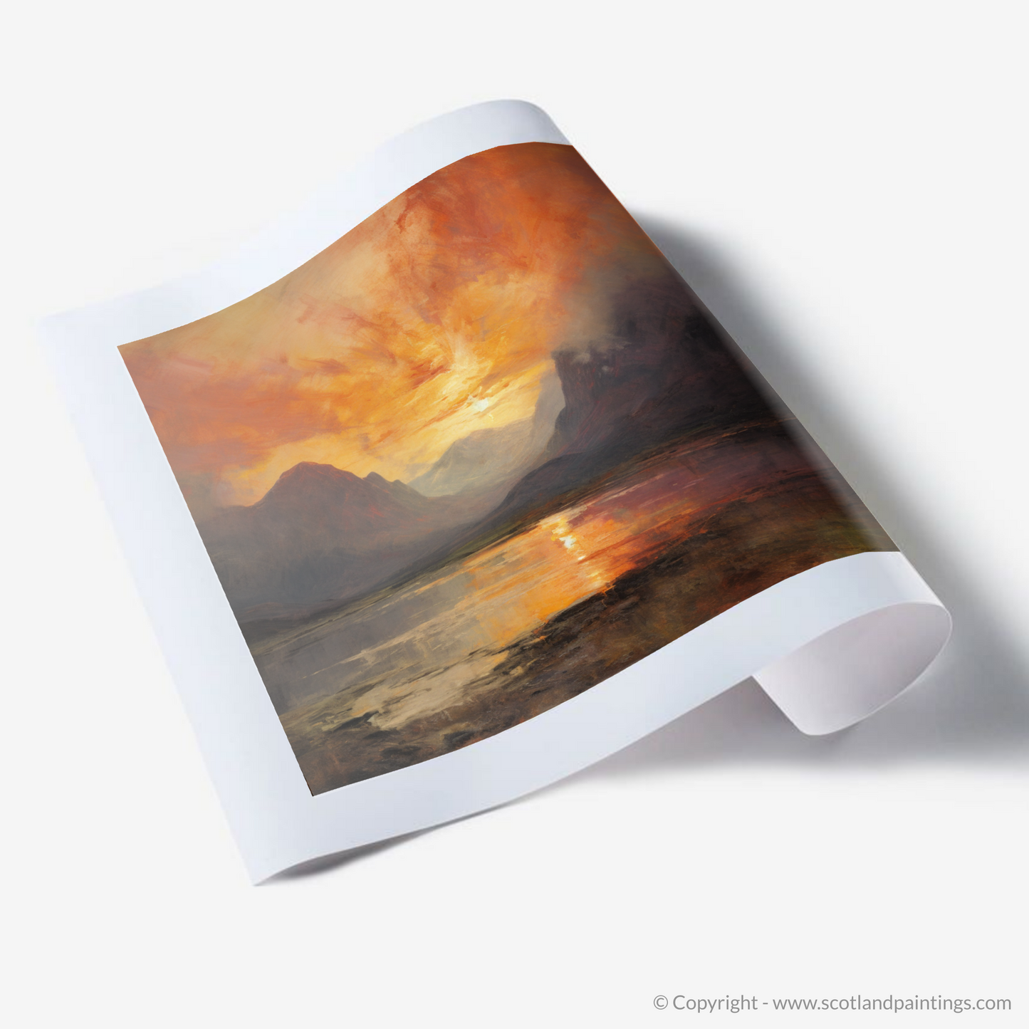 Near the water's edge, the detail gives way to an artful blend of shadow and fading light, allowing viewers to fill in the landscapes with their interpretations. This print is not simply a visual experience; it is an invitation to take in the wild, untamed beauty of one of Scotland's most revered landscapes, an illustration of nature's ability to paint scenes that stir the soul and ignite the senses.