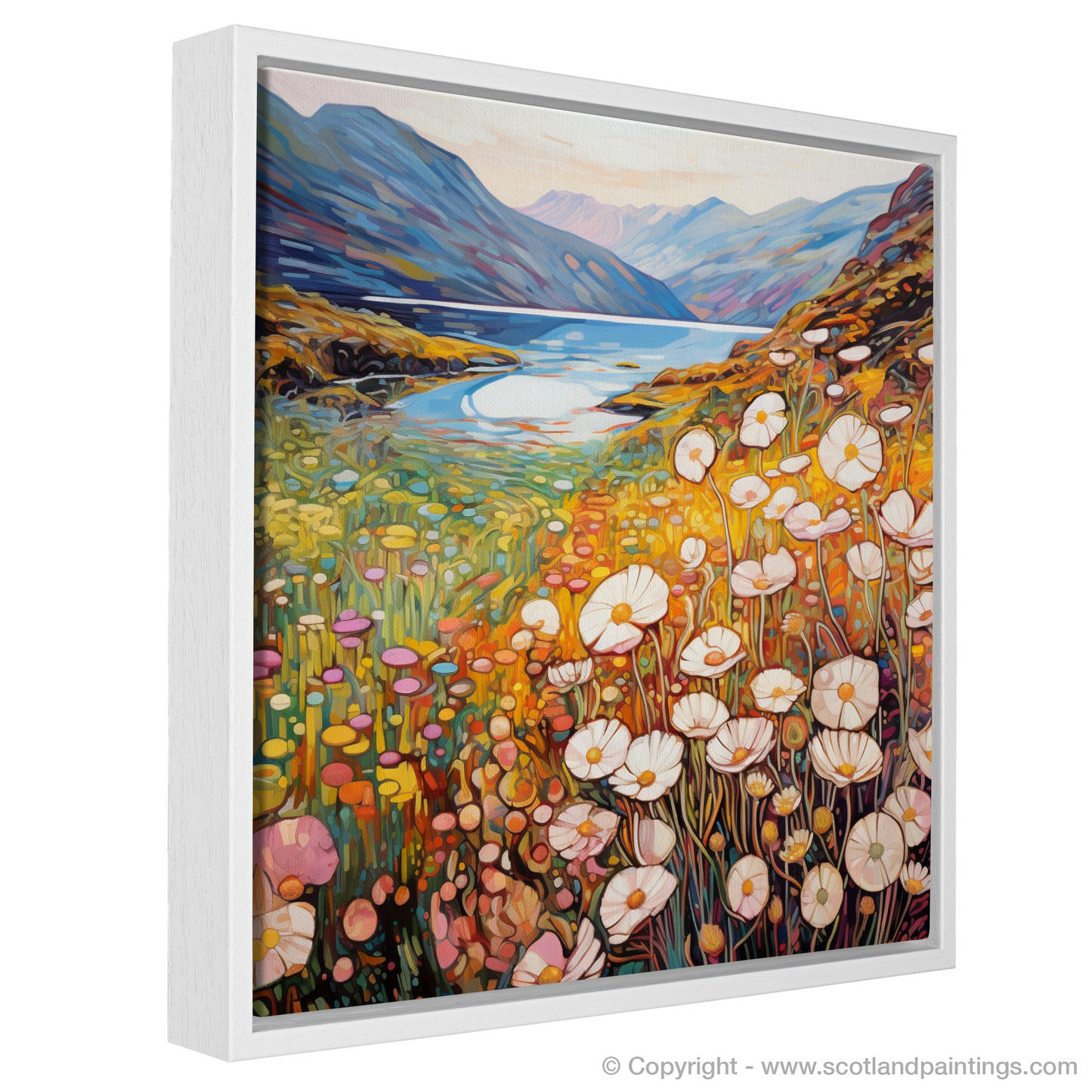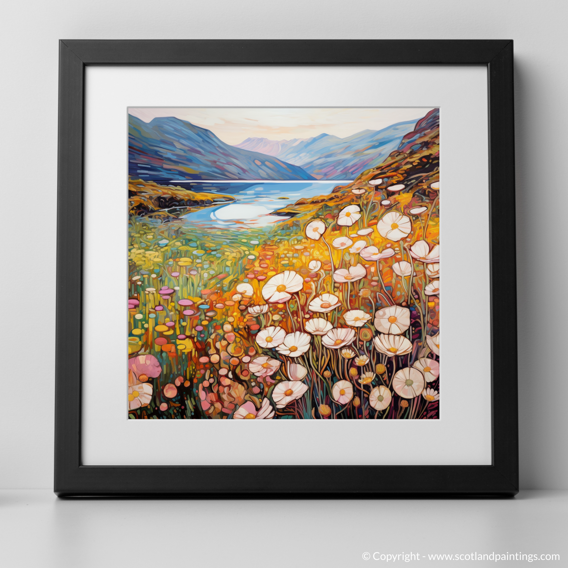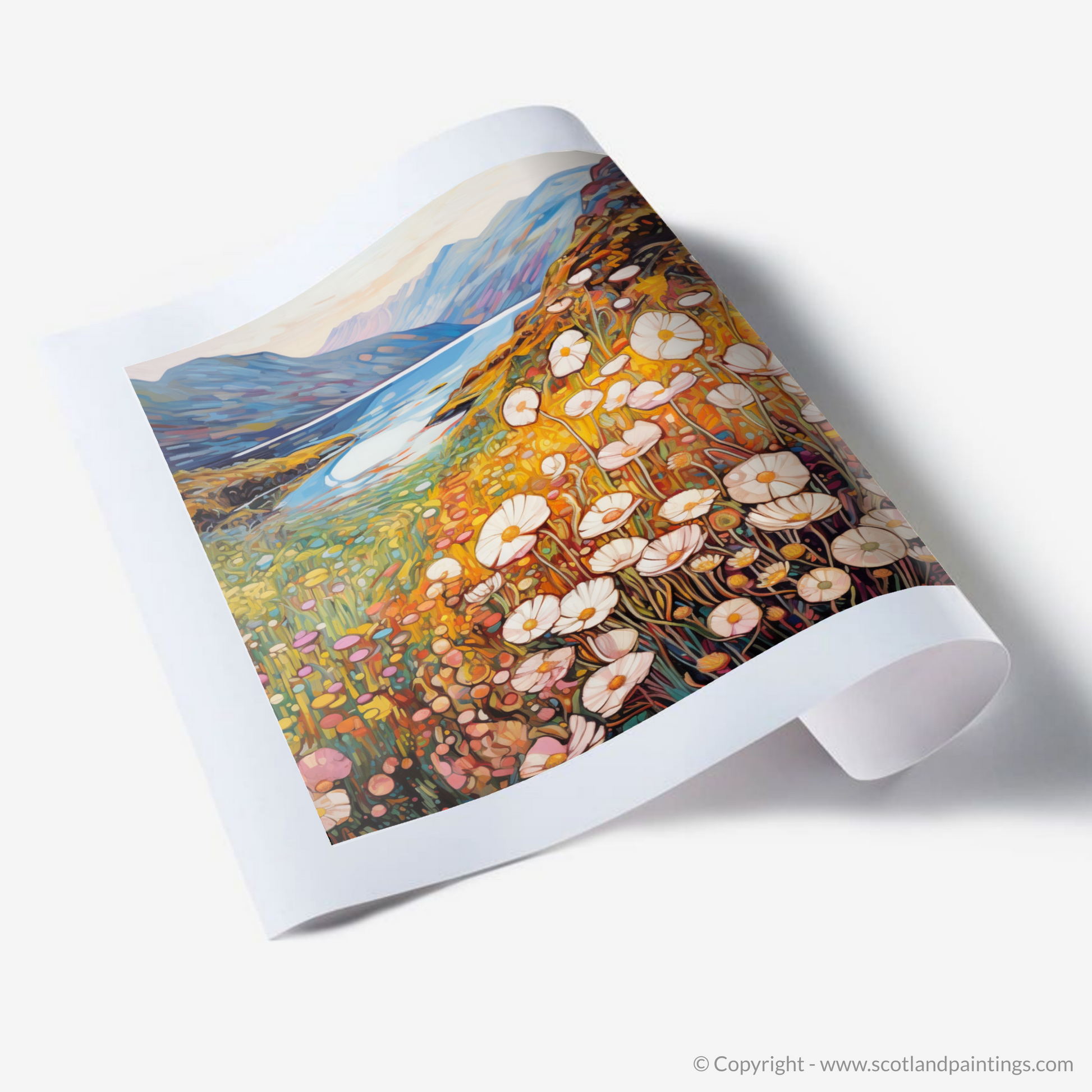 Awash with the warm hues of a setting sun, this enchanting print captures the essence of Glencoe's wild beauty as if through the eyes of a dreamer. Graceful thrifty flowers, their white and pink petals delicate as porcelain, dance in the foreground, encapsulated by the inviting tendrils of Art Nouveau. Each bloom's organic form contrasts harmoniously against the towering majesty of the craggy overlooks in the distance.