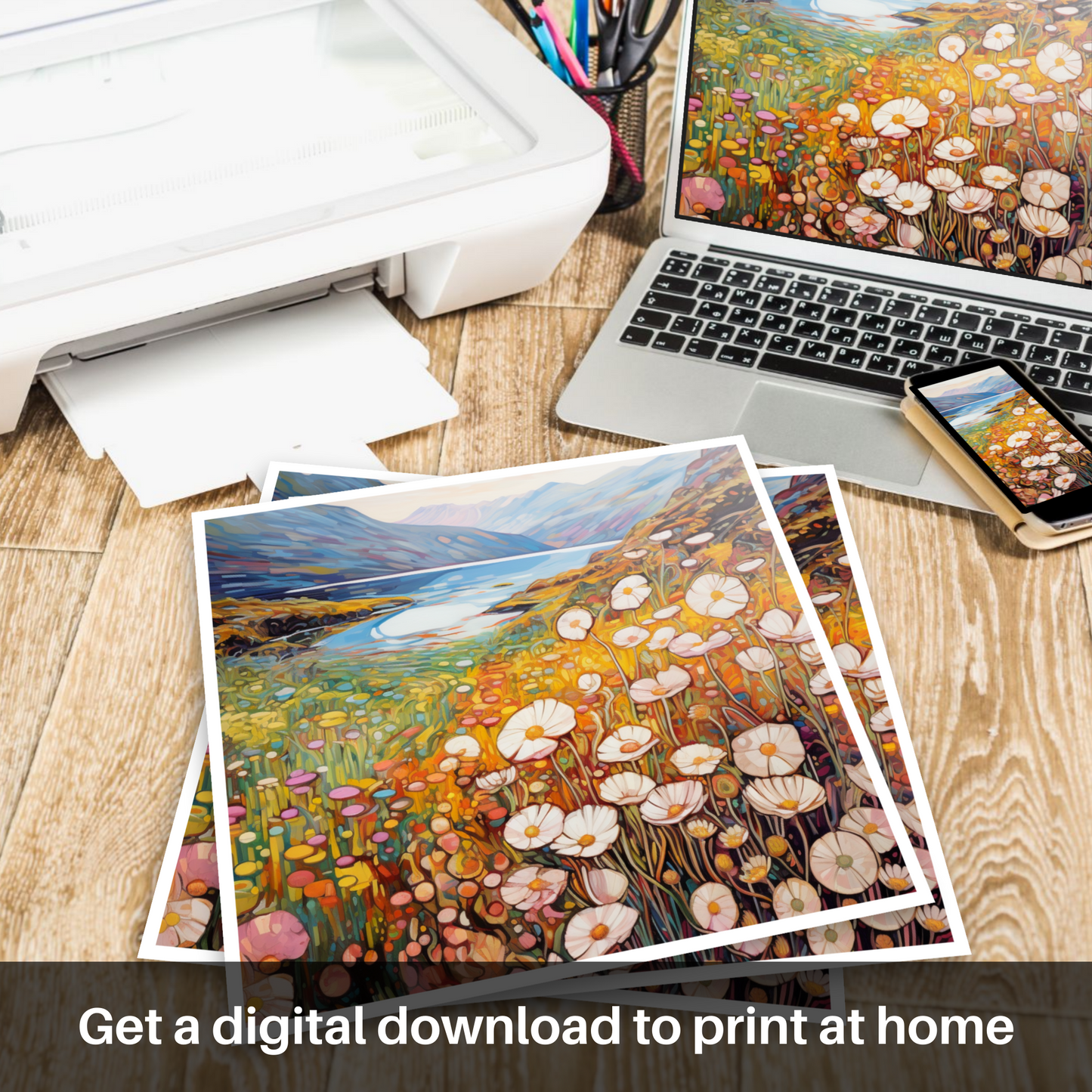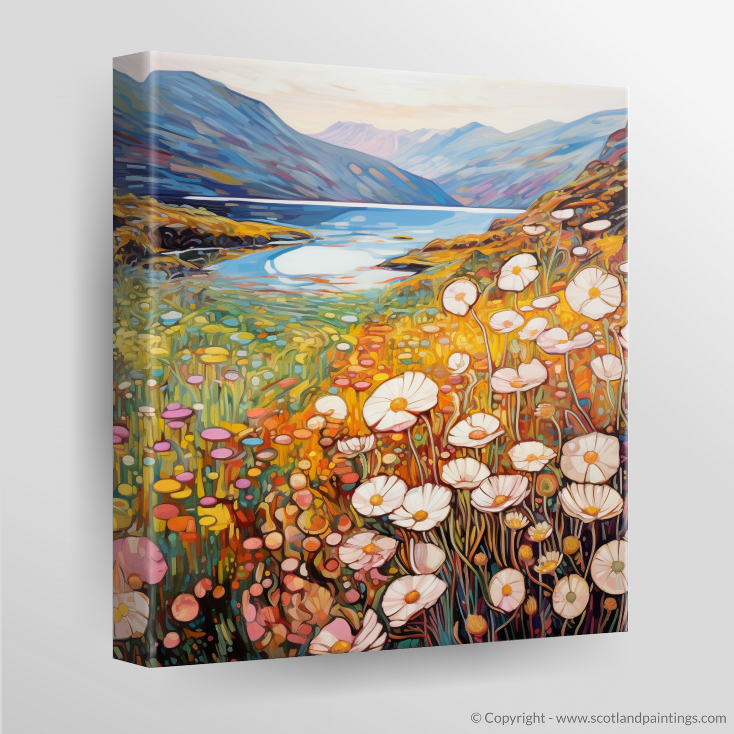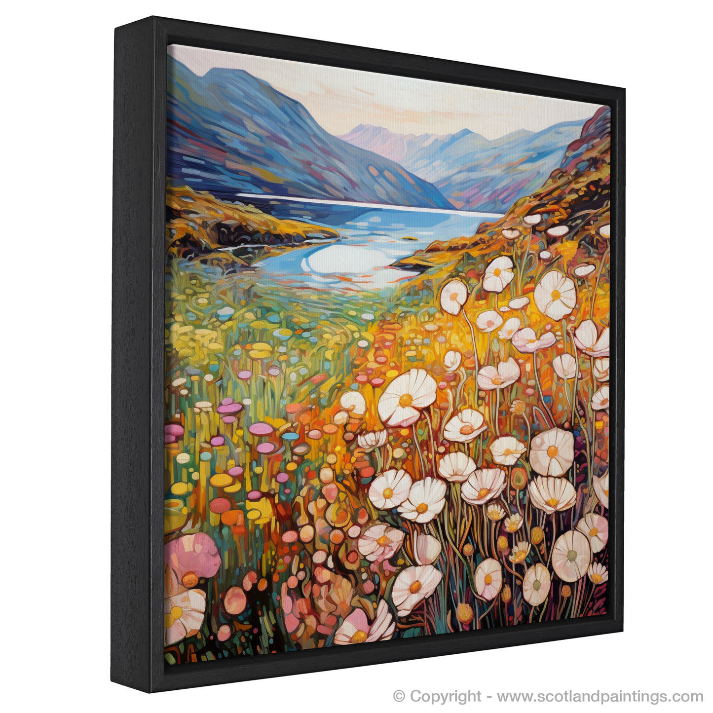 Awash with the warm hues of a setting sun, this enchanting print captures the essence of Glencoe's wild beauty as if through the eyes of a dreamer. Graceful thrifty flowers, their white and pink petals delicate as porcelain, dance in the foreground, encapsulated by the inviting tendrils of Art Nouveau. Each bloom's organic form contrasts harmoniously against the towering majesty of the craggy overlooks in the distance.
