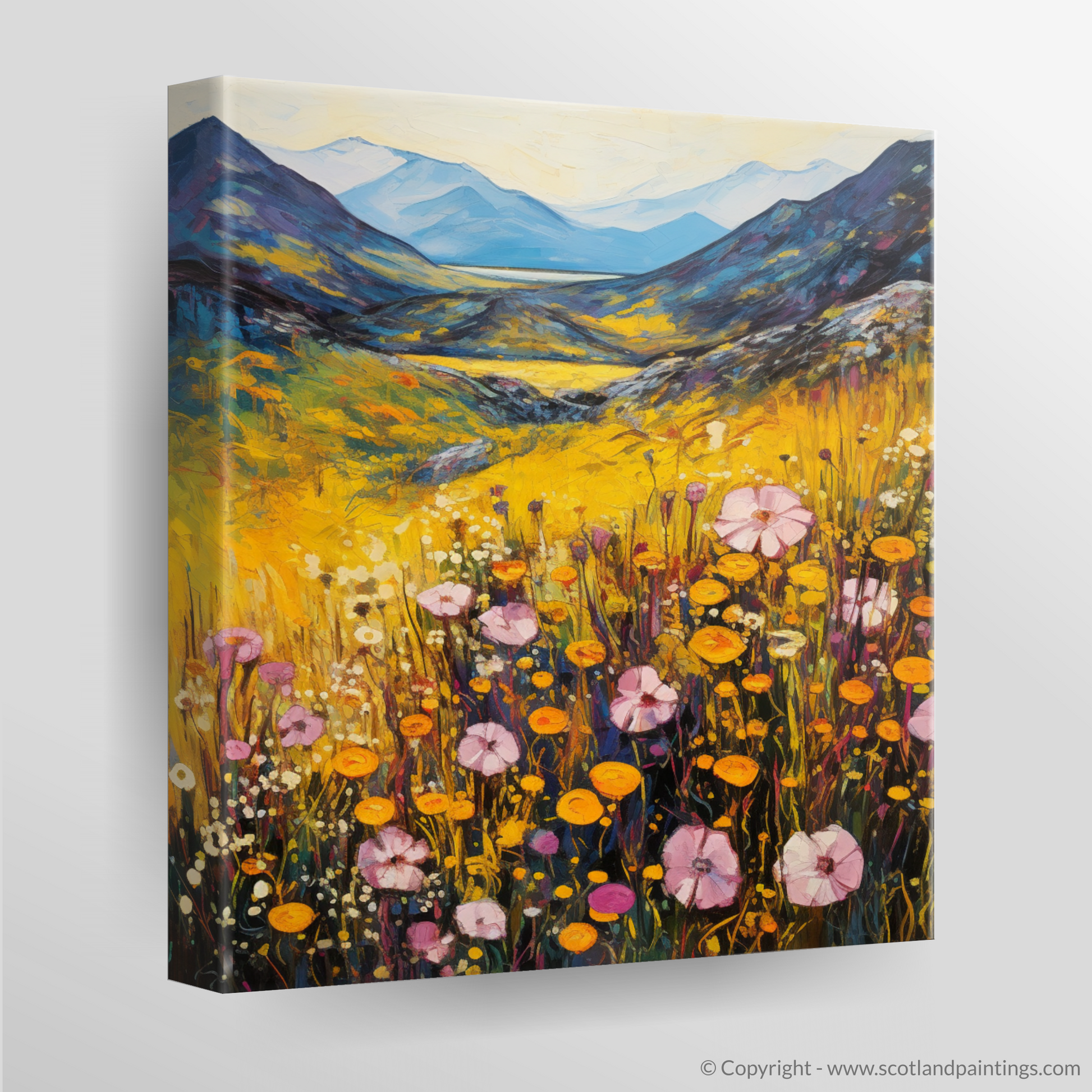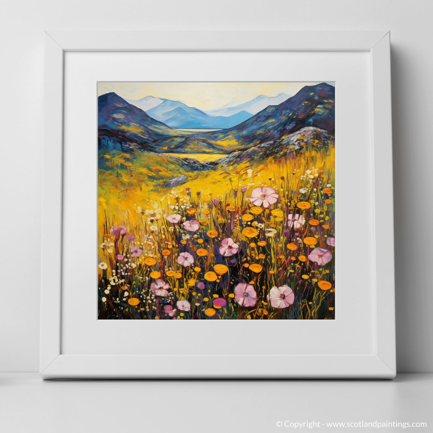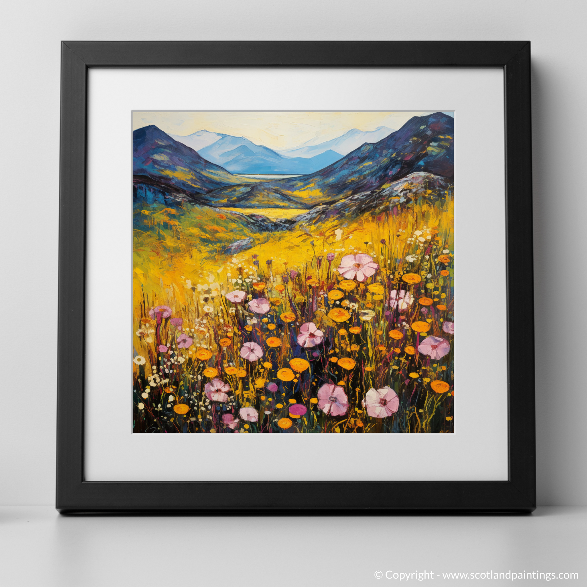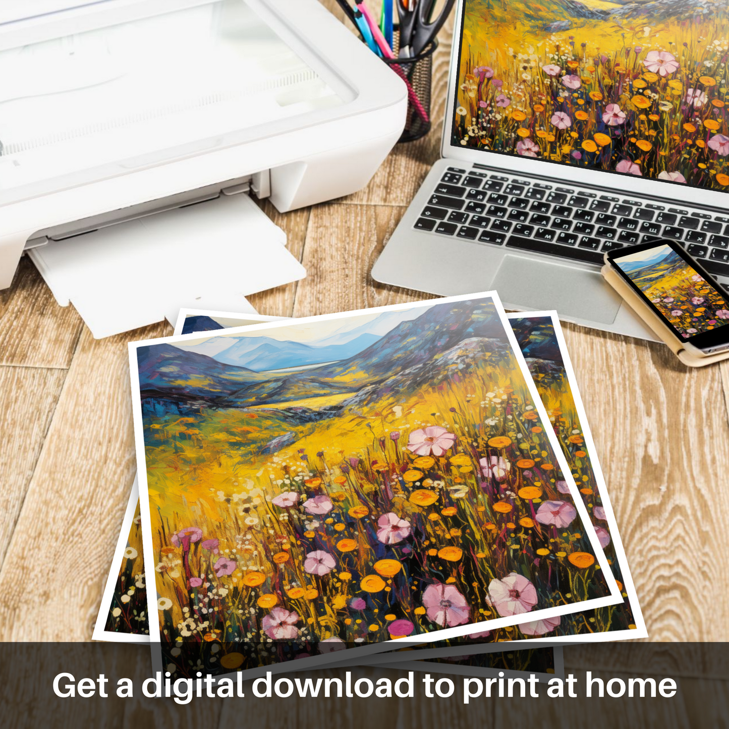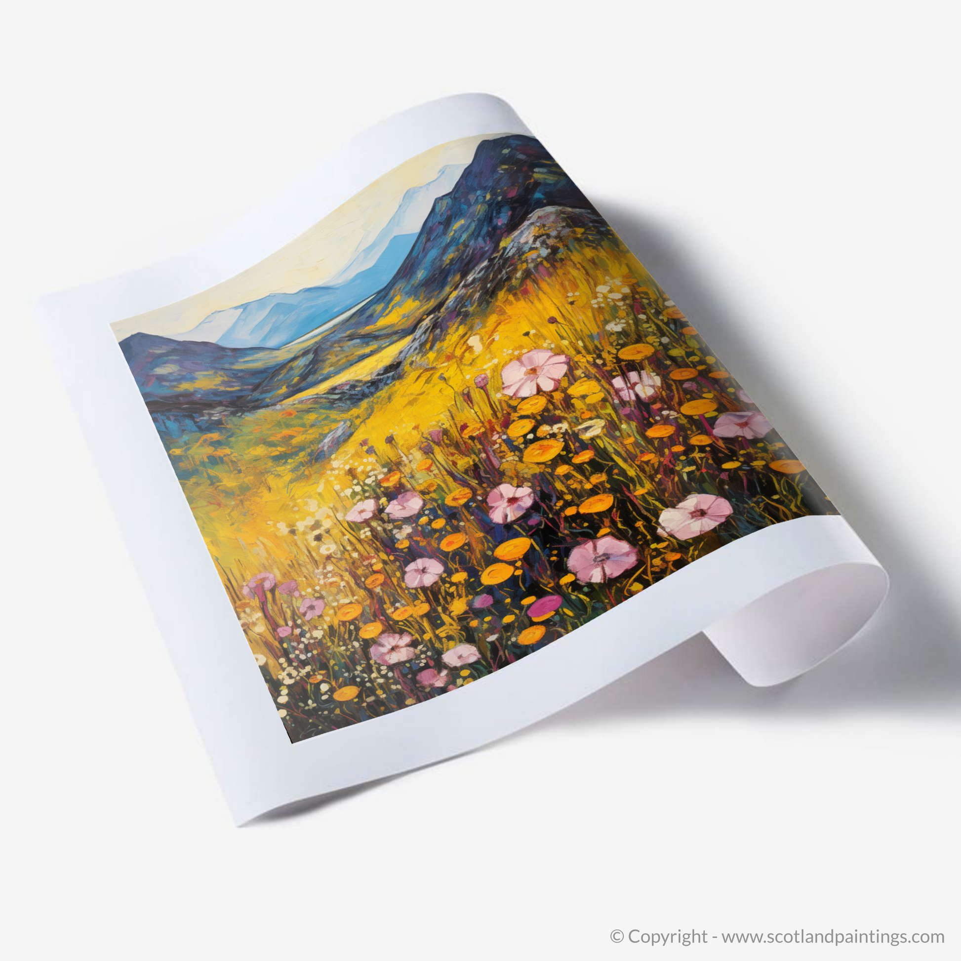 Immerse yourself in the breathtaking beauty of the Scottish Highlands with our exclusive print, a splendid tribute to the wild flora that thrives in the heart of Glencoe. This art piece captures the untamed essence of nature's resplendence with a captivating palette of vibrant yellows, soothing purples, and touches of pastel pinks, reminiscent of the Art Nouveau period's penchant for fluid, organic forms and bold colours.