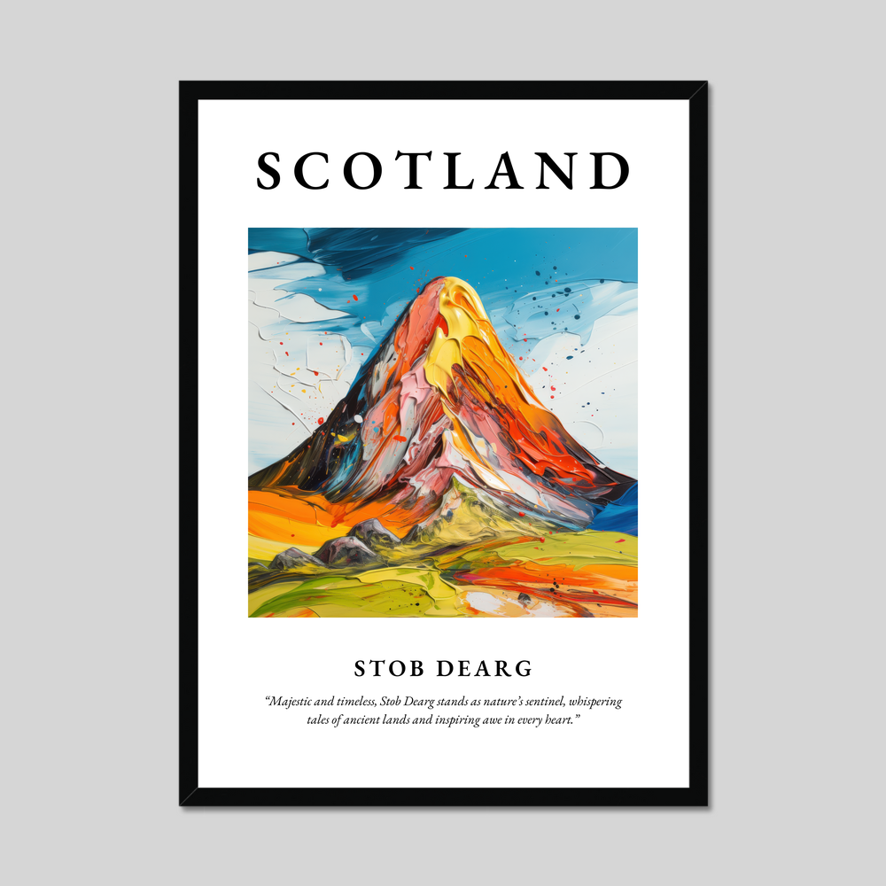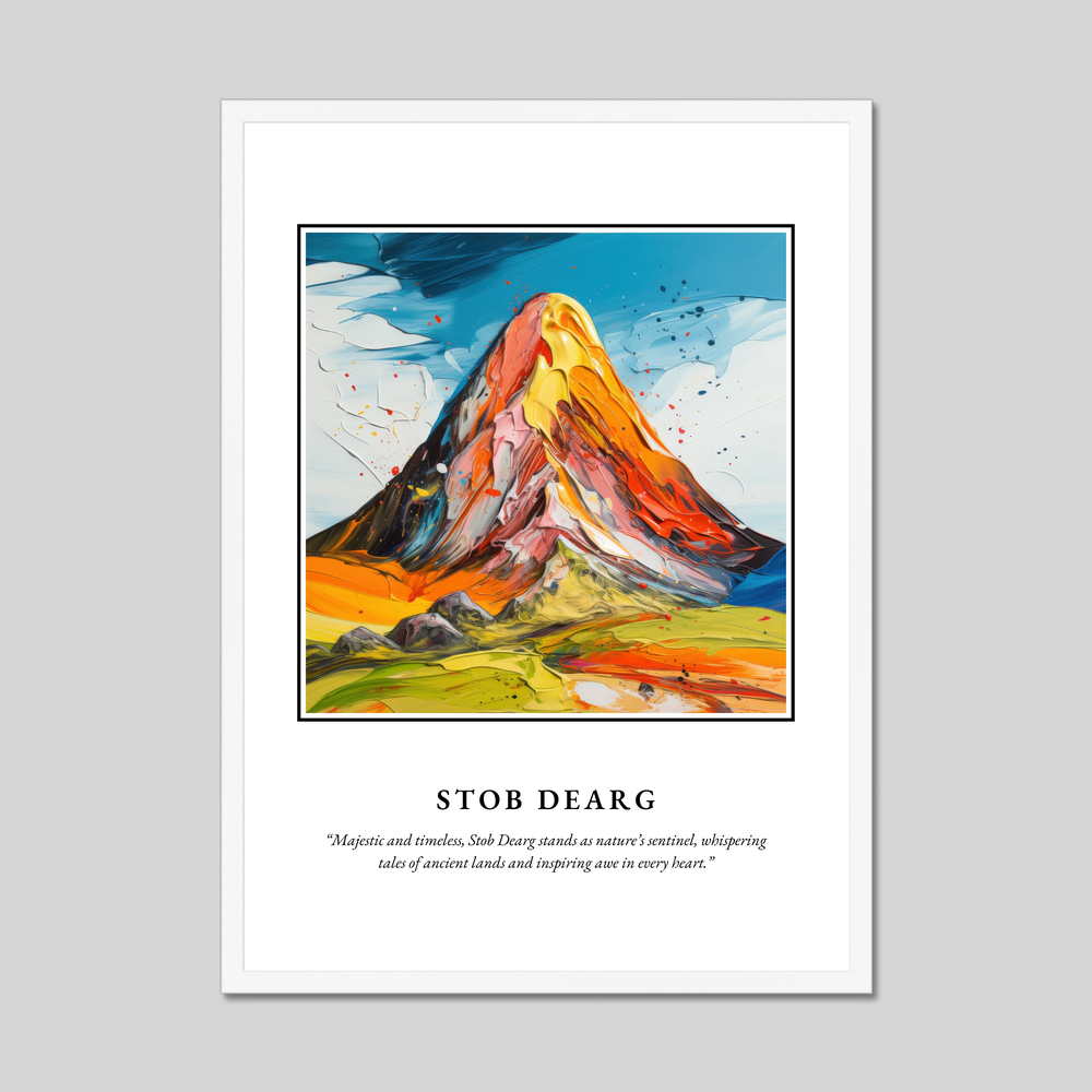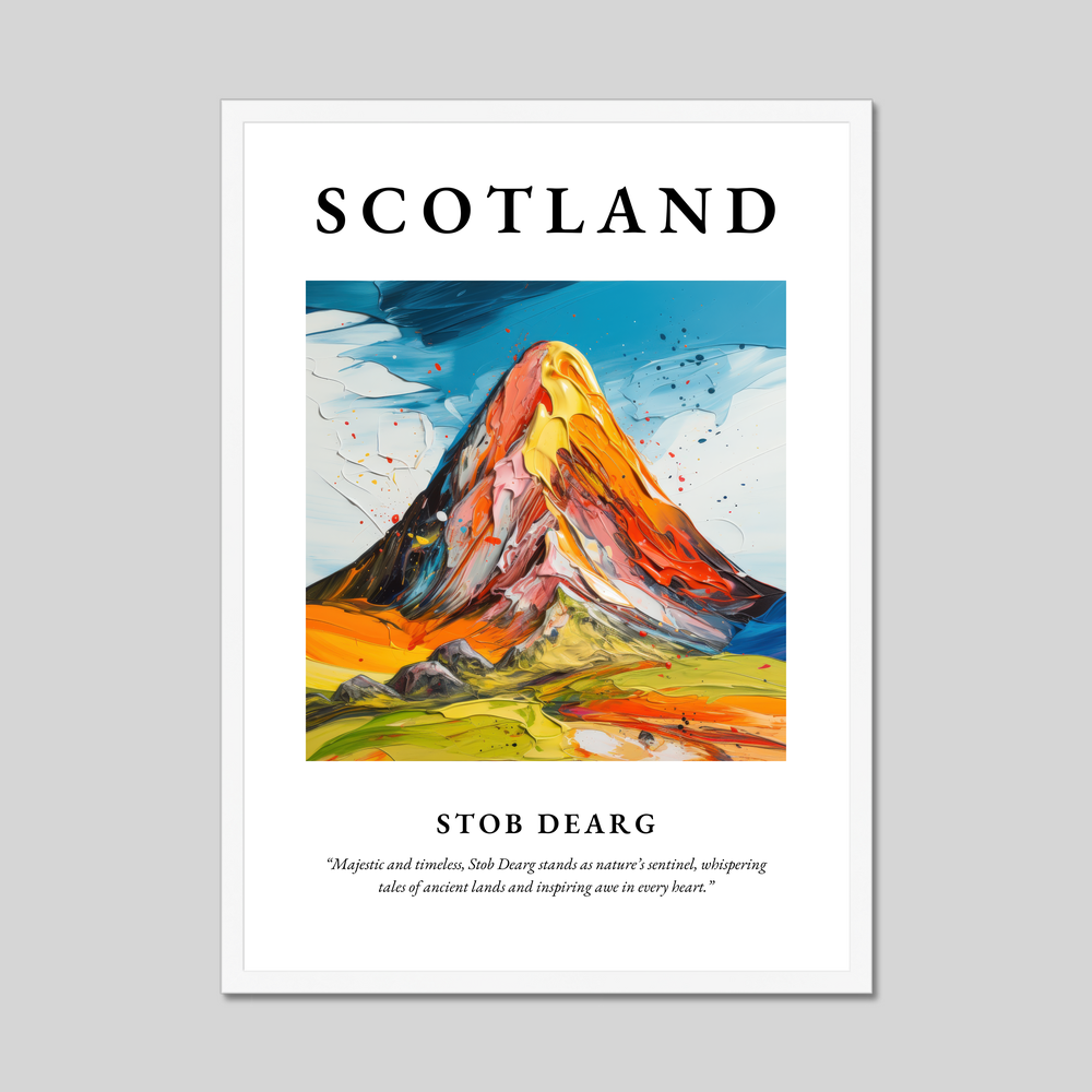 Available in a sophisticated black, crisp white, or natural wood-effect frame, the poster complements a variety of home décors. The bold “SCOTLAND” at the top leads into an exuberant rendition of Stob Dearg, brought to life with a palette of dynamic colours and energetic strokes. Below the artwork, the words “Majestic and timeless, Stob Dearg stands as nature’s sentinel, whispering tales of ancient lands and inspiring awe in every heart” evoke the very essence of this breathtaking landmark.