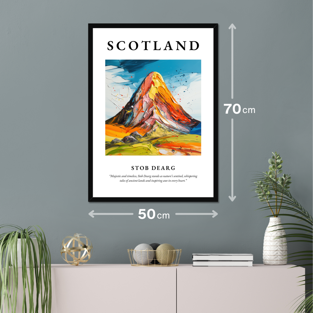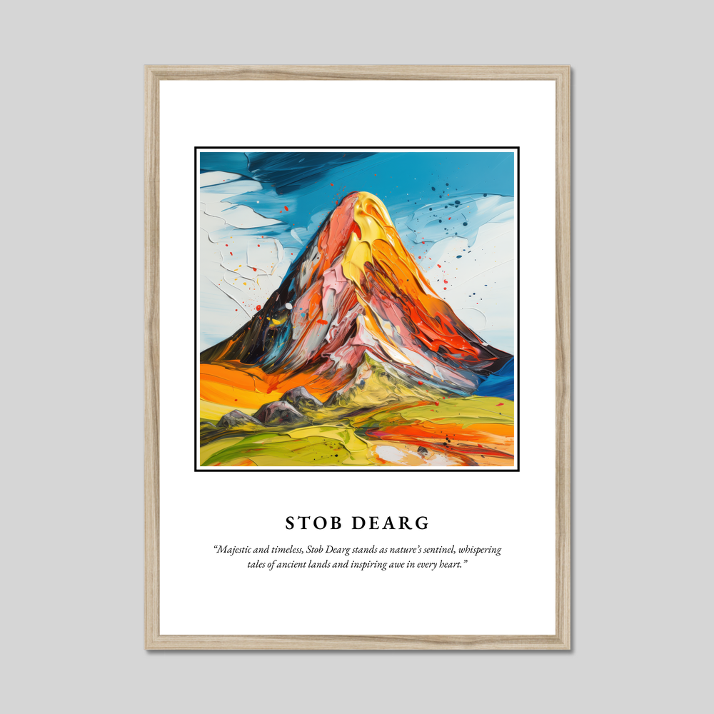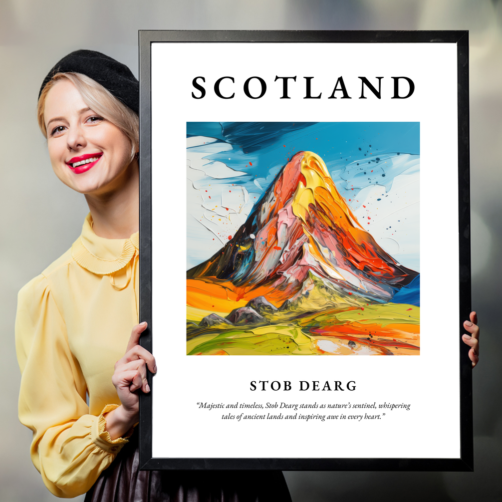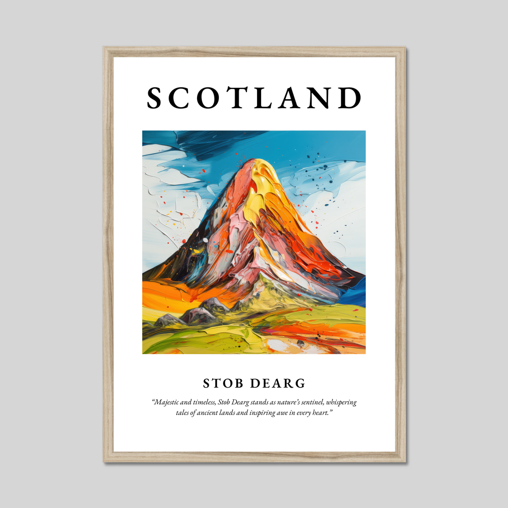 Available in a sophisticated black, crisp white, or natural wood-effect frame, the poster complements a variety of home décors. The bold “SCOTLAND” at the top leads into an exuberant rendition of Stob Dearg, brought to life with a palette of dynamic colours and energetic strokes. Below the artwork, the words “Majestic and timeless, Stob Dearg stands as nature’s sentinel, whispering tales of ancient lands and inspiring awe in every heart” evoke the very essence of this breathtaking landmark.