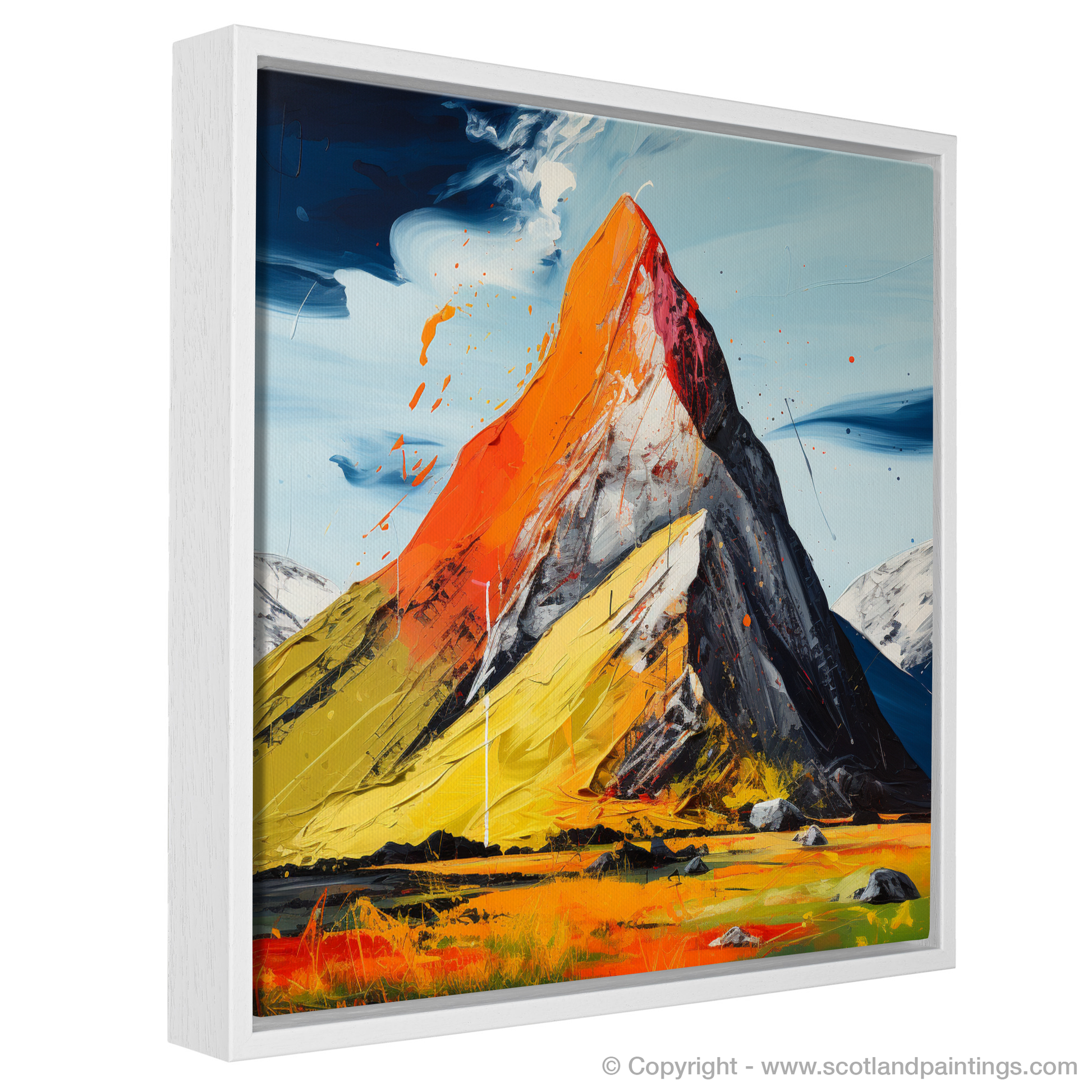 The canvas teems with energy, featuring a sky awash in deep blues and stark whites, fermenting a brewing sense of drama above the mountain. At the forefront, the majestic Stob Dearg soars, rendered in fiery oranges and deep crimsons that ignite the peak as if kissed by the setting sun's final blaze of glory. Splatterings of paint suggest an unrestrained freedom, as if reflecting the wild, untamed spirit of the highland landscapes.