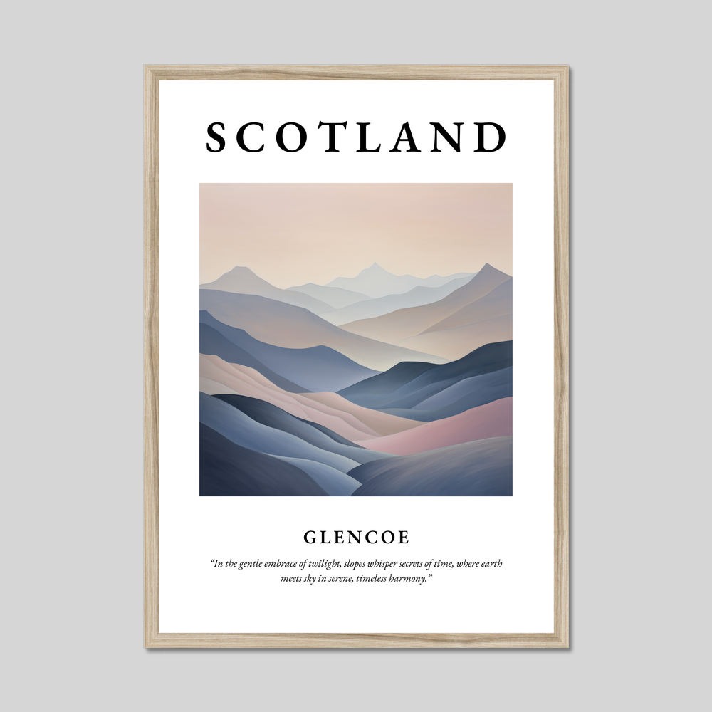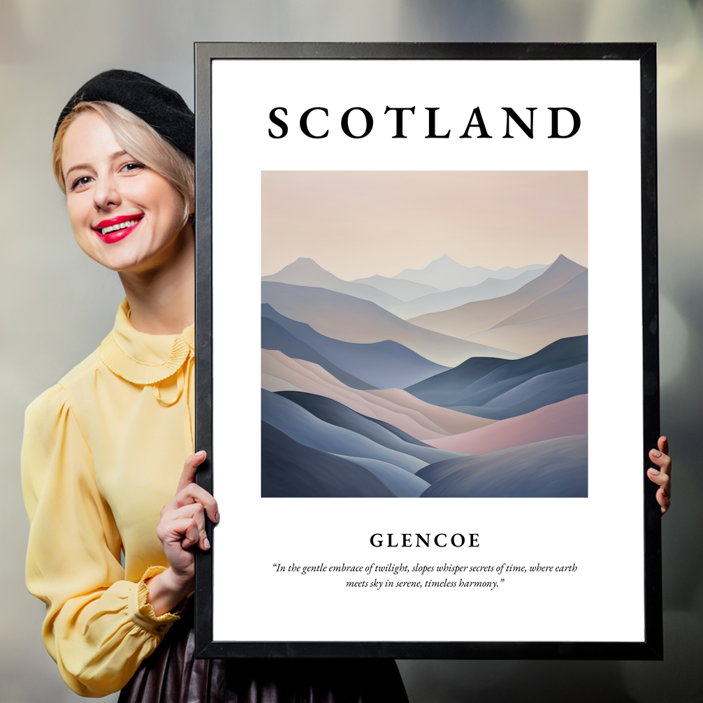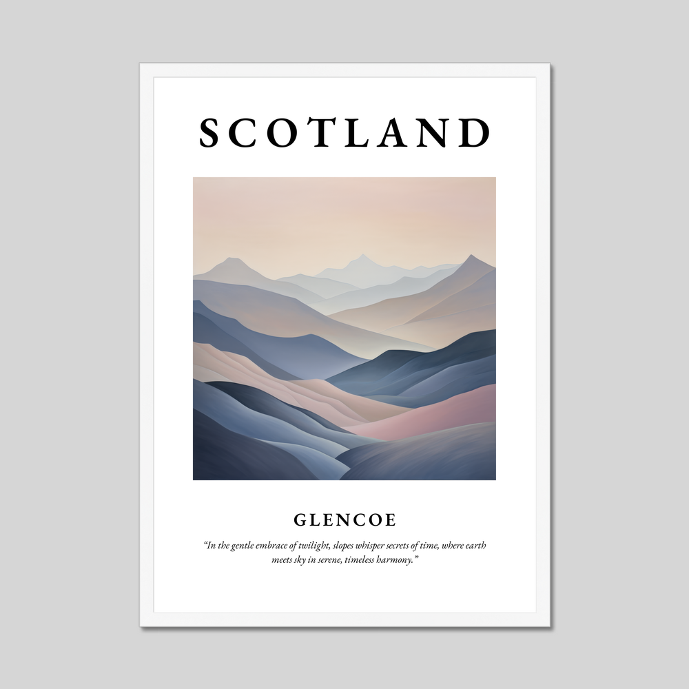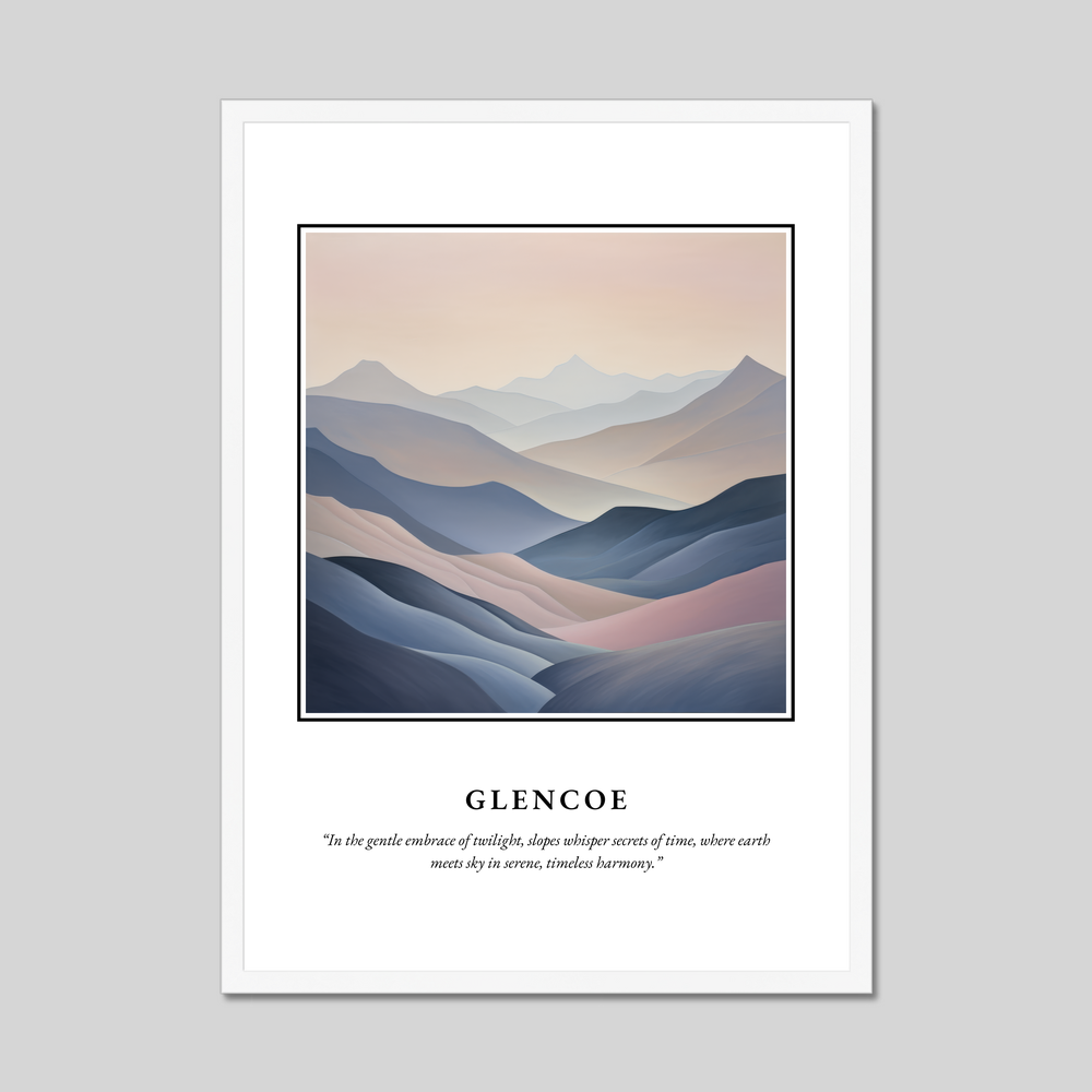 Adorned with the bold caption "SCOTLAND" atop, the centerpiece of this artwork is an abstract depiction of Glencoe's sweeping landscapes. Its soft, flowing lines and a palette of serene pastels seamlessly capture the tranquil majesty of the Highlands. Perfect for those with an appreciation for abstract art or a personal connection to Scotland, this print serves as a gateway to the enchanting world beyond its borders.
