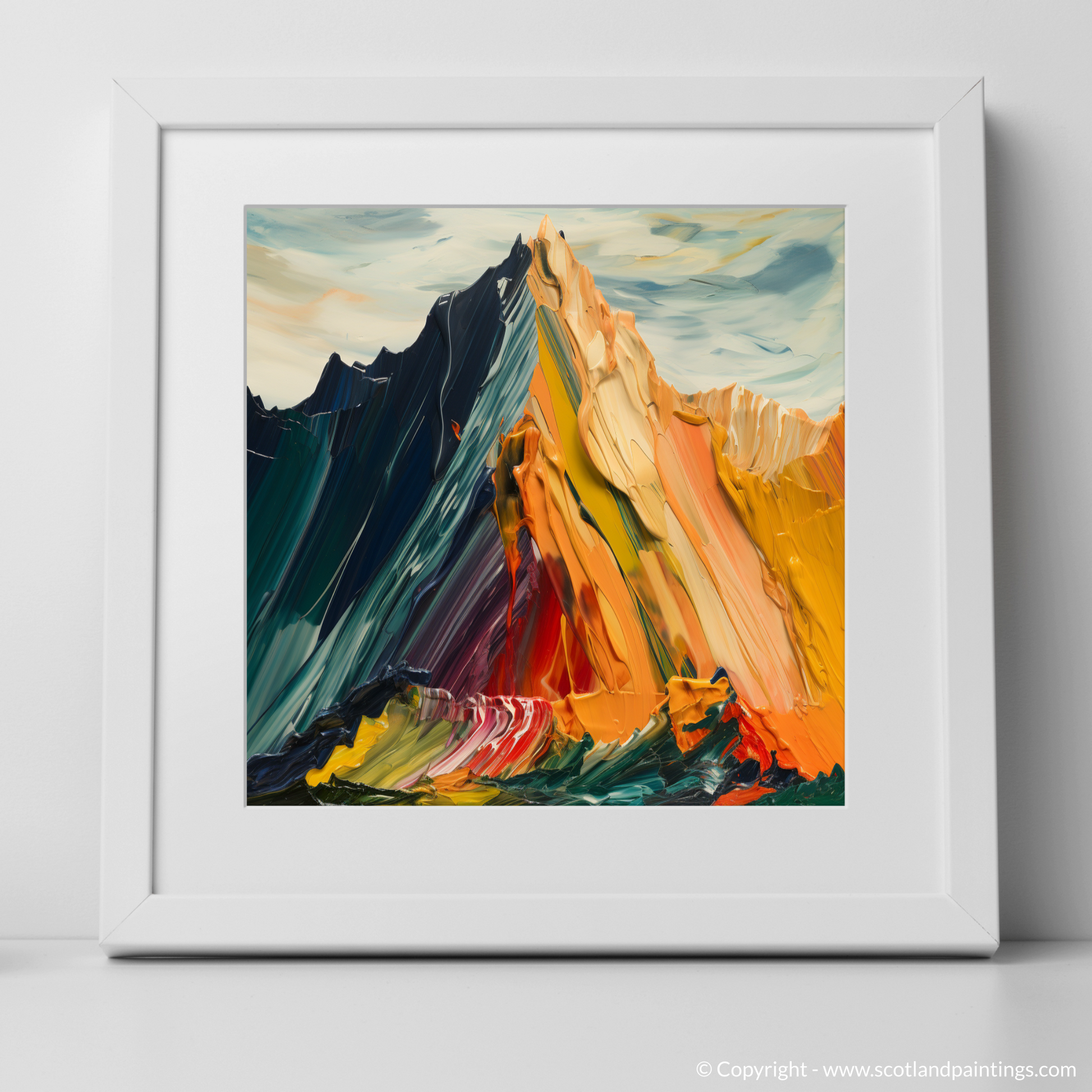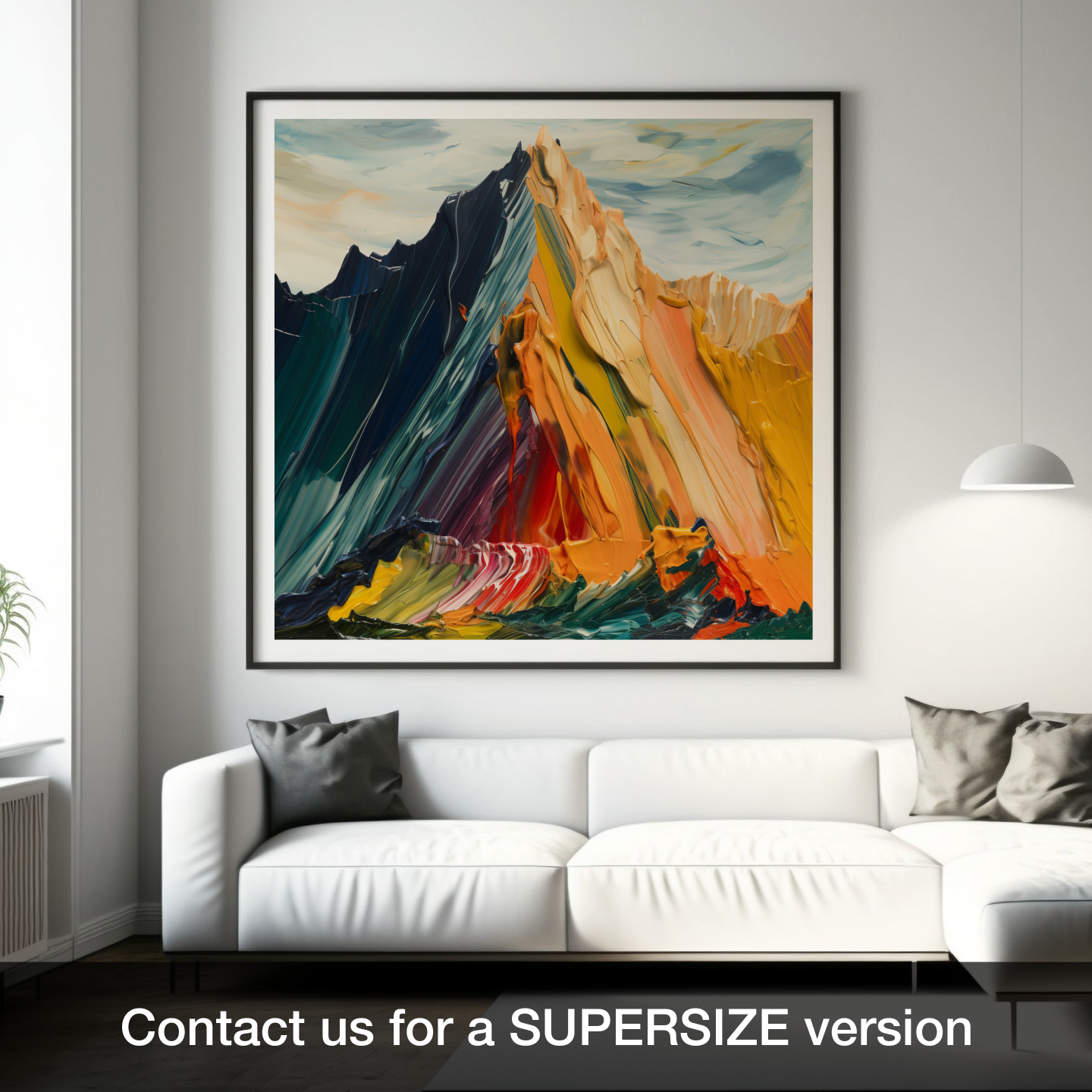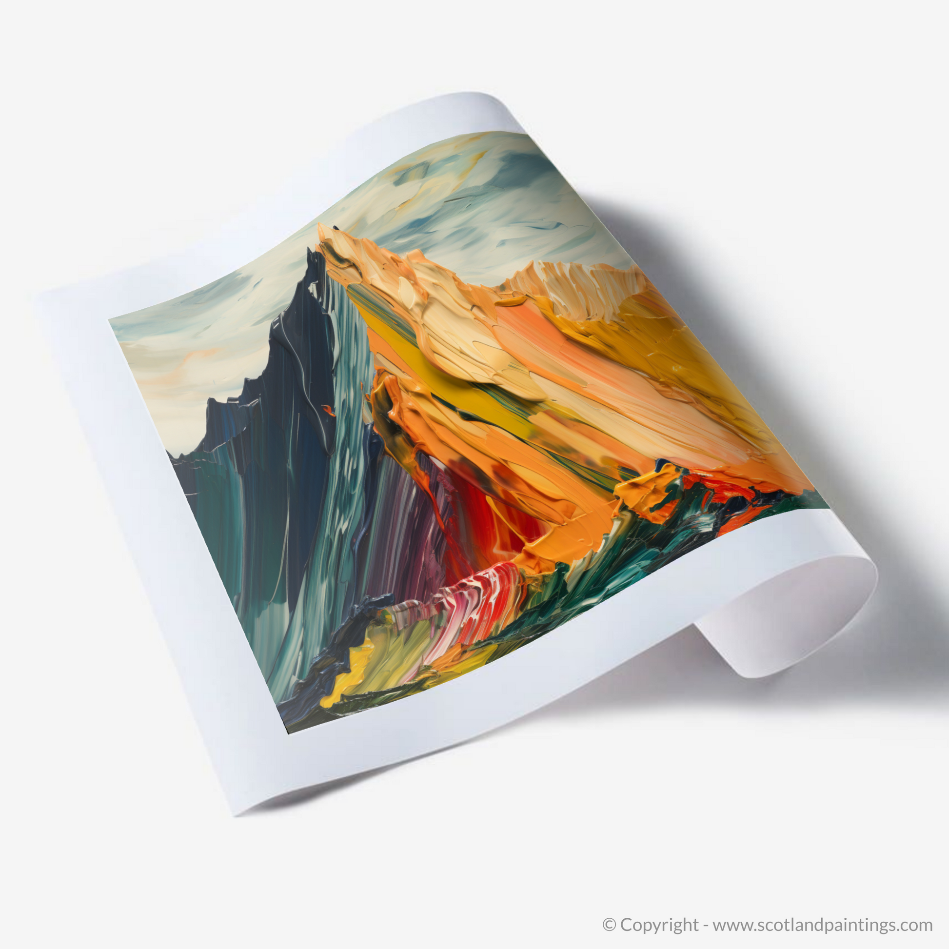 Immerse yourself in the vibrant splendour of the Scottish Munros with this captivating print that celebrates the majestic Stob Binnein. The palette employed here is a dramatic departure from the typical greens and browns associated with mountain landscapes. Bold swathes of electric blues, deep navy and streaks of white suggest the rugged cliff faces and snow-streaked summits of this towering peak. Juxtaposing these cooler tones, the artwork erupts with fiery reds, burnt oranges, and golden yellows, invoking an otherworldly glow akin to the most splendid of sunsets gracing the highland skies.