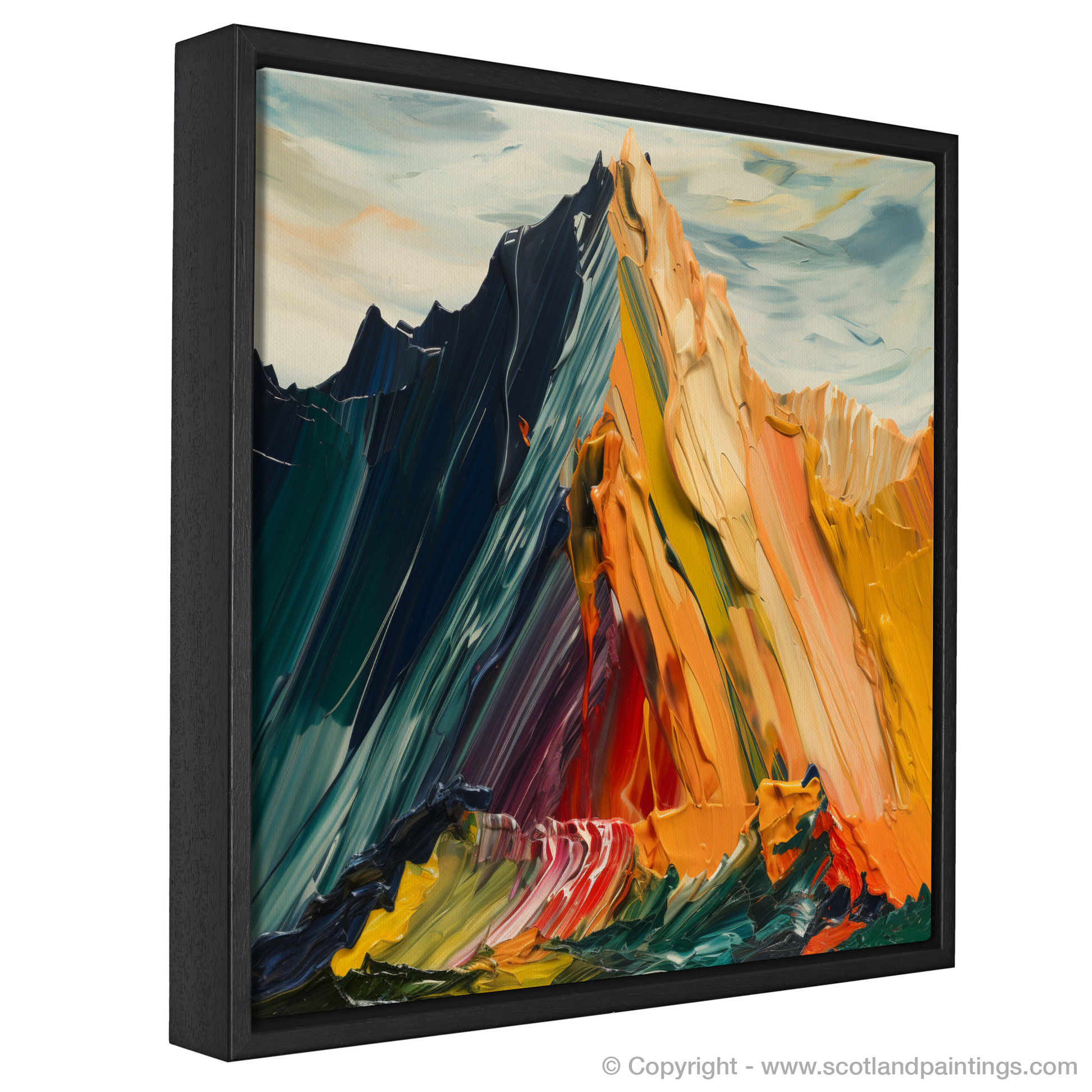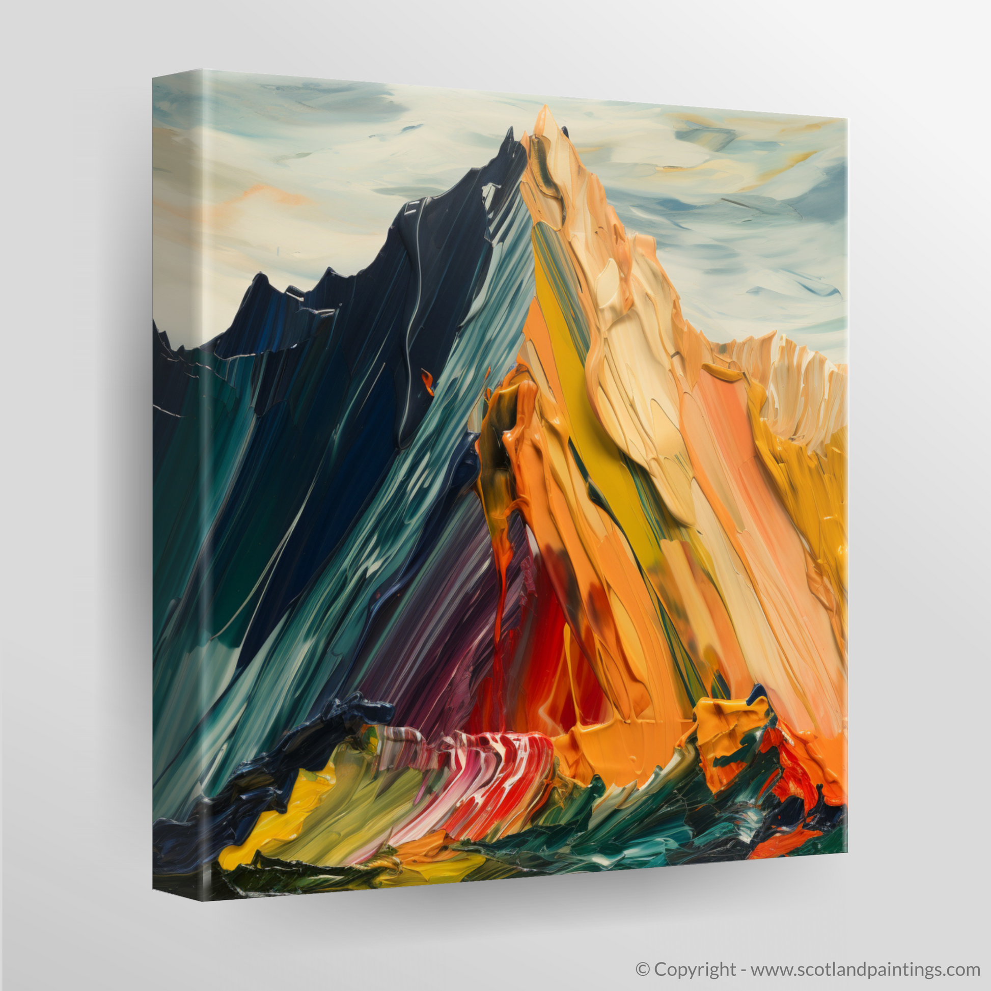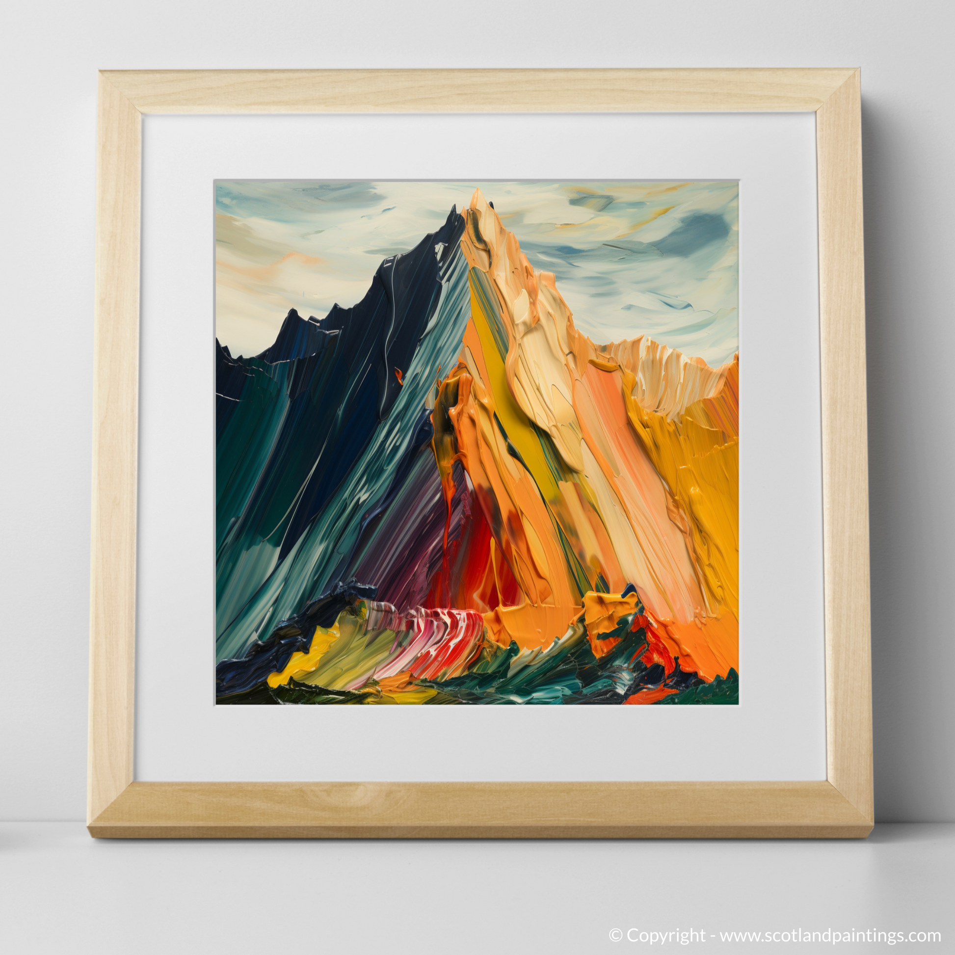 Immerse yourself in the vibrant splendour of the Scottish Munros with this captivating print that celebrates the majestic Stob Binnein. The palette employed here is a dramatic departure from the typical greens and browns associated with mountain landscapes. Bold swathes of electric blues, deep navy and streaks of white suggest the rugged cliff faces and snow-streaked summits of this towering peak. Juxtaposing these cooler tones, the artwork erupts with fiery reds, burnt oranges, and golden yellows, invoking an otherworldly glow akin to the most splendid of sunsets gracing the highland skies.