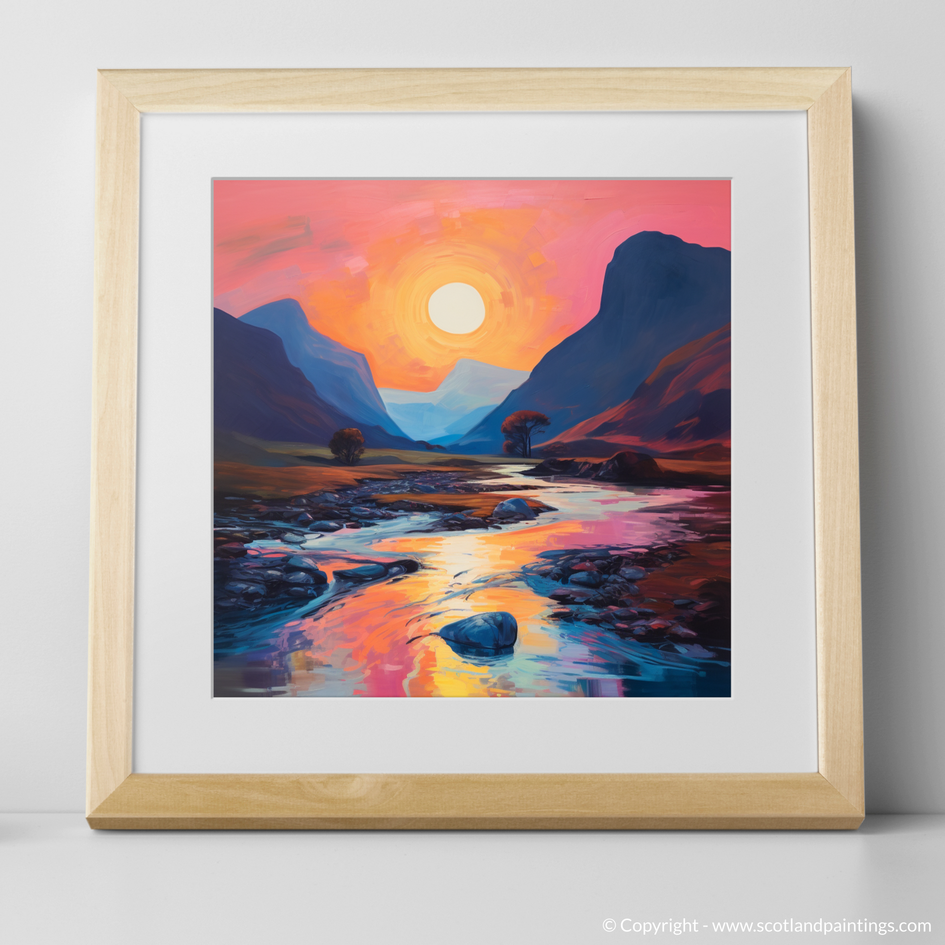 Immerse your space in the vibrant hues and dramatic landscape of the Scottish Highlands with our exquisite print inspired by the ethereal beauty of Dusk over River Coe in Glencoe. Let the swirling, vivacious tones of fuchsia, bright orange, and purples in the sunset sky captivate you, as they contrast the serene blues and greys that nestle in the mountain’s silhouette and the delicate mist rising in the valley.