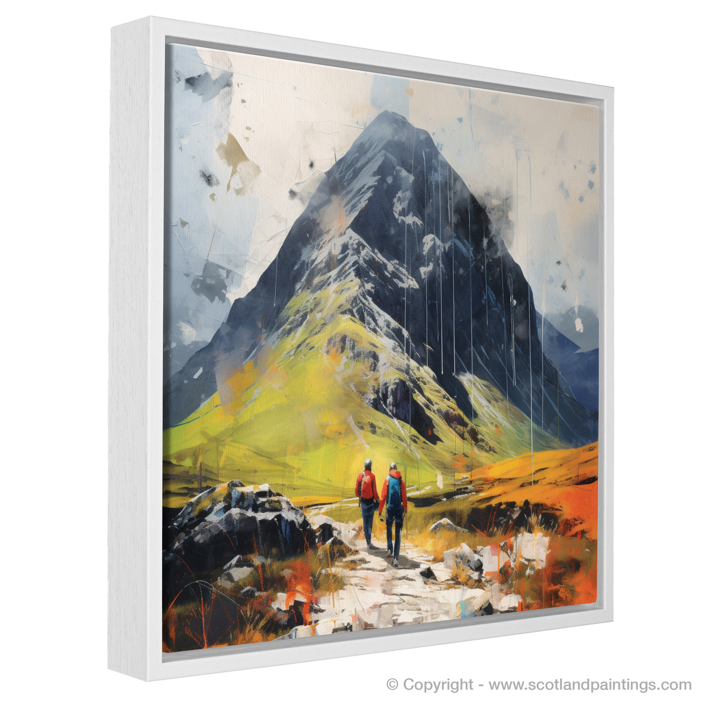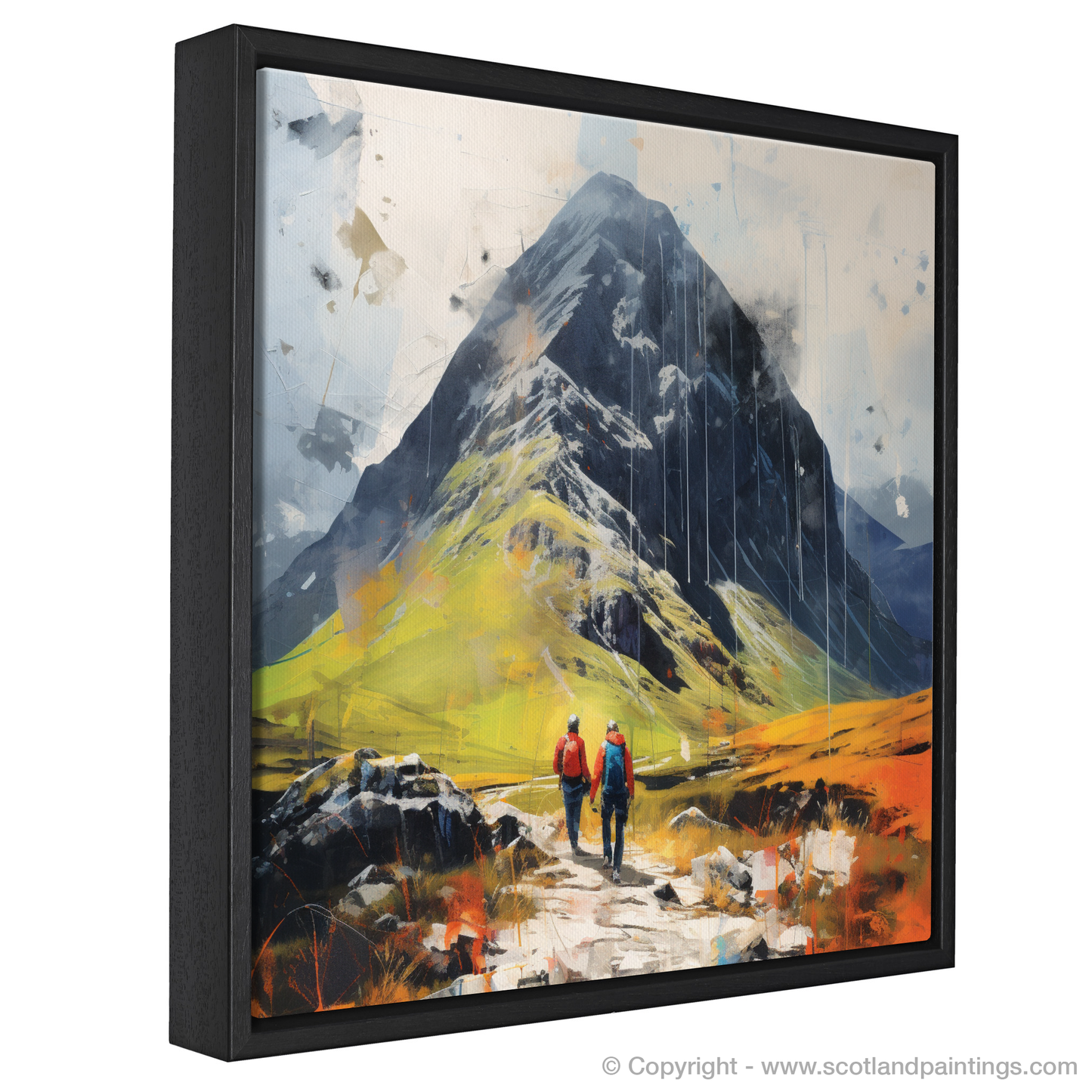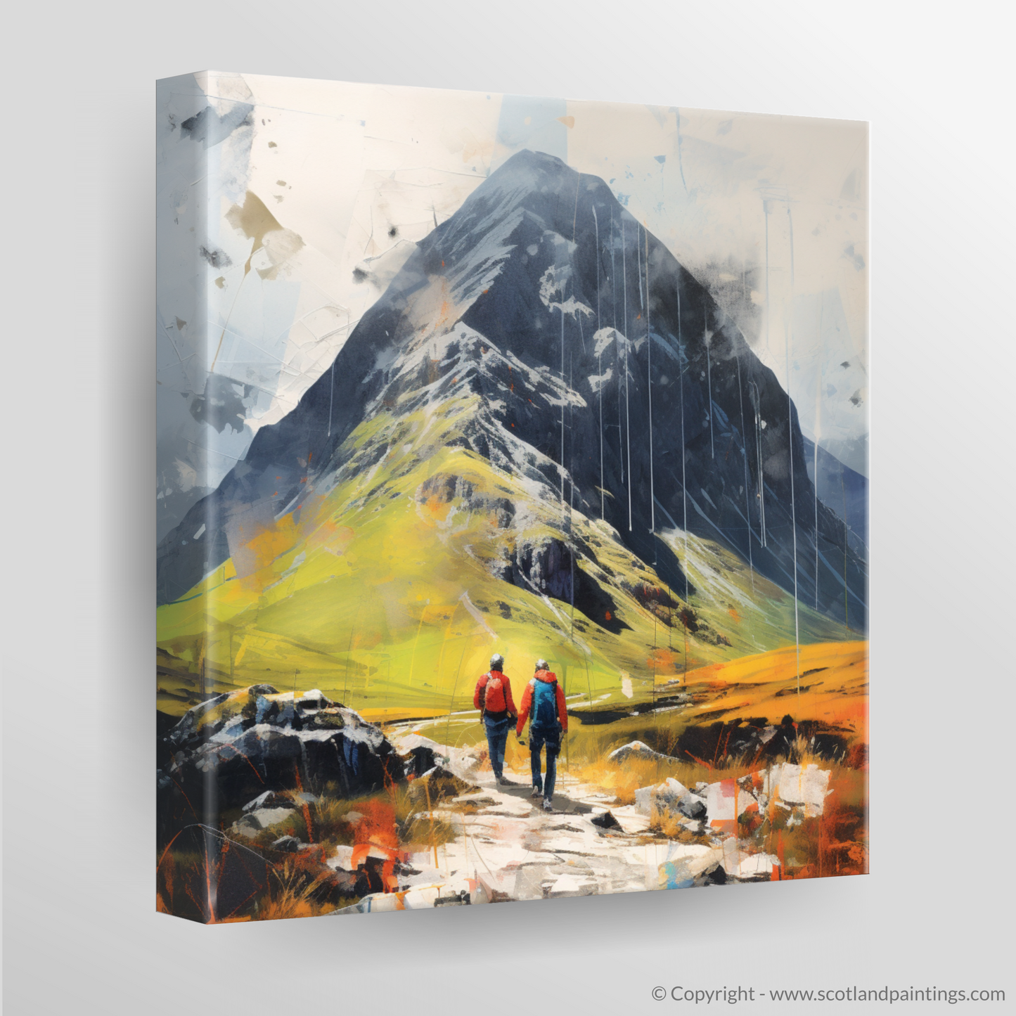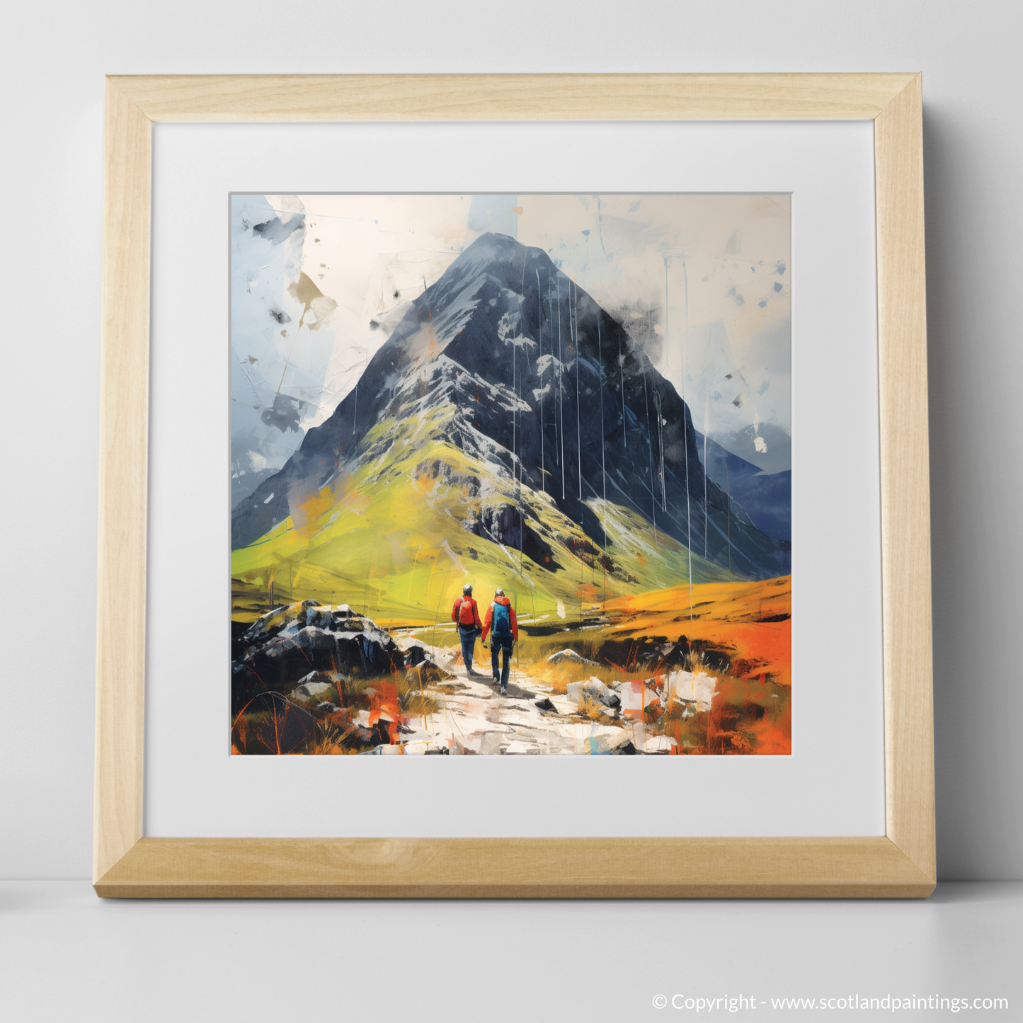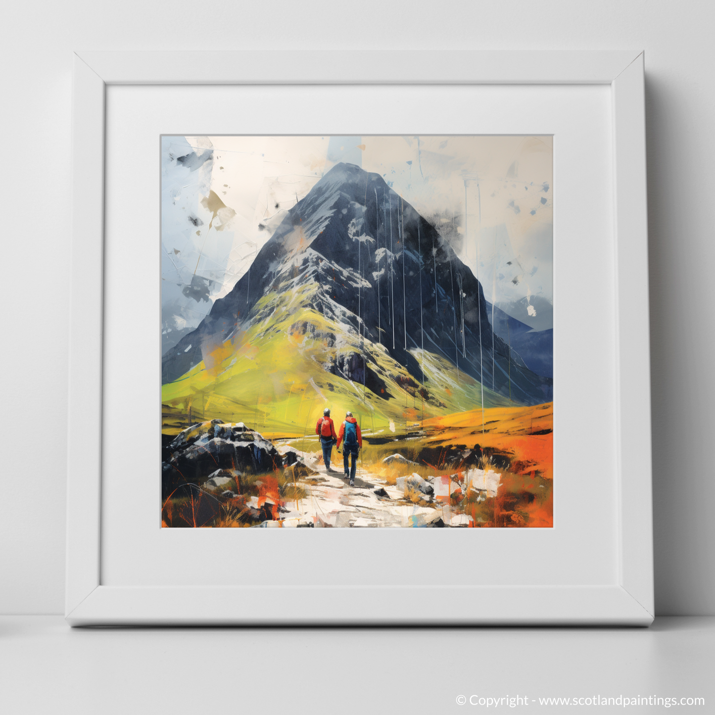 In the foreground, a pair of hikers, clad in striking red and blue, offer a human element and scale to the scene. They traverse the earth-toned path that weaves through the artwork, marked by a sense of movement and exploration. Their journey seems both solitary and universal, a quiet nod to the spirit of adventure that Glencoe ignites in the hearts of all who wander there.