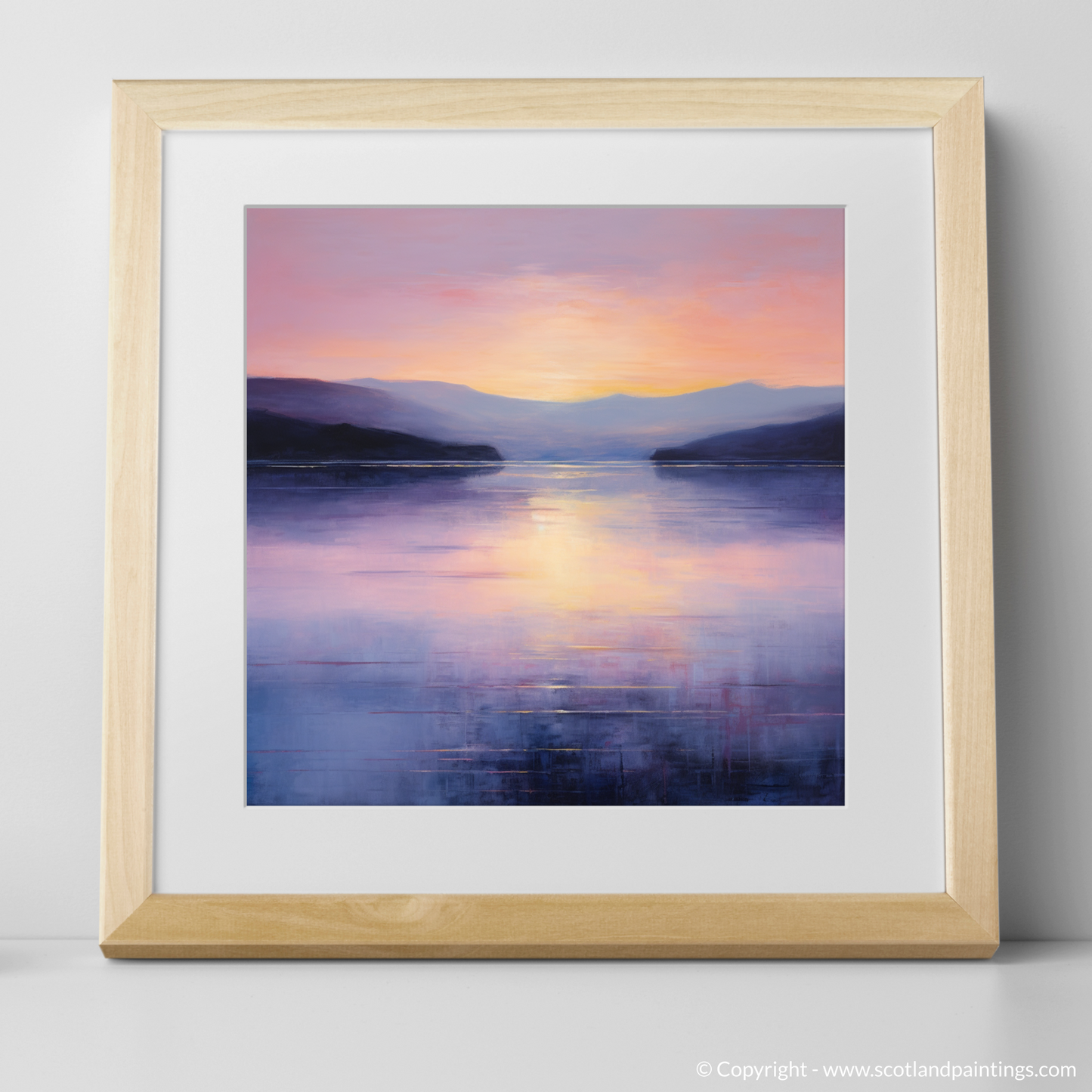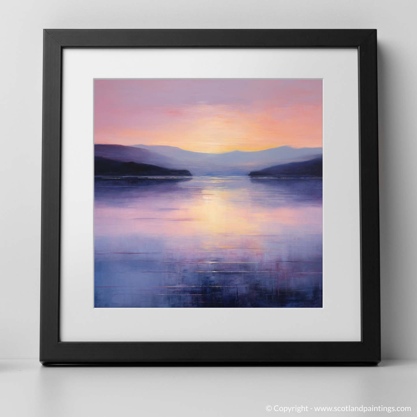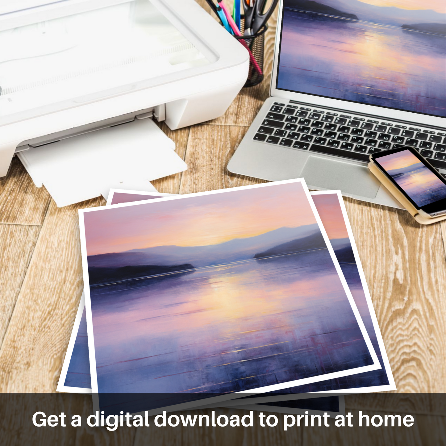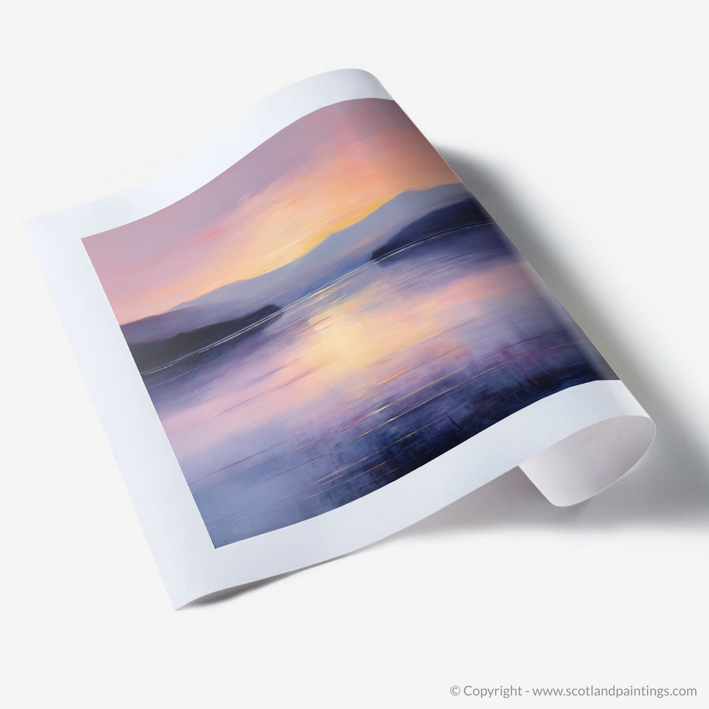 Captivate your senses with this evocative abstract rendition of Loch Lomond at twilight. The print exudes tranquillity, with an ethereal palette of dusky purples, warm pinks, and serene blues that seem to whisper the calm of a fading day. Delicate brushstrokes dance across the canvas, creating a harmonious interplay of colour and light that mirrors the stillness of the water's surface.