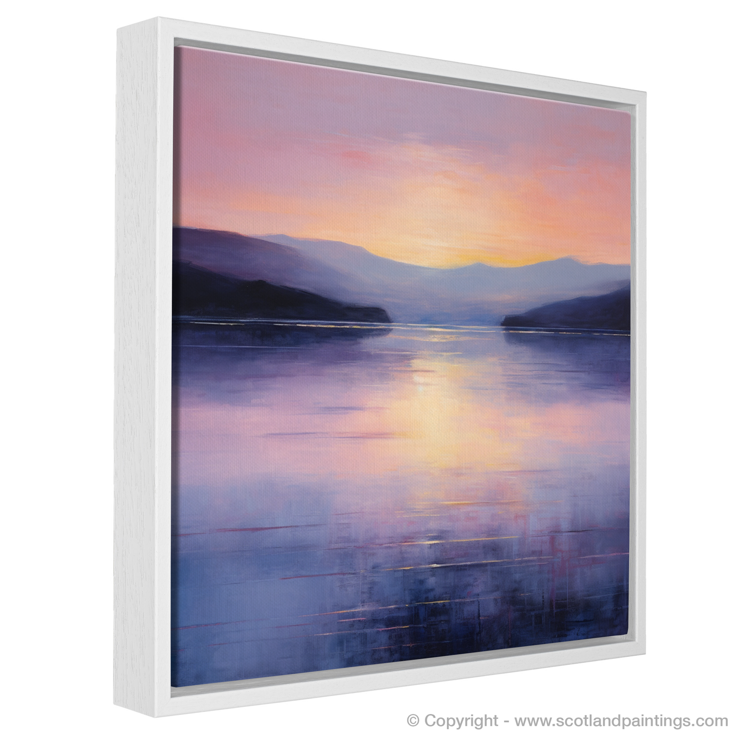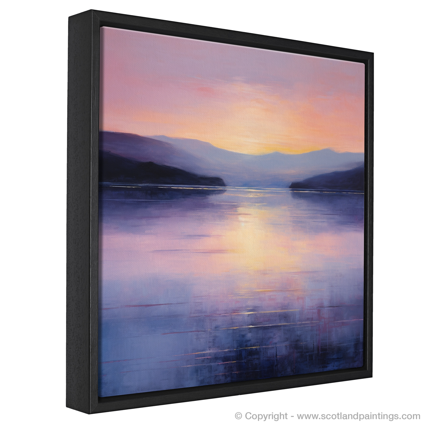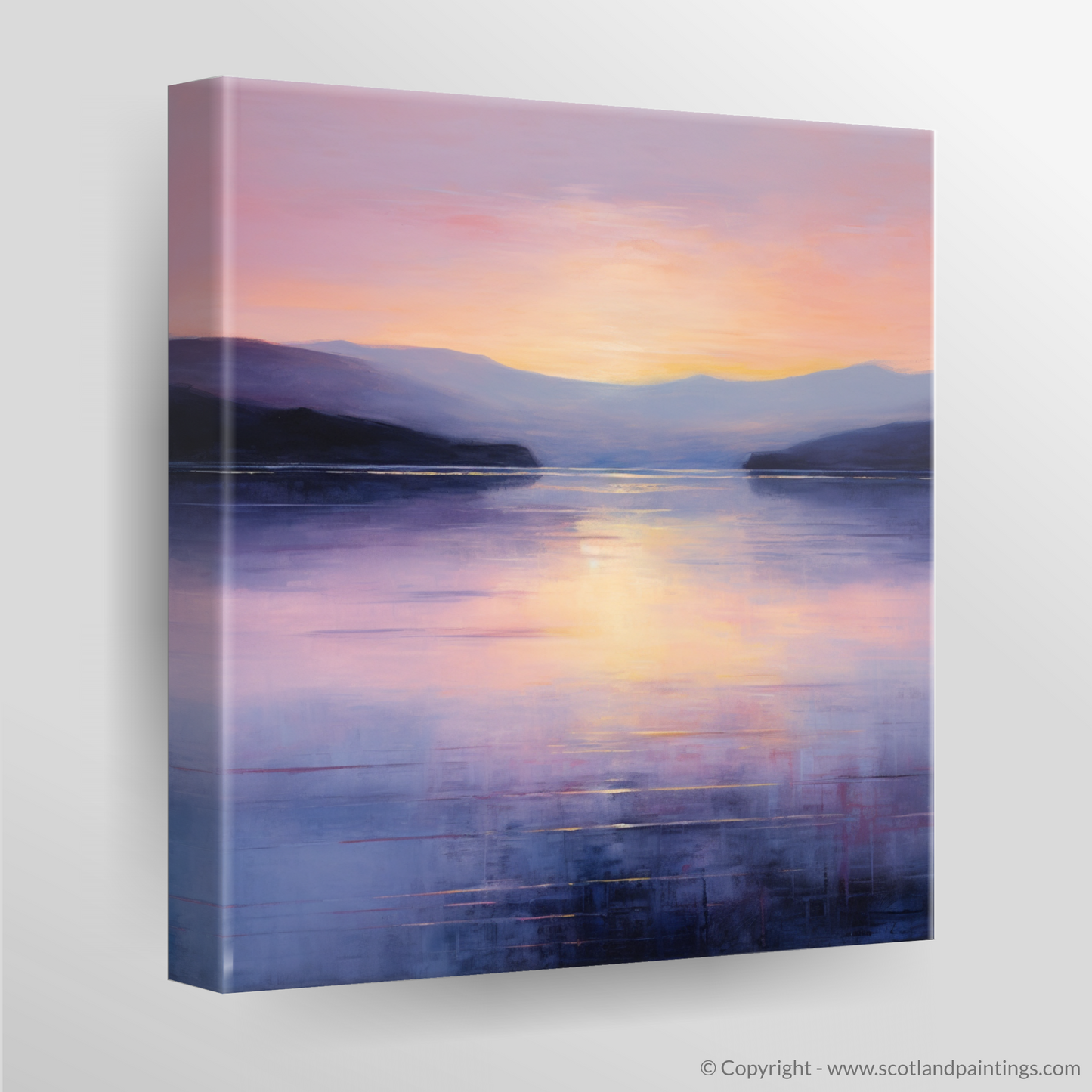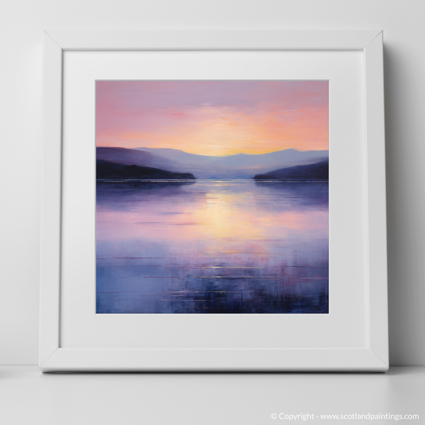Captivate your senses with this evocative abstract rendition of Loch Lomond at twilight. The print exudes tranquillity, with an ethereal palette of dusky purples, warm pinks, and serene blues that seem to whisper the calm of a fading day. Delicate brushstrokes dance across the canvas, creating a harmonious interplay of colour and light that mirrors the stillness of the water's surface.