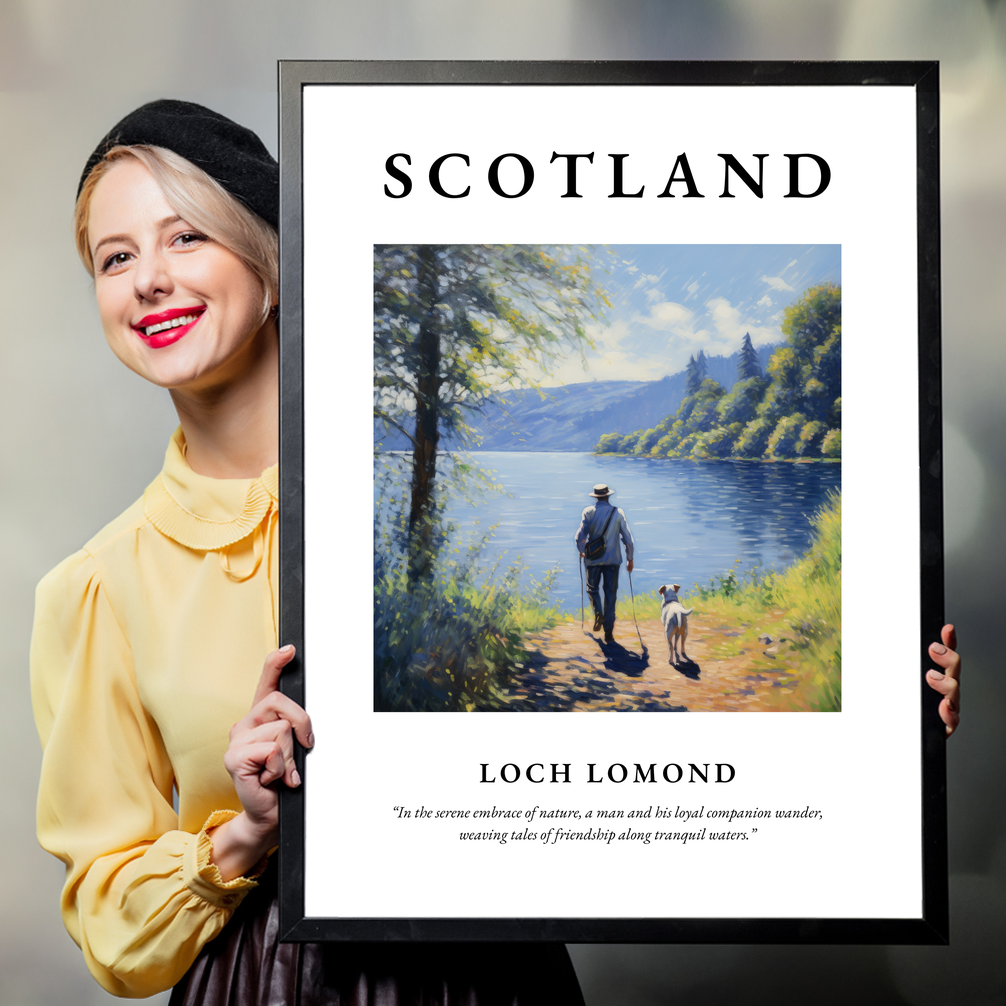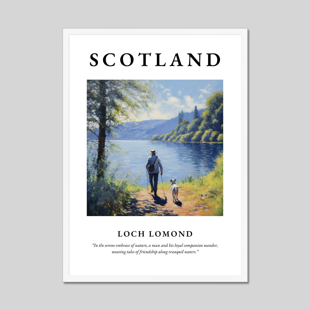 The poster's design features the evocative word “SCOTLAND” displayed prominently, inviting you into the heart of adventure. Below, an exquisite Impressionist painting of Loch Lomond captures a tranquil moment where a man and his loyal companion stroll along the lapping shores. The text beneath the painting reads, “In the serene embrace of nature, a man and his loyal companion wander, weaving tales of friendship along tranquil waters.” This romantic imagery speaks to anyone who cherishes the bond between humans and nature or has fond memories of Lake Lomond. The Impressionist style infuses the scene with vibrant colours and delicate brushstrokes, creating a sense of movement and life that transports viewers right to the loch's edge.