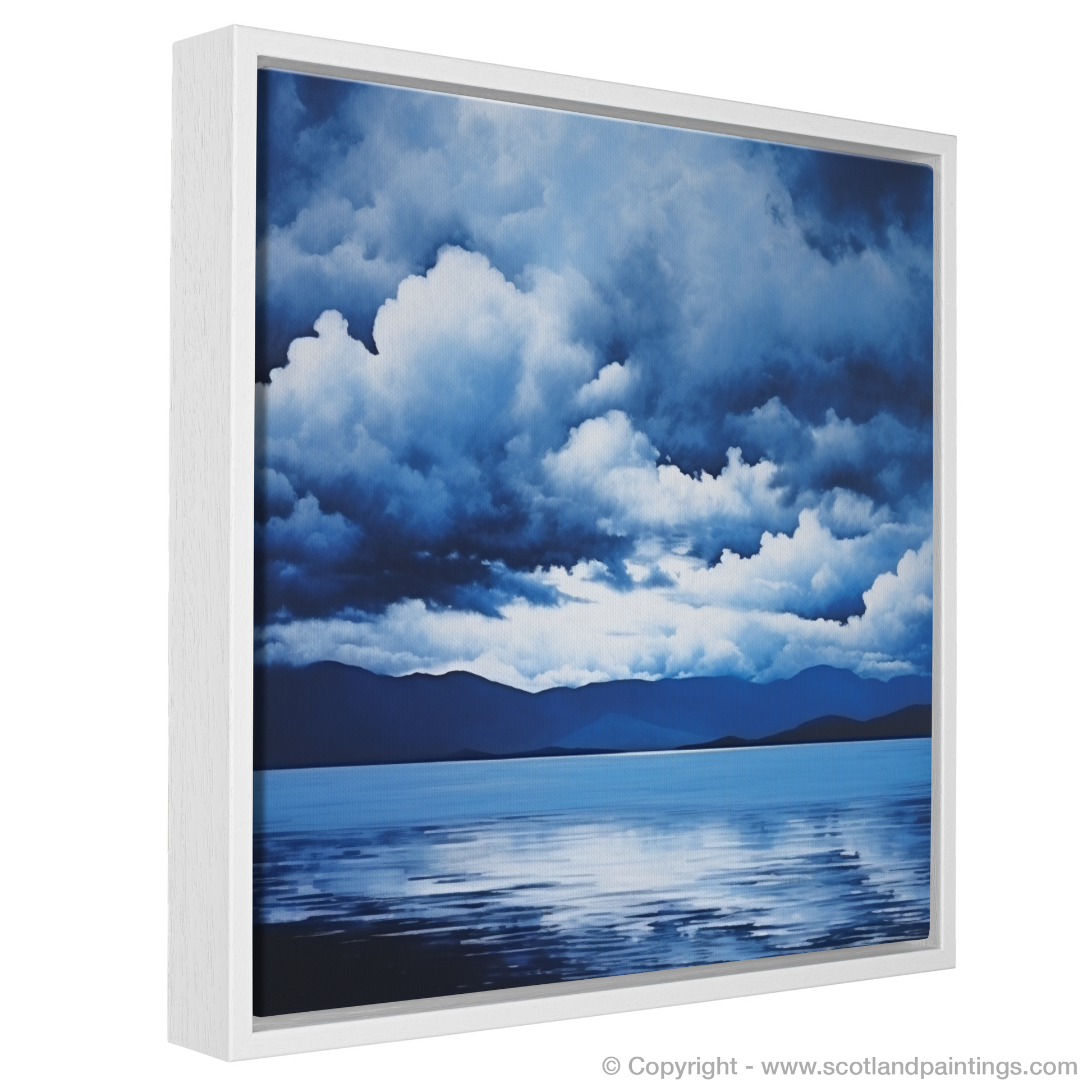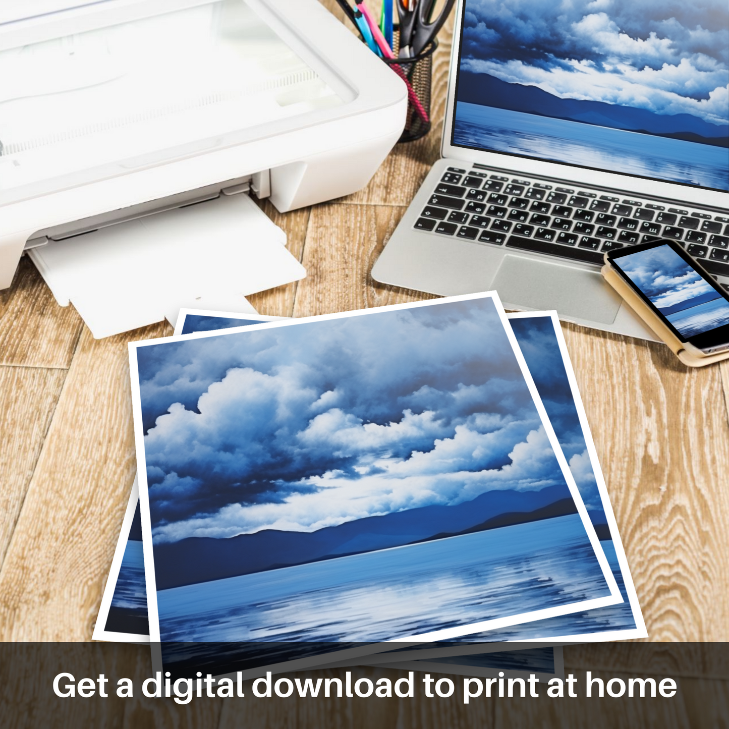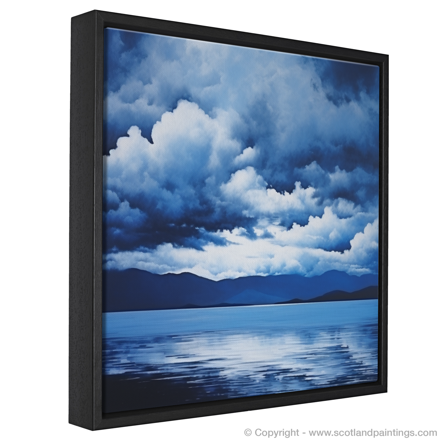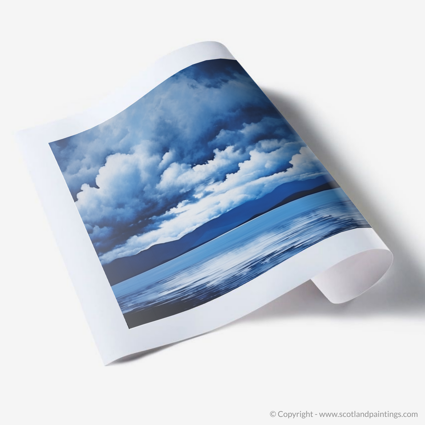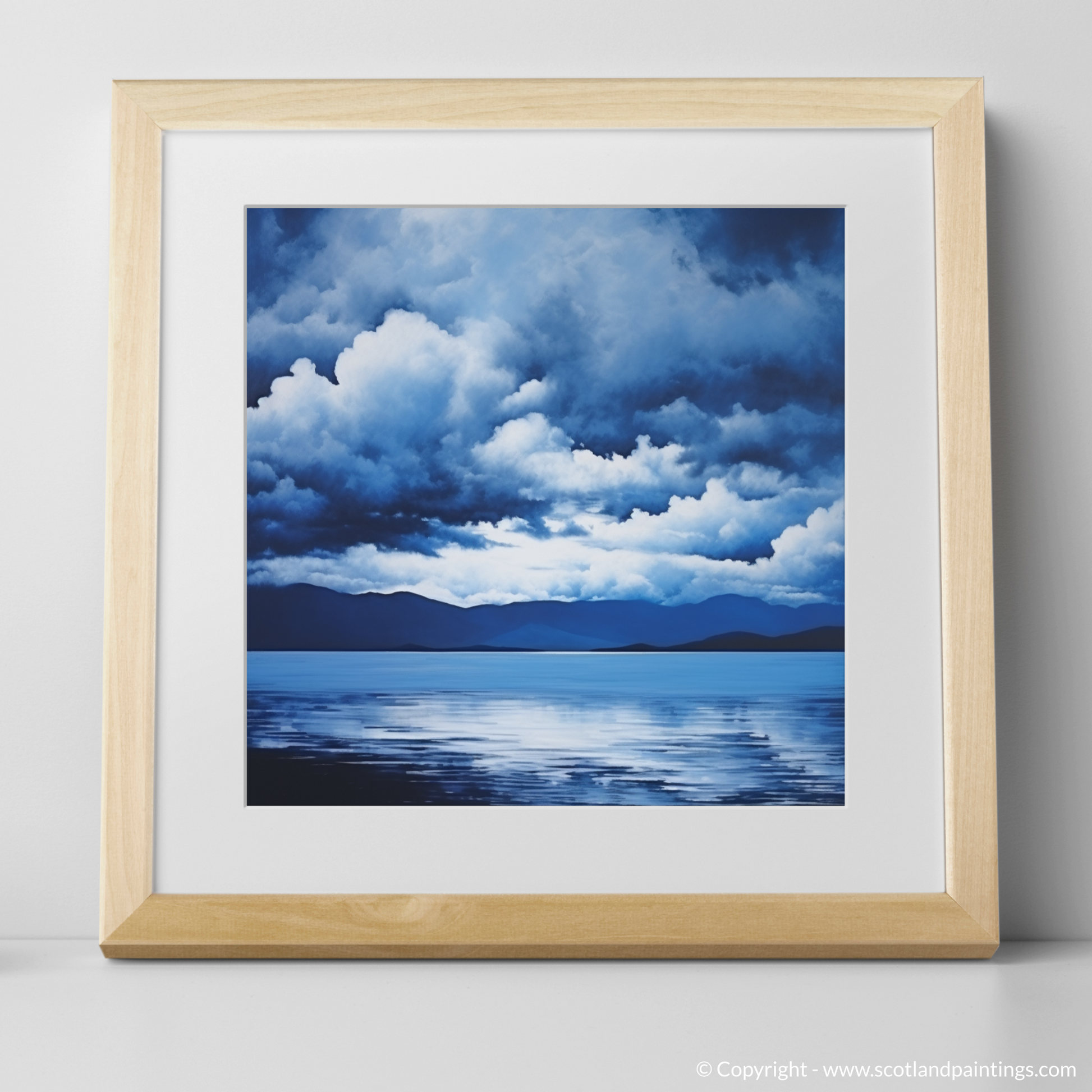 Capturing the dramatic essence of Scotland's natural beauty, this minimalist print presents a striking portrayal of storm clouds gathering above the serene Loch Lomond. Shades of deep blue dominate the composition, contrasting the brooding, heavy sky with the tranquil waters below.
