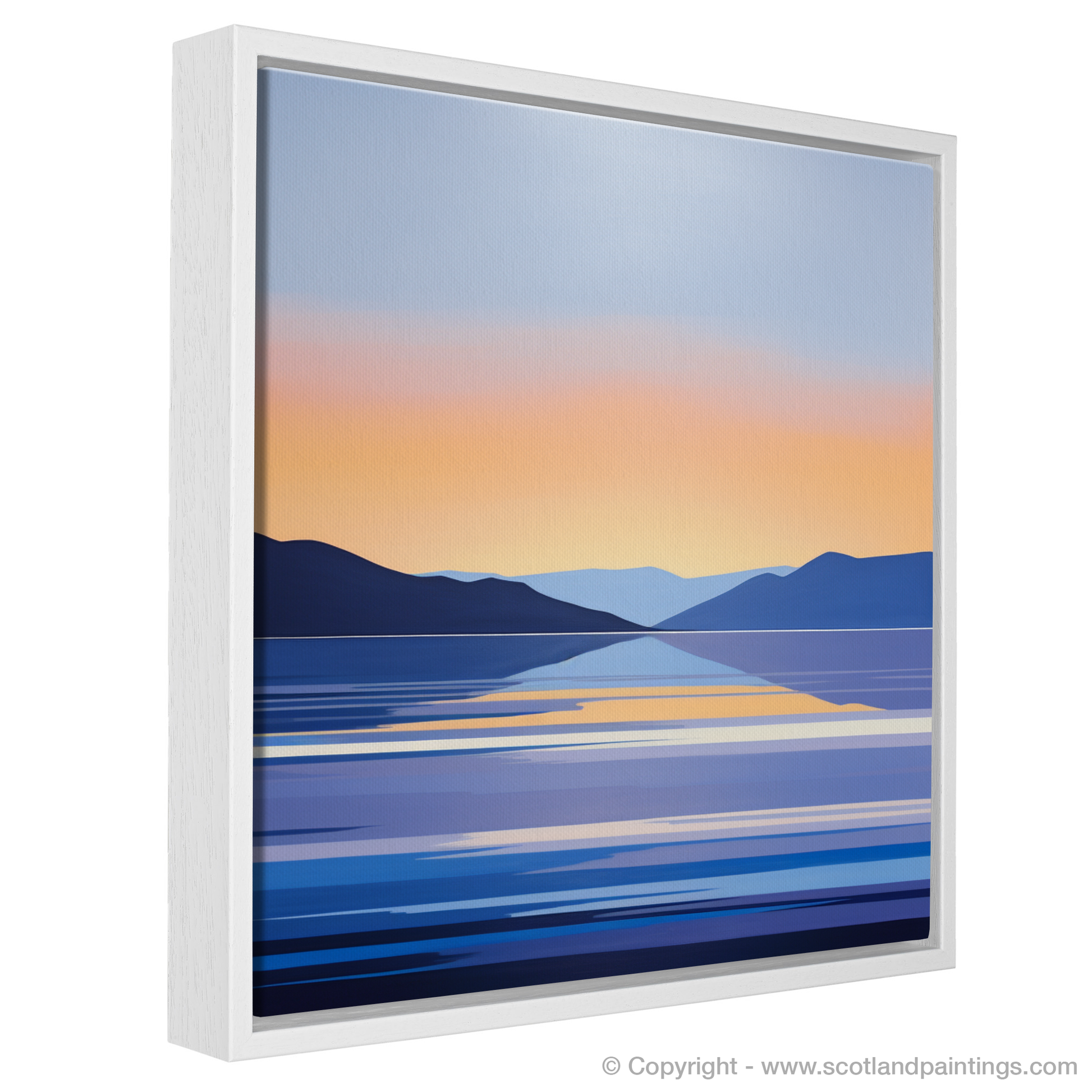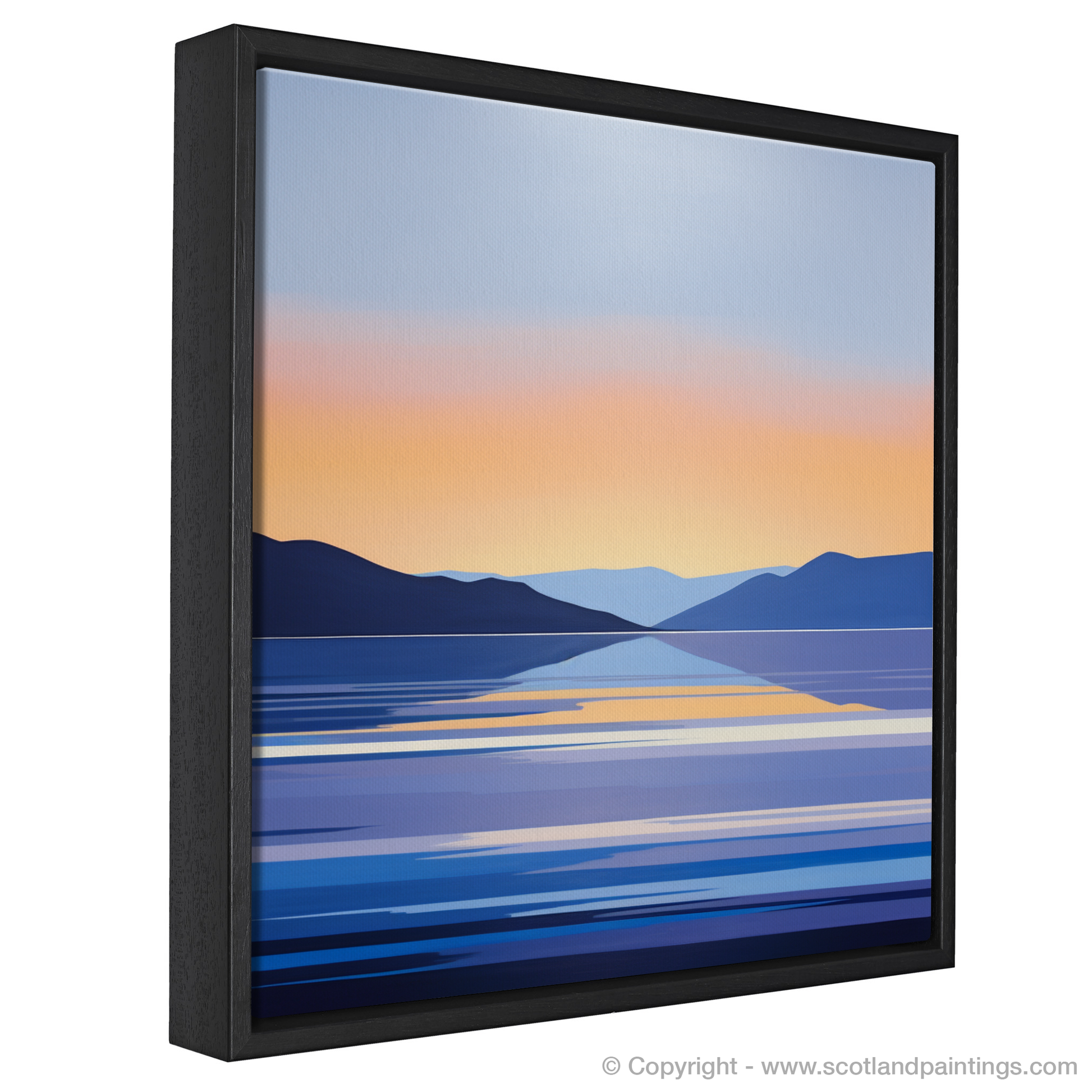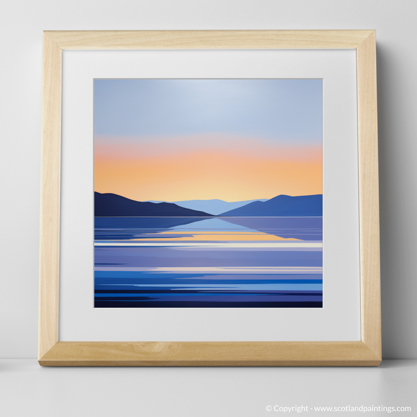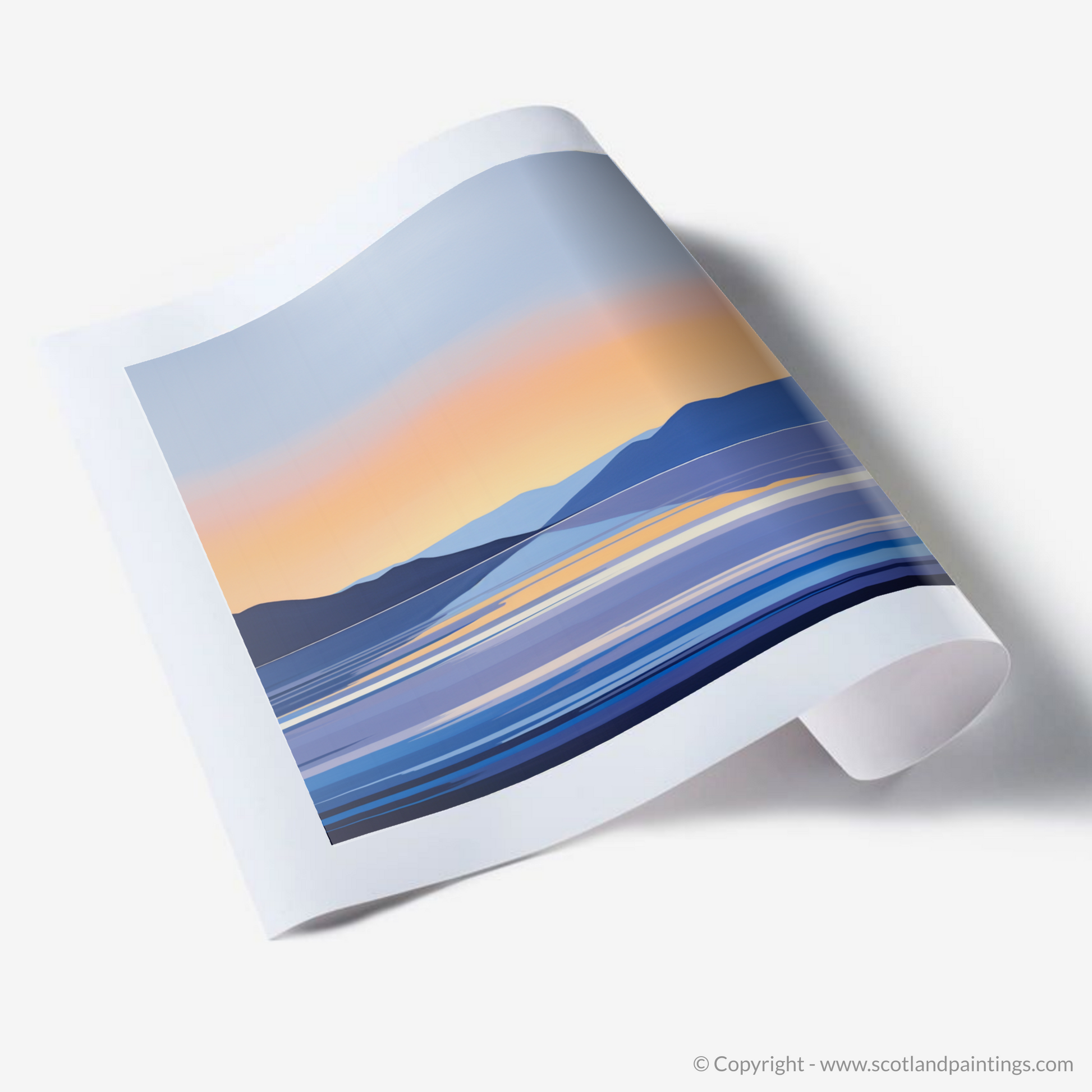 Capturing the serene beauty of Loch Lomond at dusk, this evocative print presents a minimalist interpretation that distills the essence of the landscape into clean lines and harmonious colour gradients. Hues of deep blue and muted purple form the silhouetted hills that cradle the calm expanse of water, suggesting the tranquil end to a day in the Scottish Highlands.