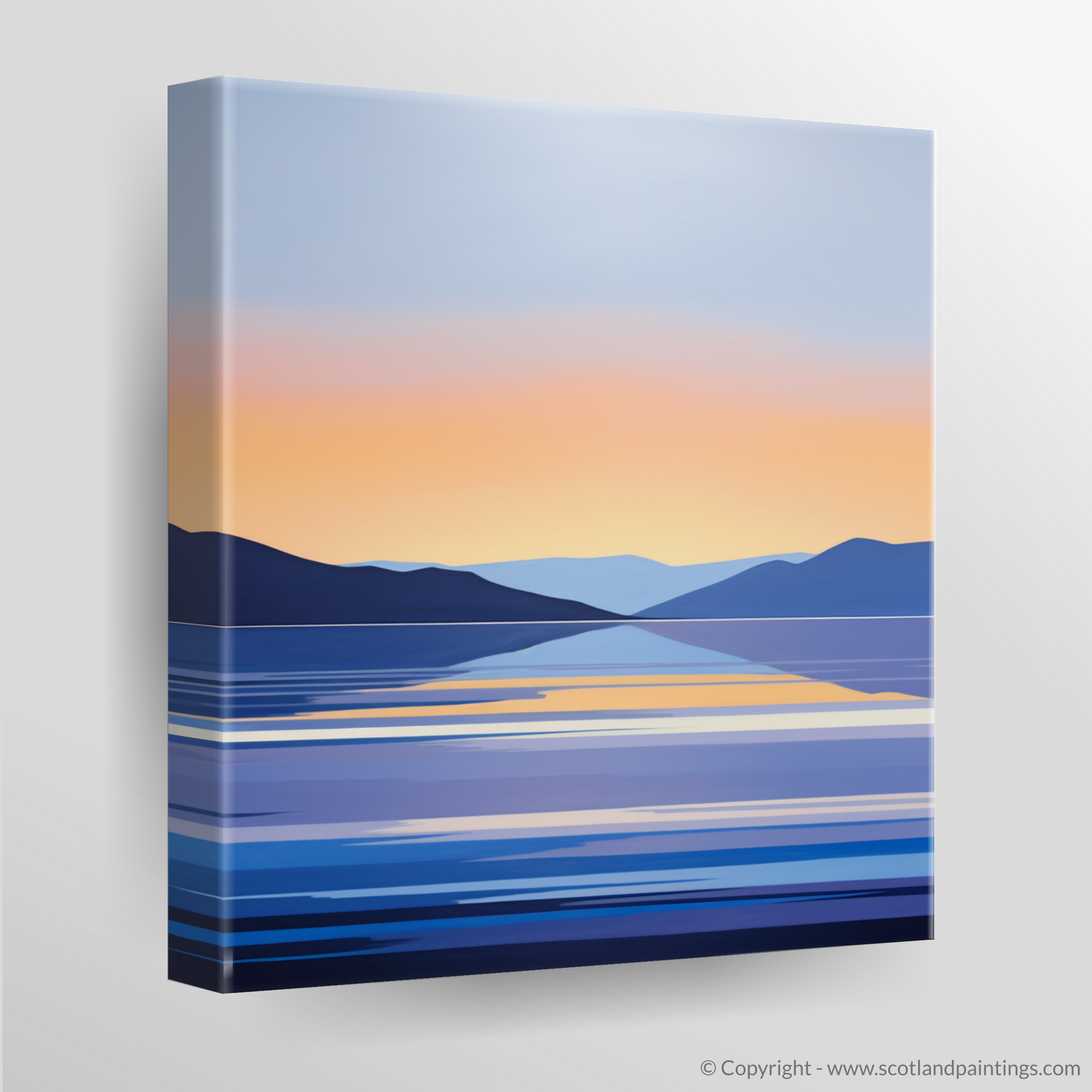 Above the darkened landforms, the sky transitions from a rich navy to a soft glow of peach and warm orange, reflecting the last light of the setting sun. The peaceful scene is mirrored on the surface of the loch, where elongated strokes of varying blues and whites create a rhythmic pattern across the print, echoing the gentle lapping of the water's surface.