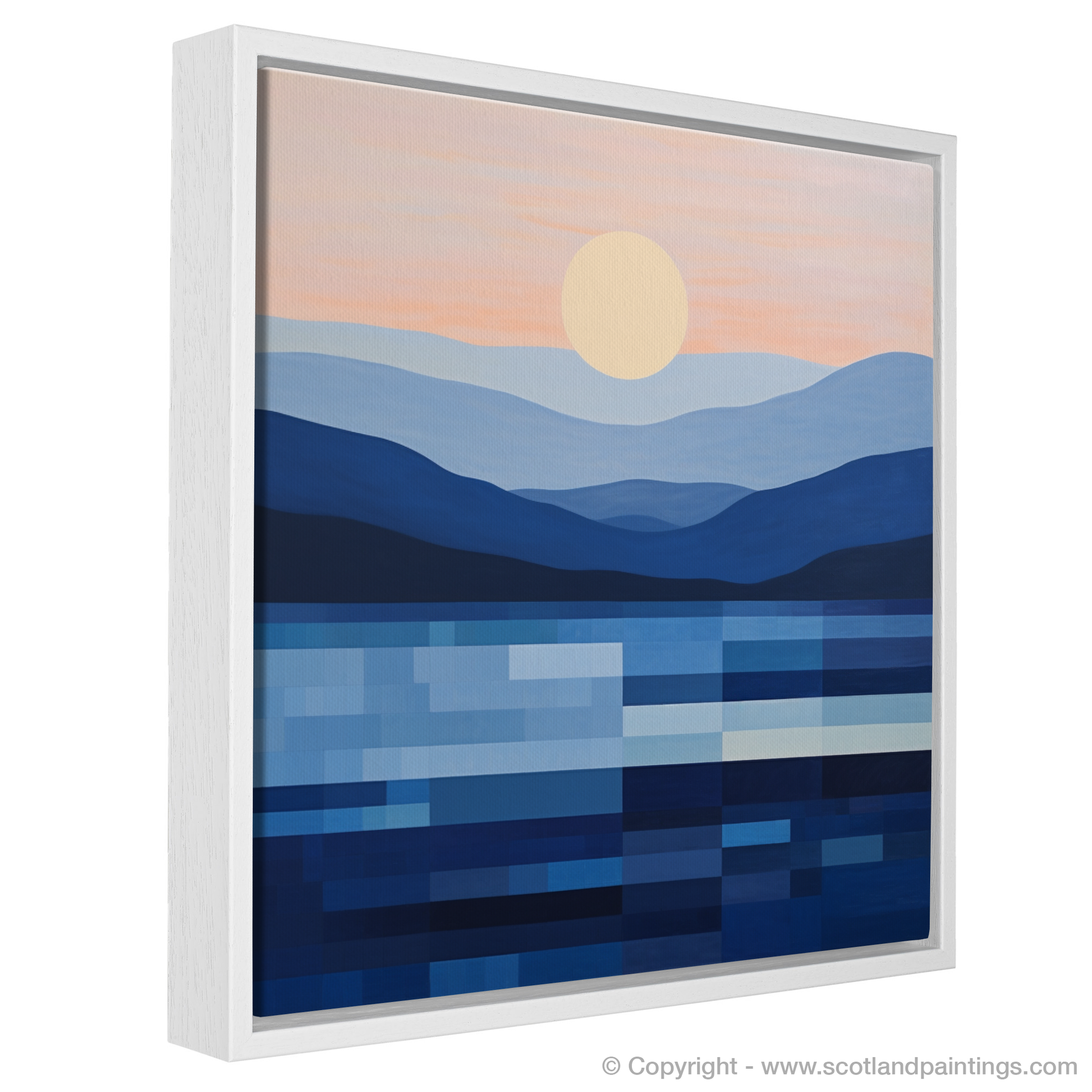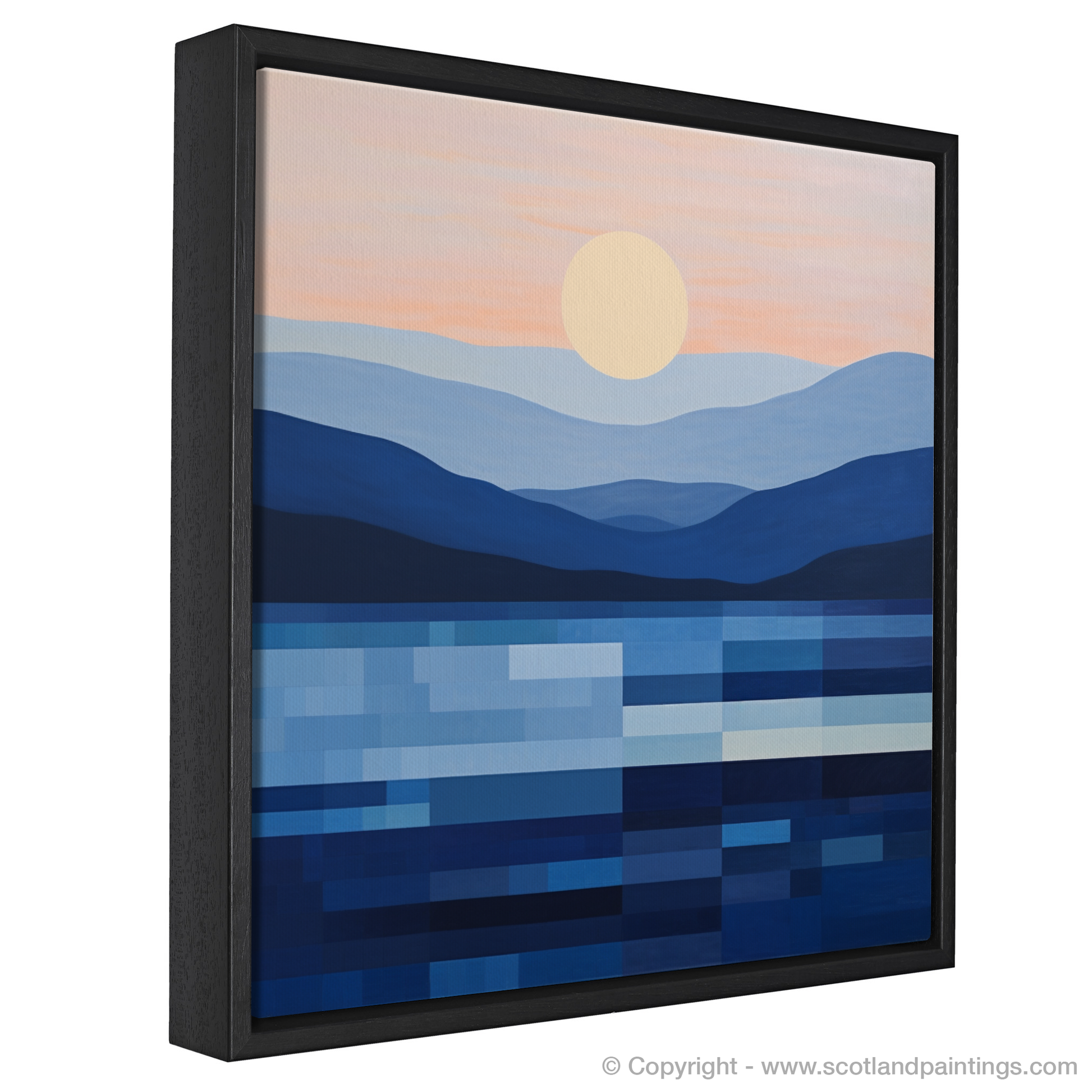 Undulating hills roll softly in silhouette, layered in varying shades of cool blues, which create a sense of depth and calm. Below, the loch itself is represented by a patchwork of squares and rectangles, an abstraction of water in a mosaic of blues, from turquoise to midnight, with touches of white reflecting the fading light. These blocks of colour provide a visual rhythm that suggests the gentle ebb and flow of water at dusk.