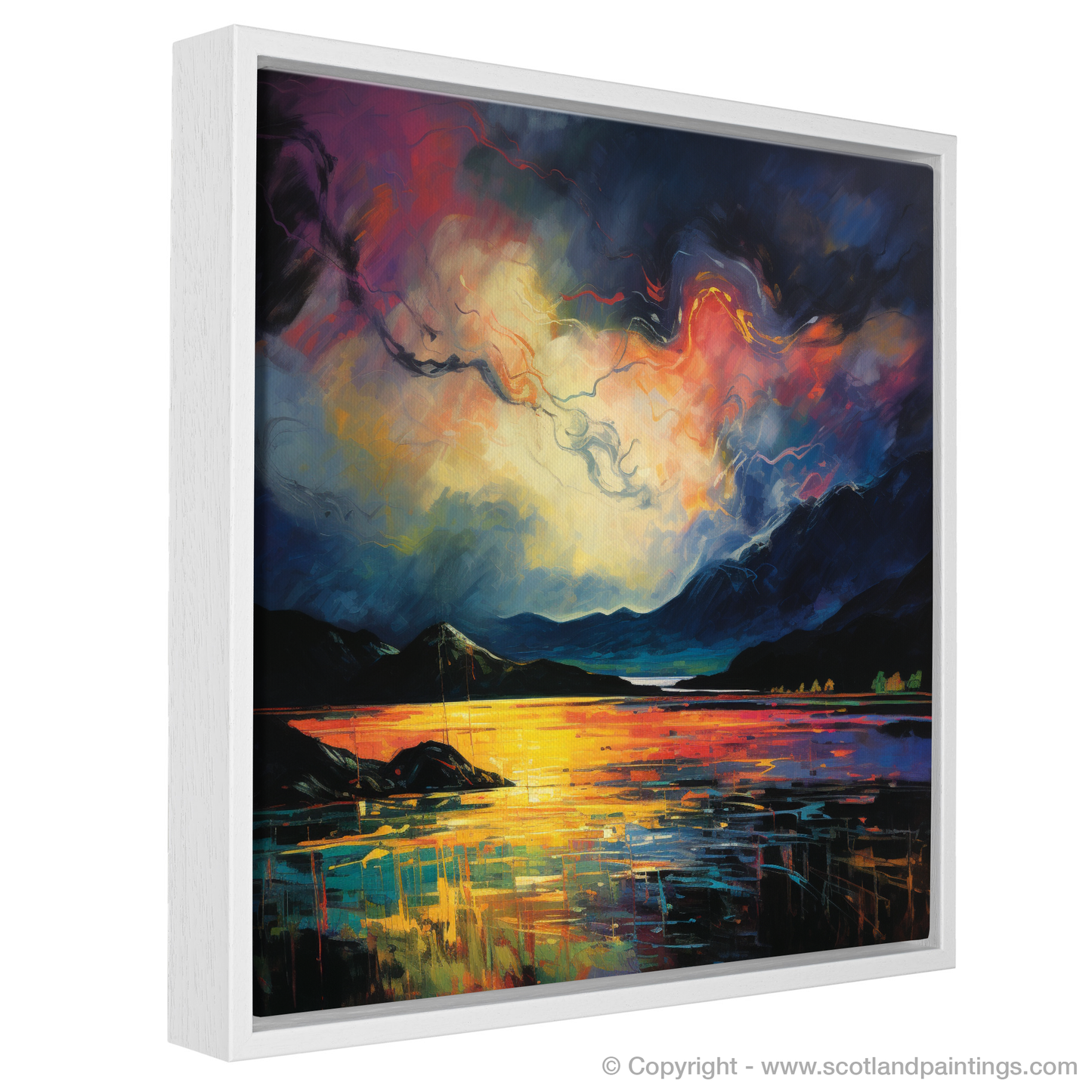 The reflection of the dynamic sky on Loch Lomond's surface is rendered with a striking abstract flair, where the water becomes a mirror breaking the world above into shimmering fragments of light. Streaks of luminous colour dance across the canvas, suggesting the fluid motion of the loch's ripples as they respond to the whispering winds.