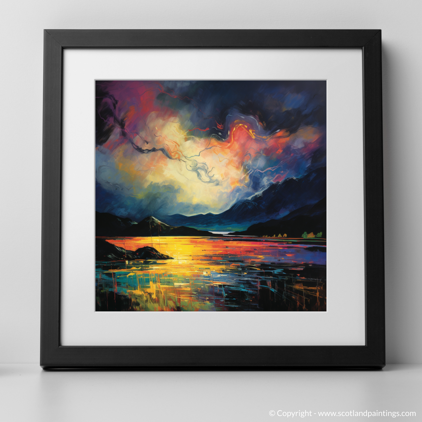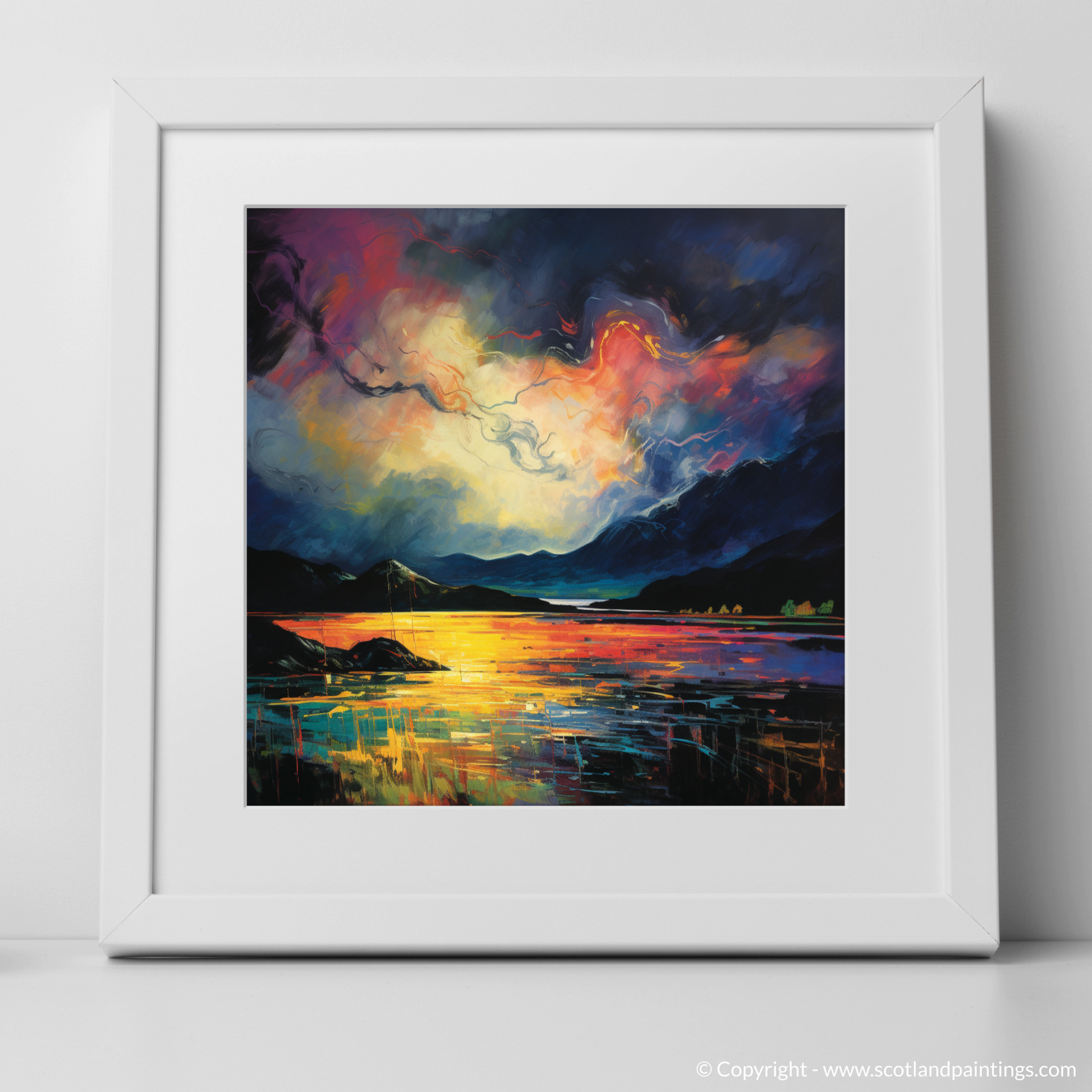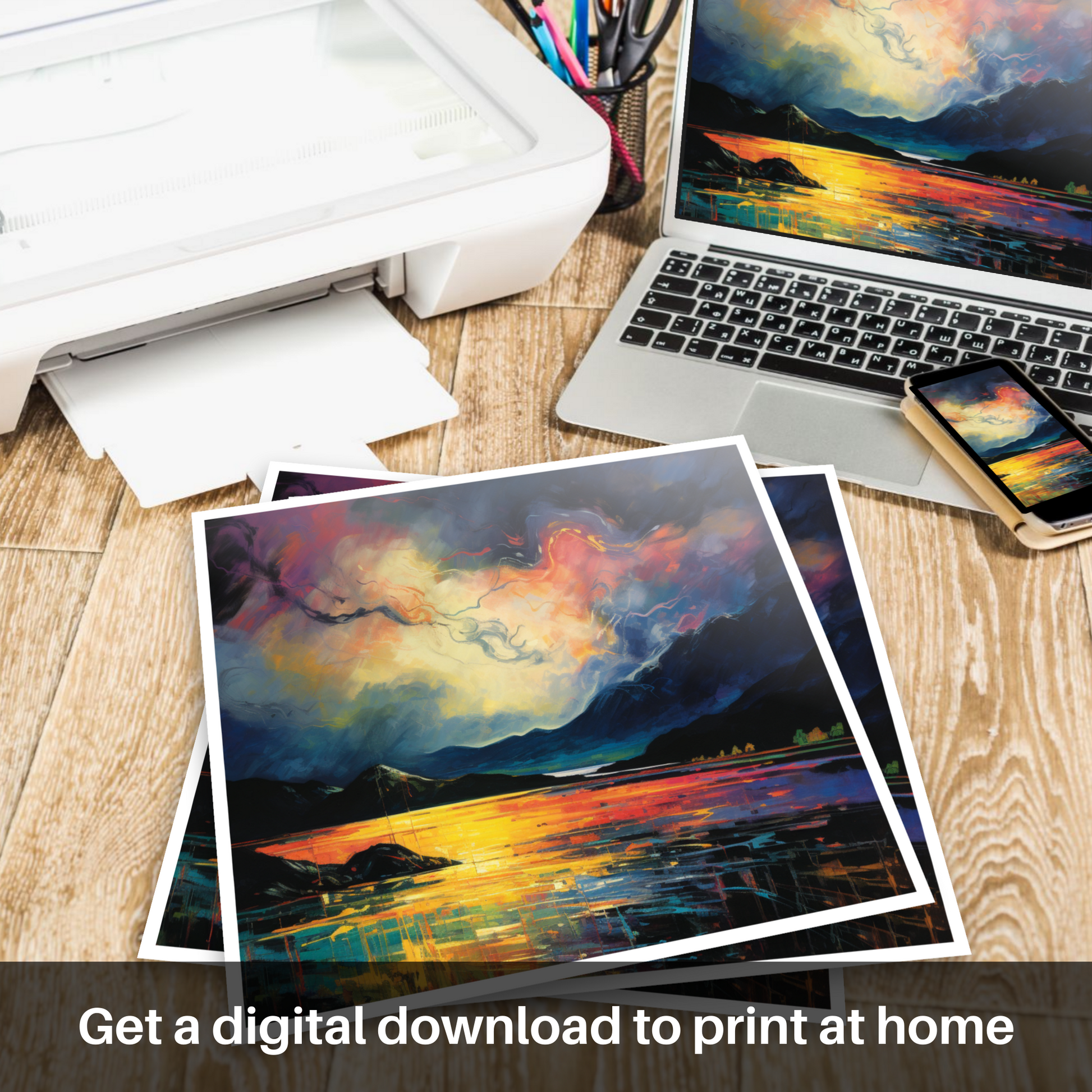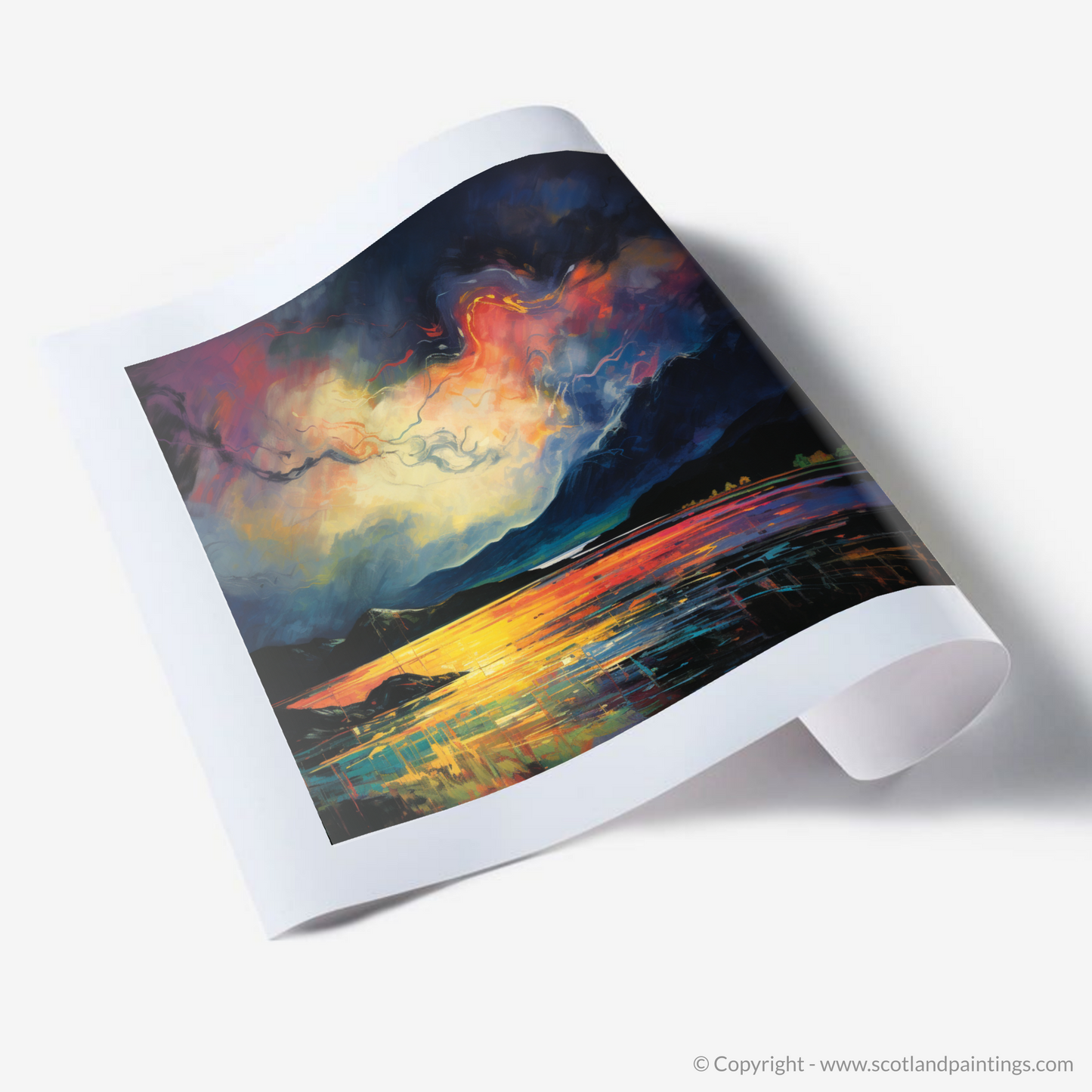 Capturing the tempestuous beauty of nature, this abstract print draws inspiration from the brooding presence of storm clouds gathering over Loch Lomond. The artwork translates the dynamic Scottish landscape into a tapestry of vibrant colours and vigorous brushstrokes, inviting the viewer into a sensory experience rooted in nature's power and diversity.