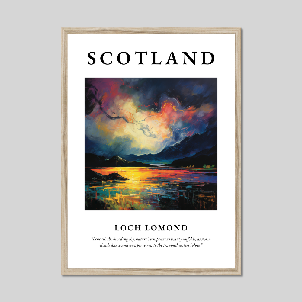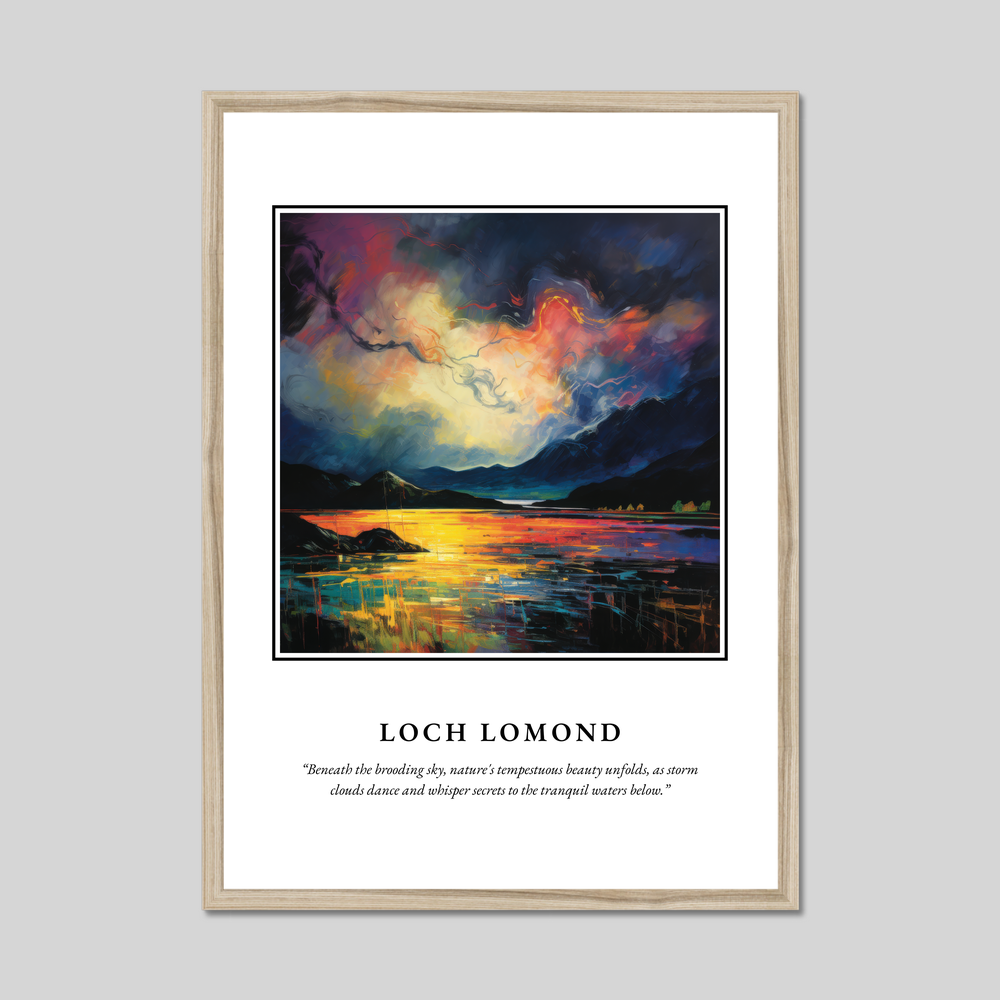 Loch Lomond, situated in the heart of the Trossachs National Park, is a treasured jewel of Scotland. Known for its serene beauty and majestic landscapes, it offers a harmonious blend of mountains, tranquil waters, and lush woodlands. This enchanting location has inspired many, drawing visitors from around the world to experience its natural wonder. The artwork's depiction of roiling clouds and shimmering water perfectly captures the essence of Loch Lomond, echoing the sense of mystery and allure that this captivating place inspires.