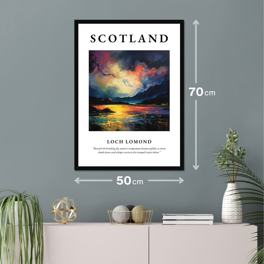 Embrace the wild beauty of Scotland with our striking framed poster print, capturing the essence of Loch Lomond in an abstract masterpiece. Measuring an impressive 50cm x 70cm, this poster is perfect for anyone who loves the vast, atmospheric landscapes that Scotland is known for or treasures memories of visits to this iconic loch. With its sweeping brushstrokes and vibrant hues, the painting depicts a mesmerising dance of storm clouds across the sky, reflecting their kaleidoscopic colours in the tranquil waters below. The dynamic nature of the abstract style invites endless interpretations, making it the perfect piece for art enthusiasts who cherish creativity and emotion.
