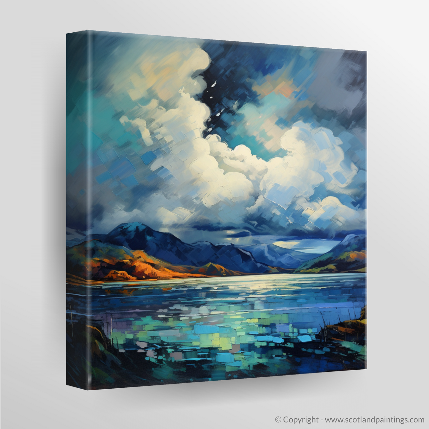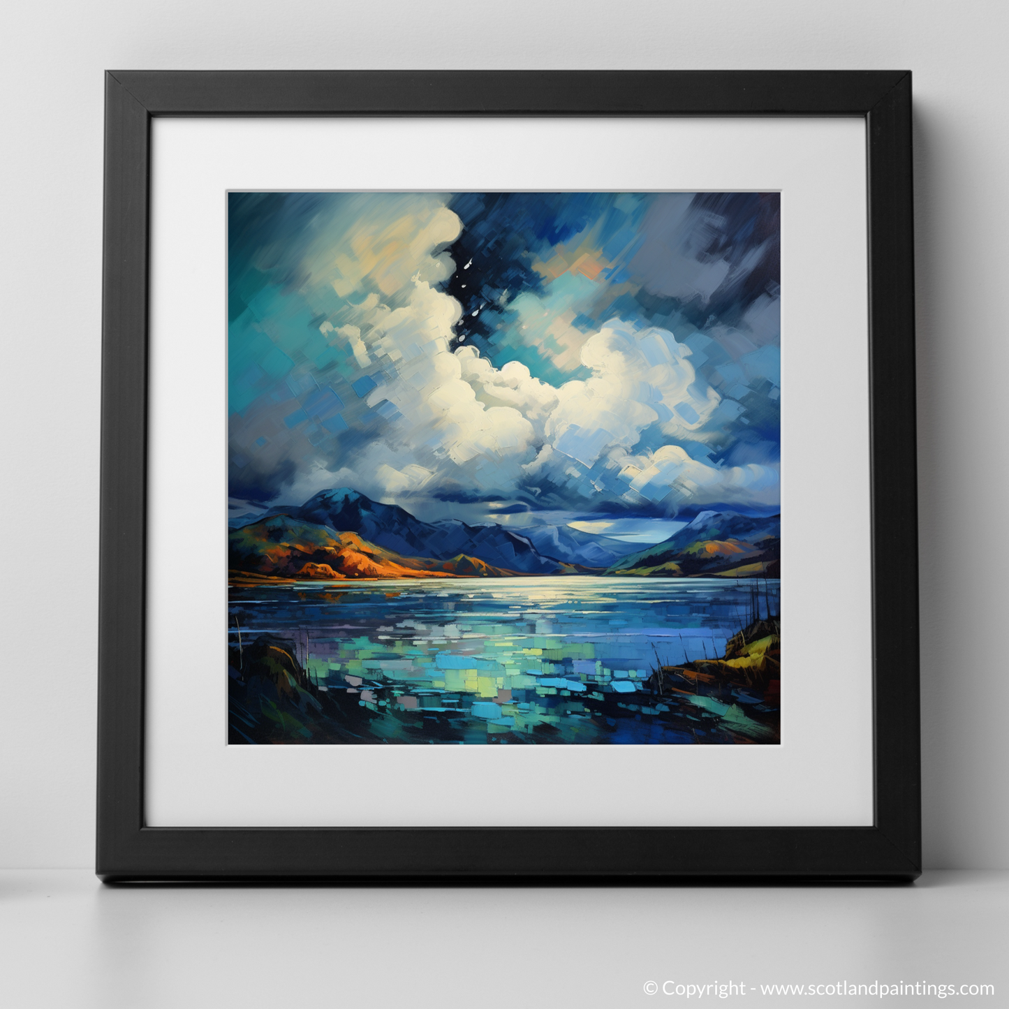 Enhancing the rustic charm of the scene, the painting's texture is palpable—an effect achieved through the application of strong brushwork, giving the print a tactile and lively quality that draws the viewer into the artwork. This print offers not just a view, but an experience of Loch Lomond's unique atmosphere, a moment captured between the calm before the storm and the tempest itself. It's an invitation to explore the raw, powerful beauty of the Highlands from the comfort of one's own space.