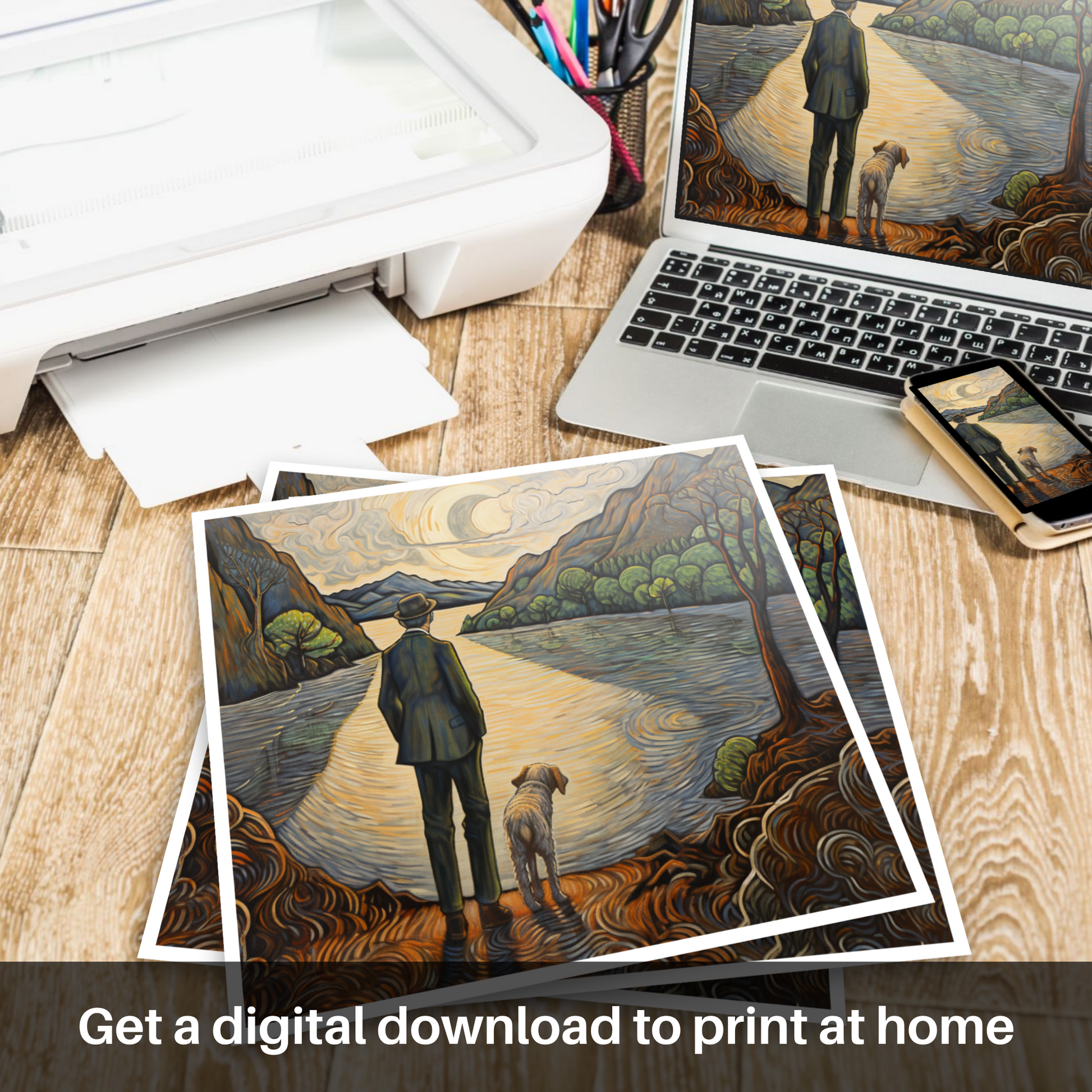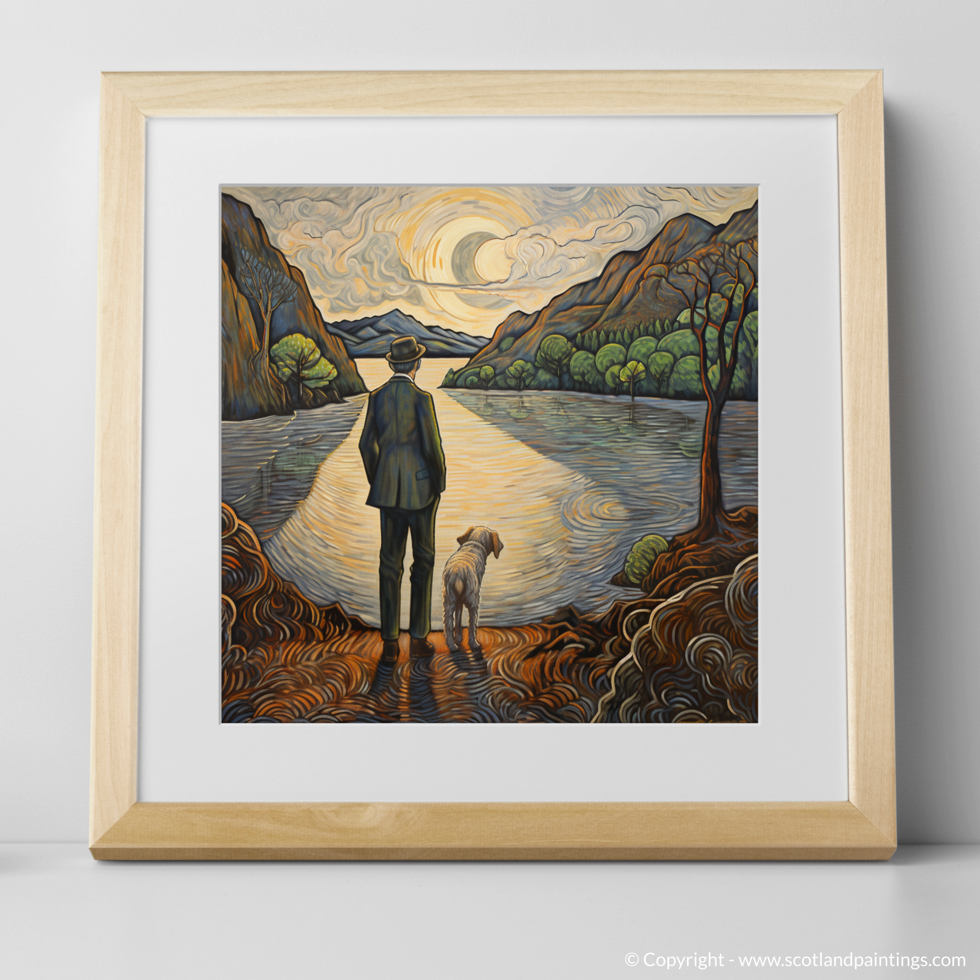 This captivating print portrays a serene scene set by the tranquil waters of Loch Lomond. In it, a figure stands poised at the water's edge, gazing across the shimmering expanse accompanied by a loyal canine companion. The man, dressed in a classic ensemble complete with hat and coat, exudes a sense of contemplation and calm, mirroring the placid surroundings.