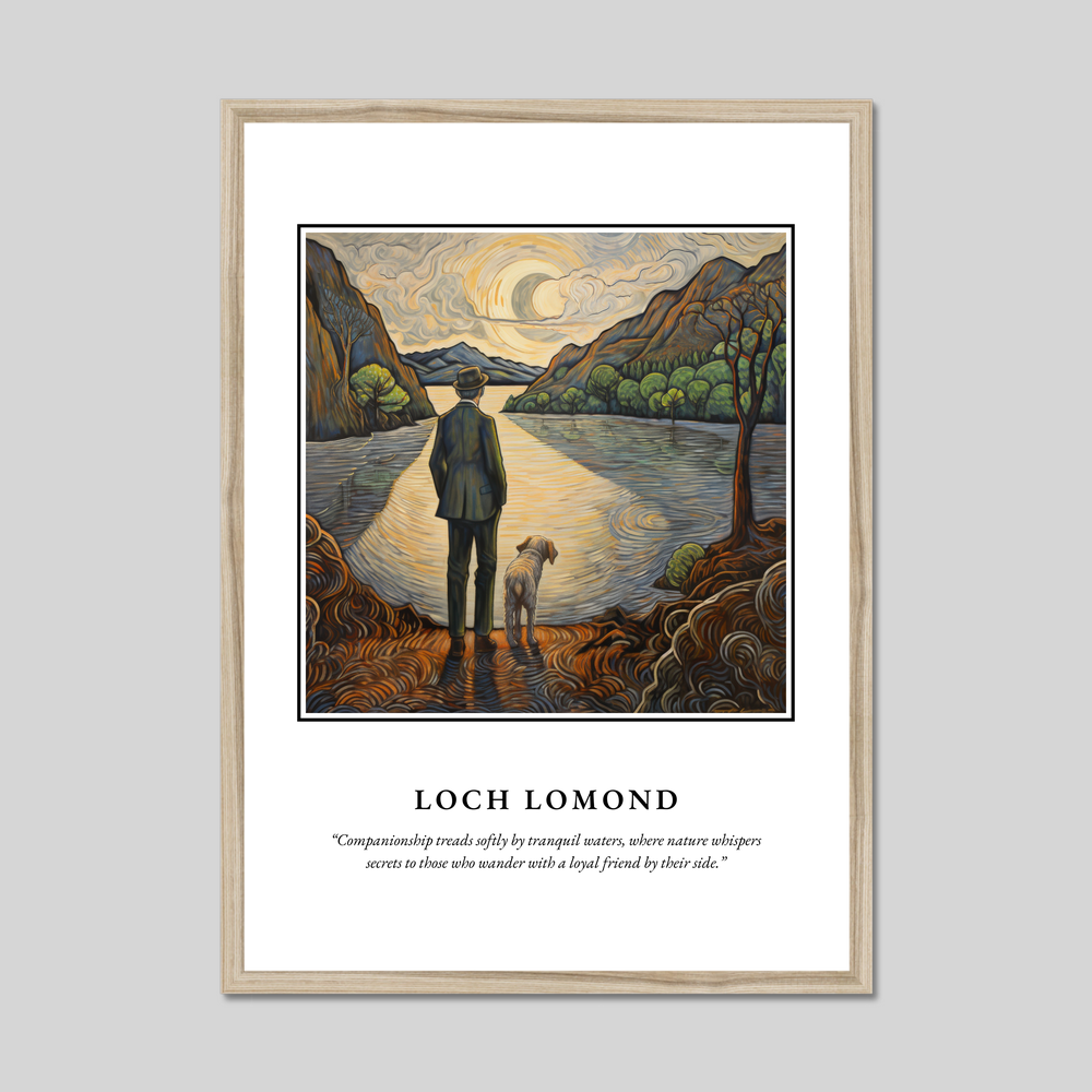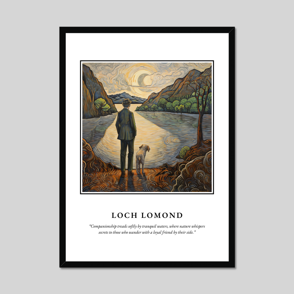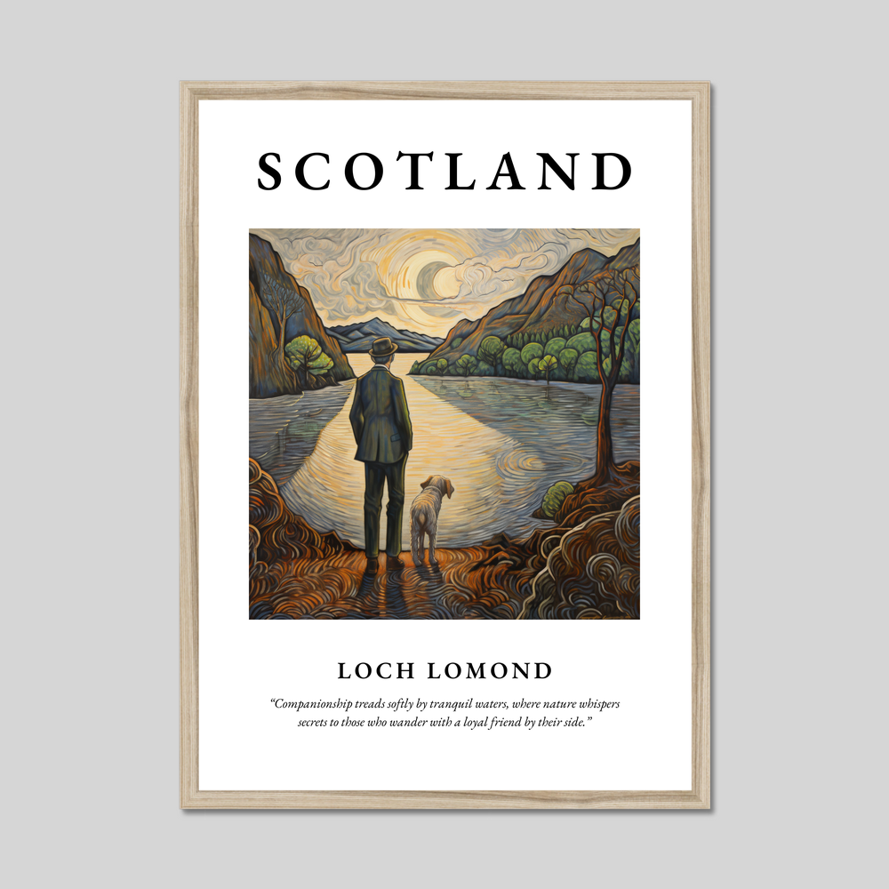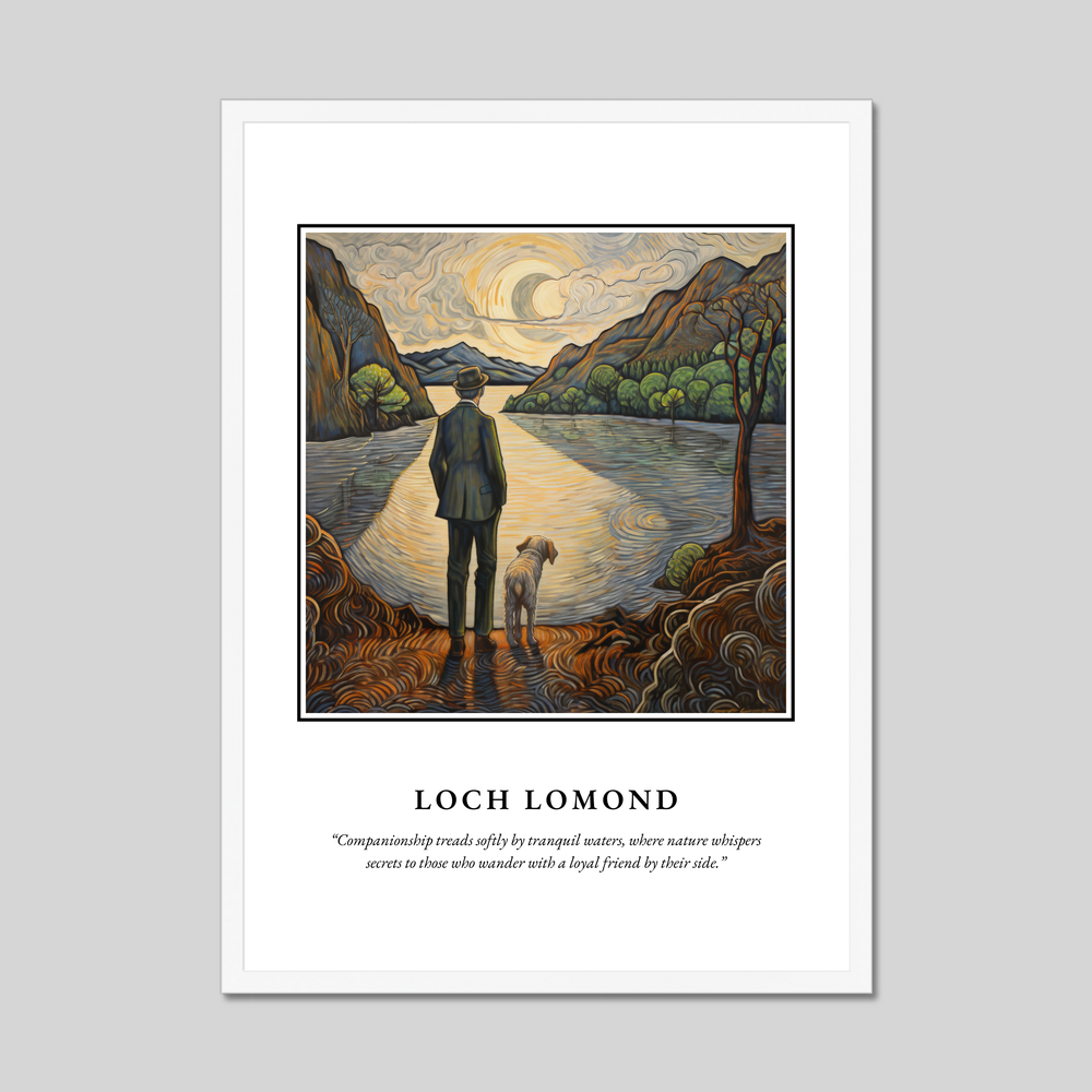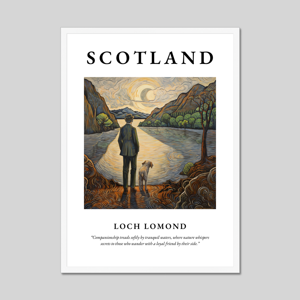 The artwork captures a serene moment where a figure stands beside a loyal companion, gazing across the tranquil waters of Loch Lomond. The swirling lines and rich colours characteristic of Art Nouveau bring the scene to life, evoking a sense of calm and reverie. Above this enchanting vista is “SCOTLAND” in bold, proud letters, while beneath lies an evocative quote: “Companionship treads softly by tranquil waters, where nature whispers secrets to those who wander with a loyal friend by their side.”