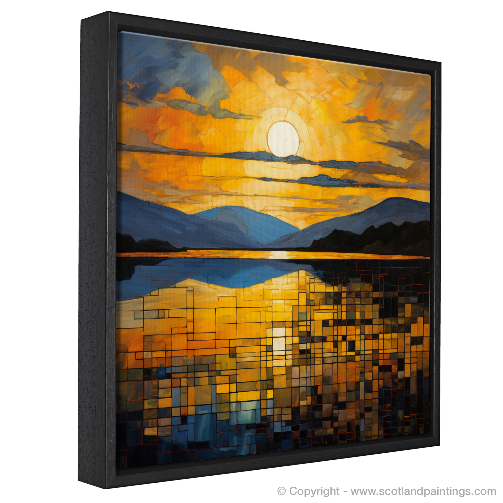 Anchored by a vibrant sun hanging low on the horizon, the print showcases a captivating interplay of fiery oranges and soothing blues, segmented into an assemblage of geometric shapes that suggest the shimmering reflection on the surface of the loch. The sun's reflection is fragmented, reminiscent of light dancing on moving water, while the silhouettes of distant mountains are layered in varying shades of blue, giving depth and form to the composition.