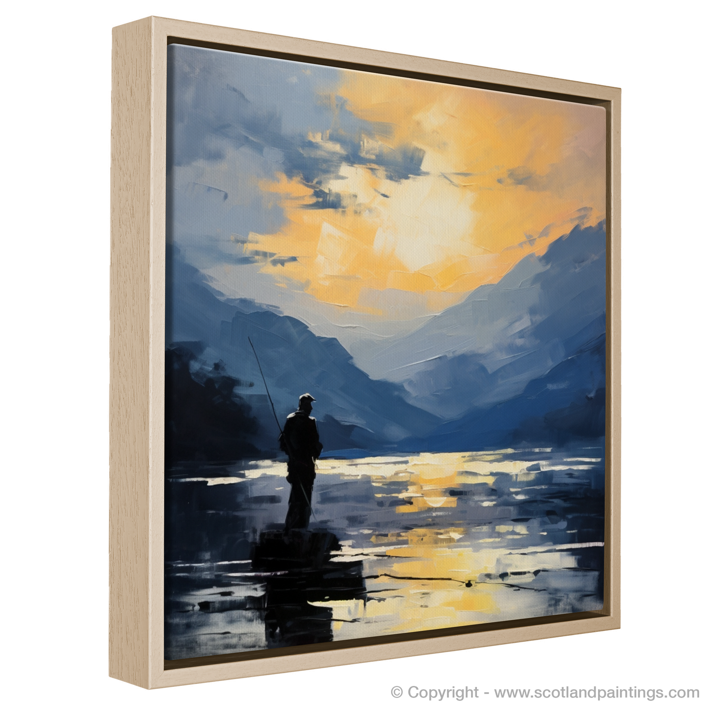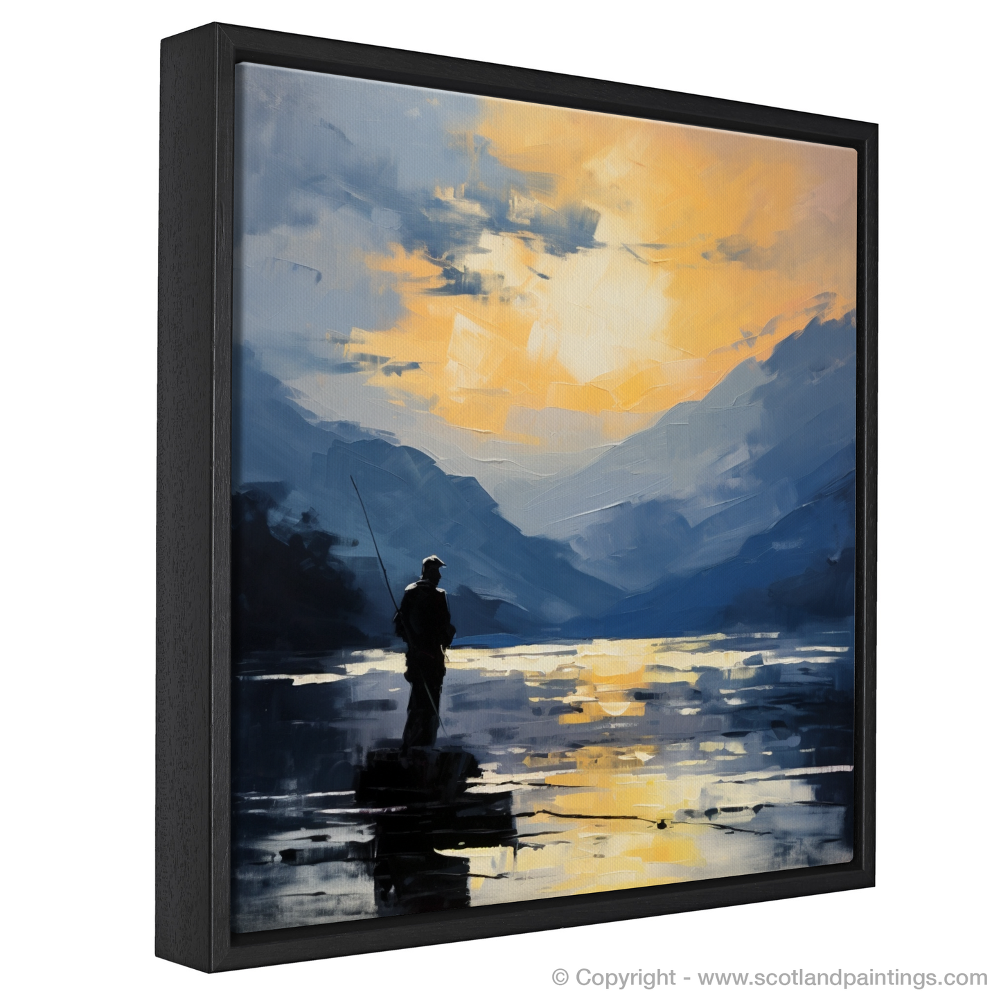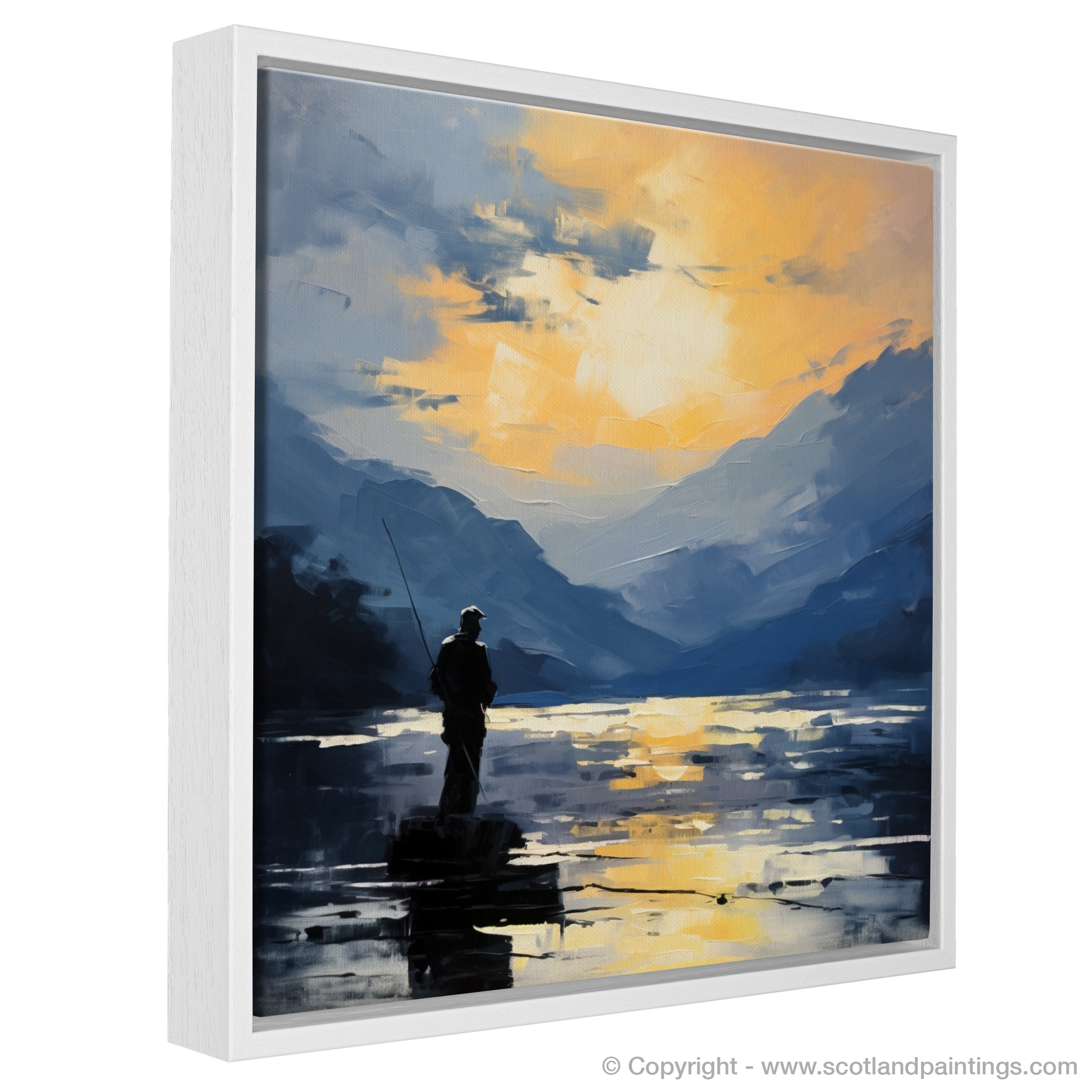Capturing a tranquil moment on Loch Lomond, this evocative print presents a lone fisherman, silhouetted against a radiant backdrop of water and sky. Brushstrokes render the scene with a dreamlike quality characteristic of the Impressionist style, inviting viewers to lose themselves in the serene beauty of the Scottish Highlands.