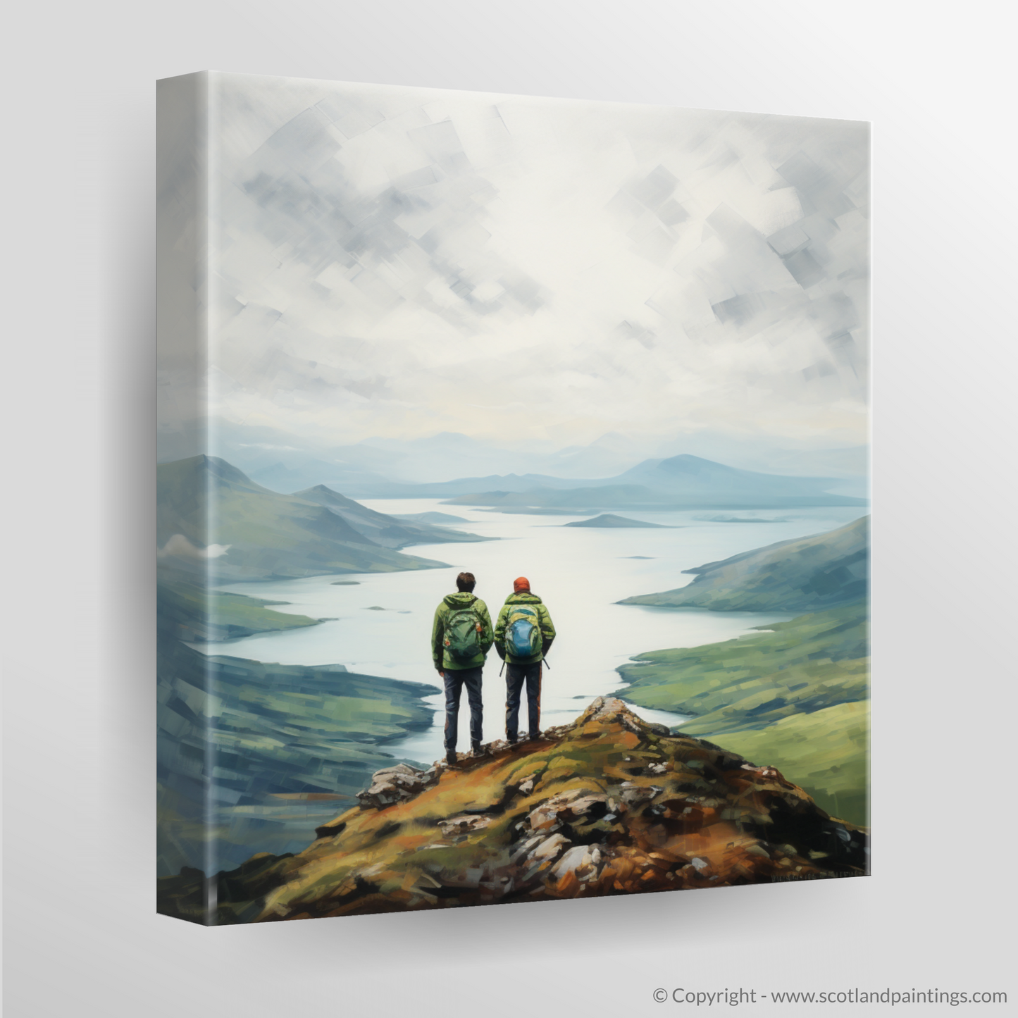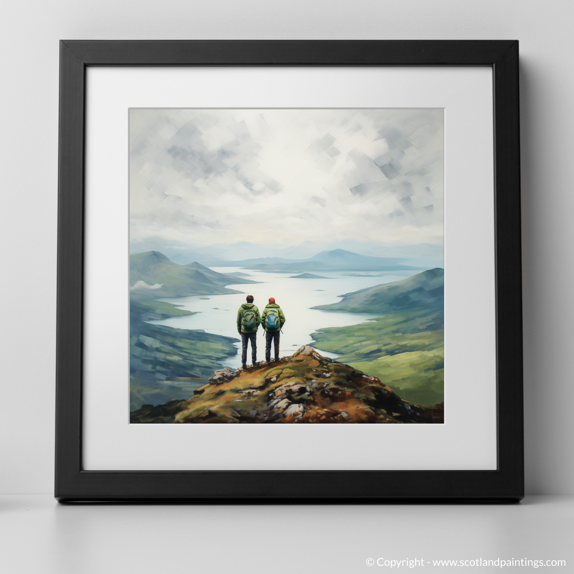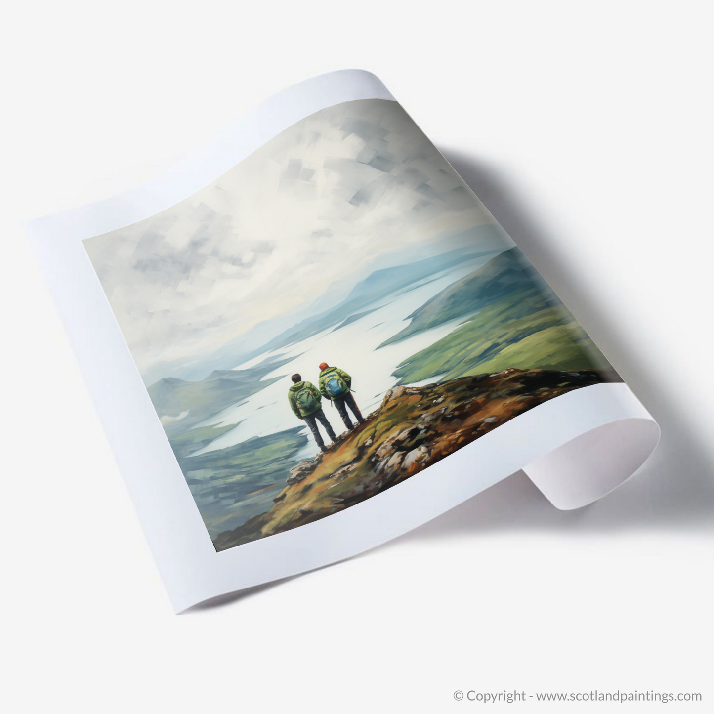 Captured within this serene print are two hikers standing at the pinnacle of a rugged promontory, their figures a study in quiet companionship and contemplation as they gaze upon the majestic expanse of Loch Lomond. With the misty Scottish Highlands as their backdrop, the sweeping panoramic view unfolds in subtle hues and soft-edged shapes, portraying the tranquil waters and undulating hills in a palette of blues, greens, and earth tones.