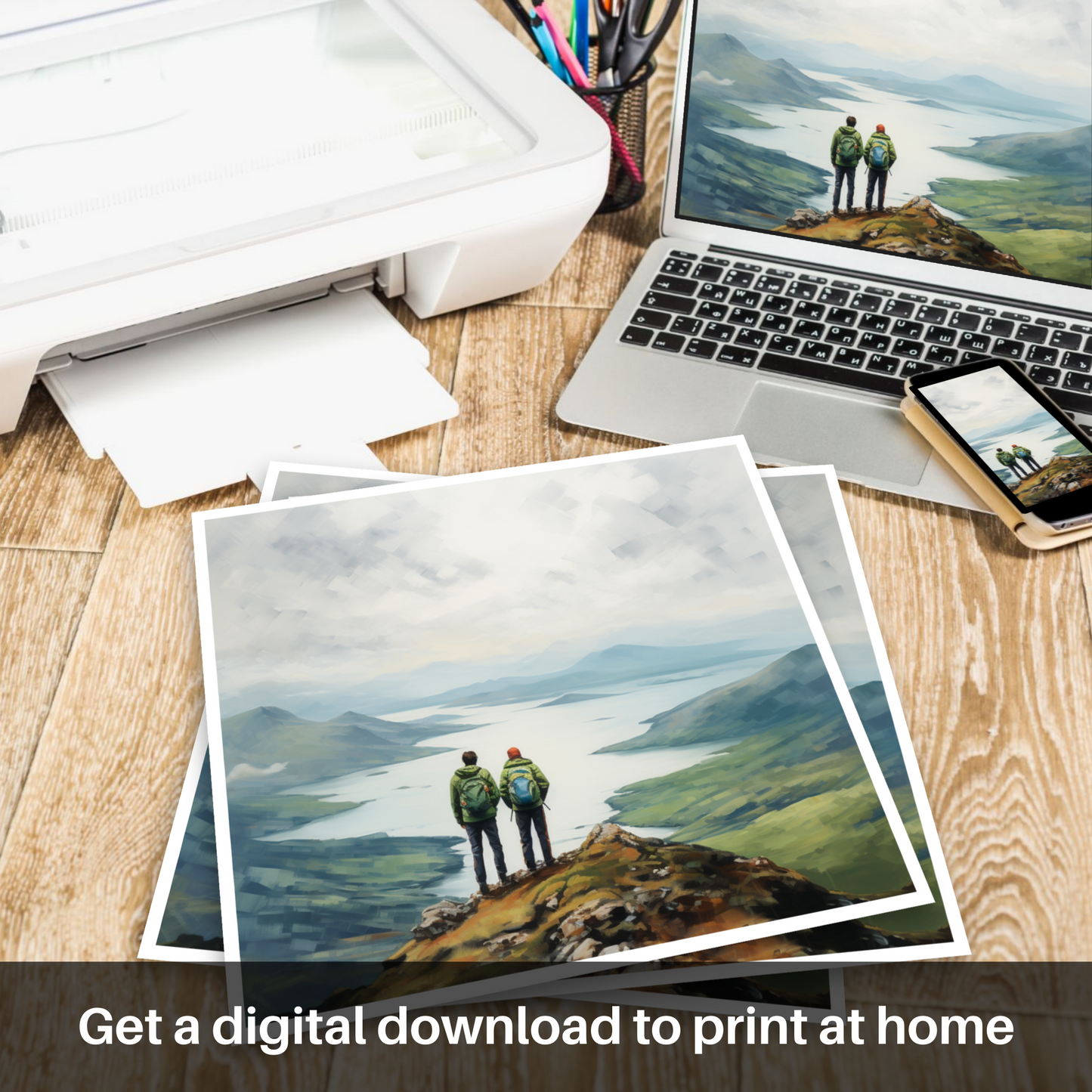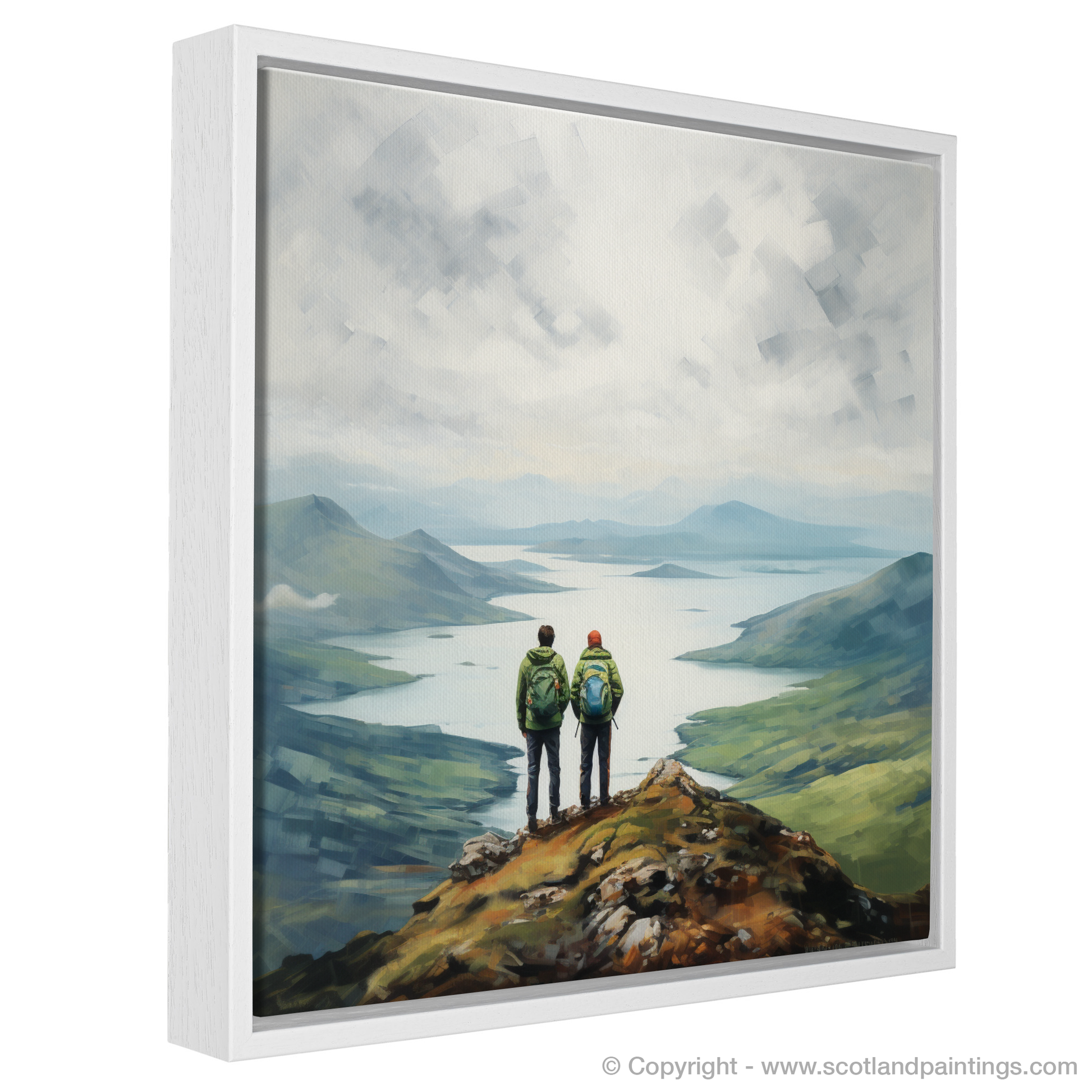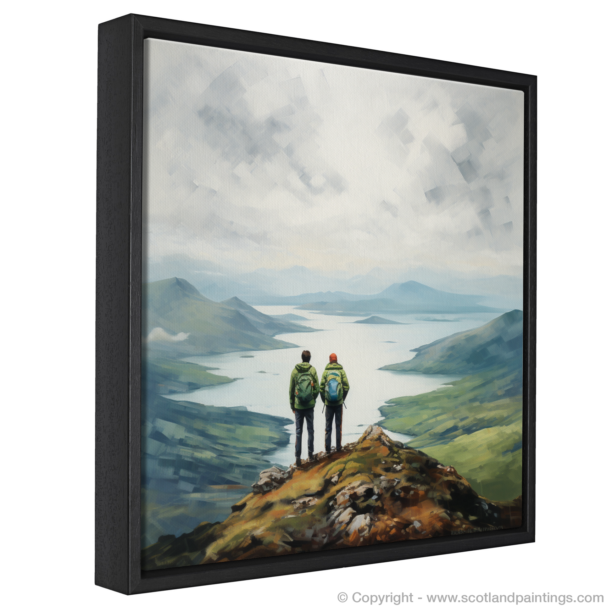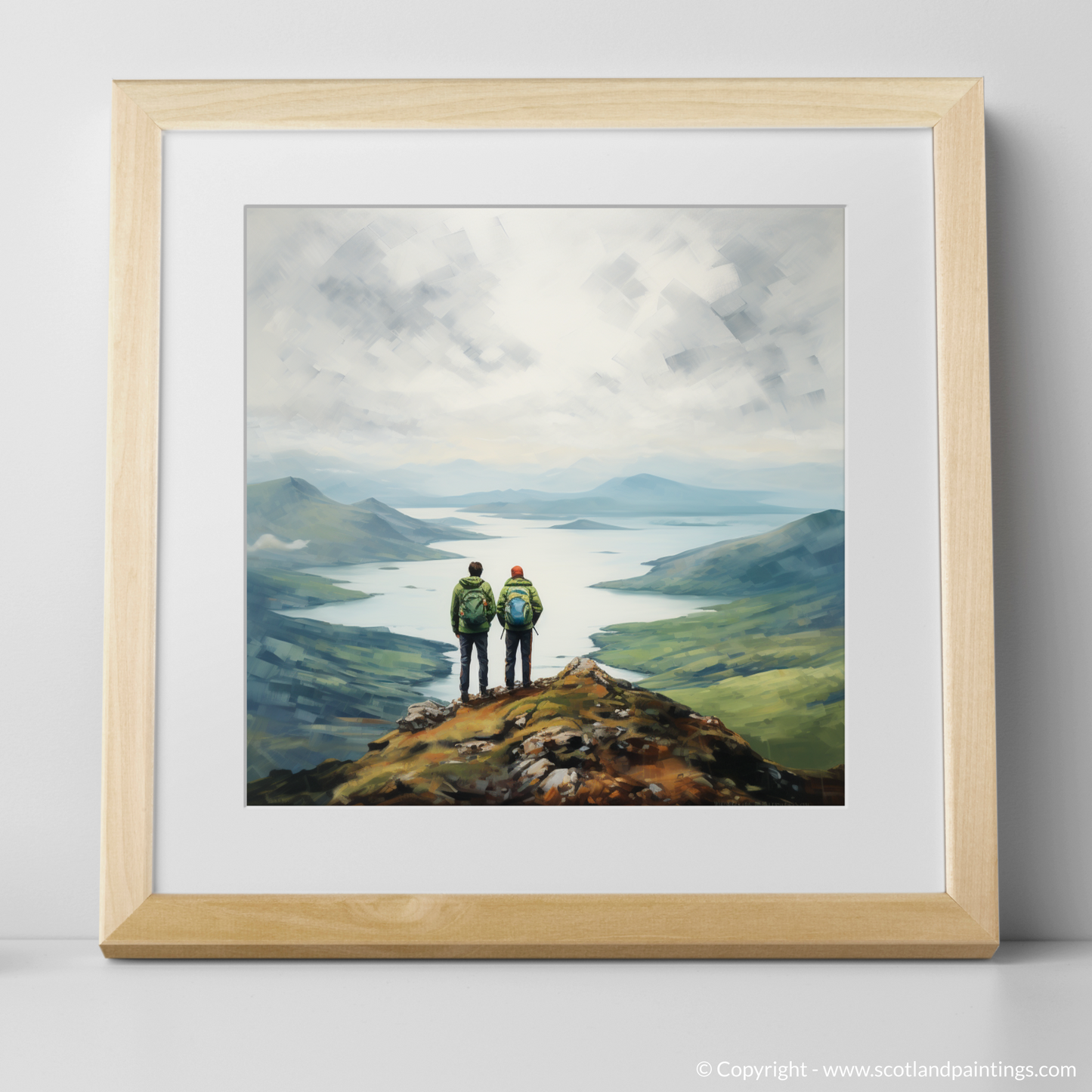 Captured within this serene print are two hikers standing at the pinnacle of a rugged promontory, their figures a study in quiet companionship and contemplation as they gaze upon the majestic expanse of Loch Lomond. With the misty Scottish Highlands as their backdrop, the sweeping panoramic view unfolds in subtle hues and soft-edged shapes, portraying the tranquil waters and undulating hills in a palette of blues, greens, and earth tones.