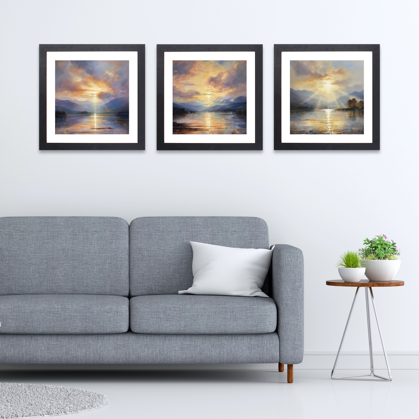 Introducing an exquisite set of three framed prints from the Loch Lomond collection, available exclusively at ScotlandPaintings.com. These captivating artworks beautifully capture the breathtaking spectacle of Crepuscular rays above Loch Lomond, bringing a touch of atmospheric serenity and natural elegance to your interiors.