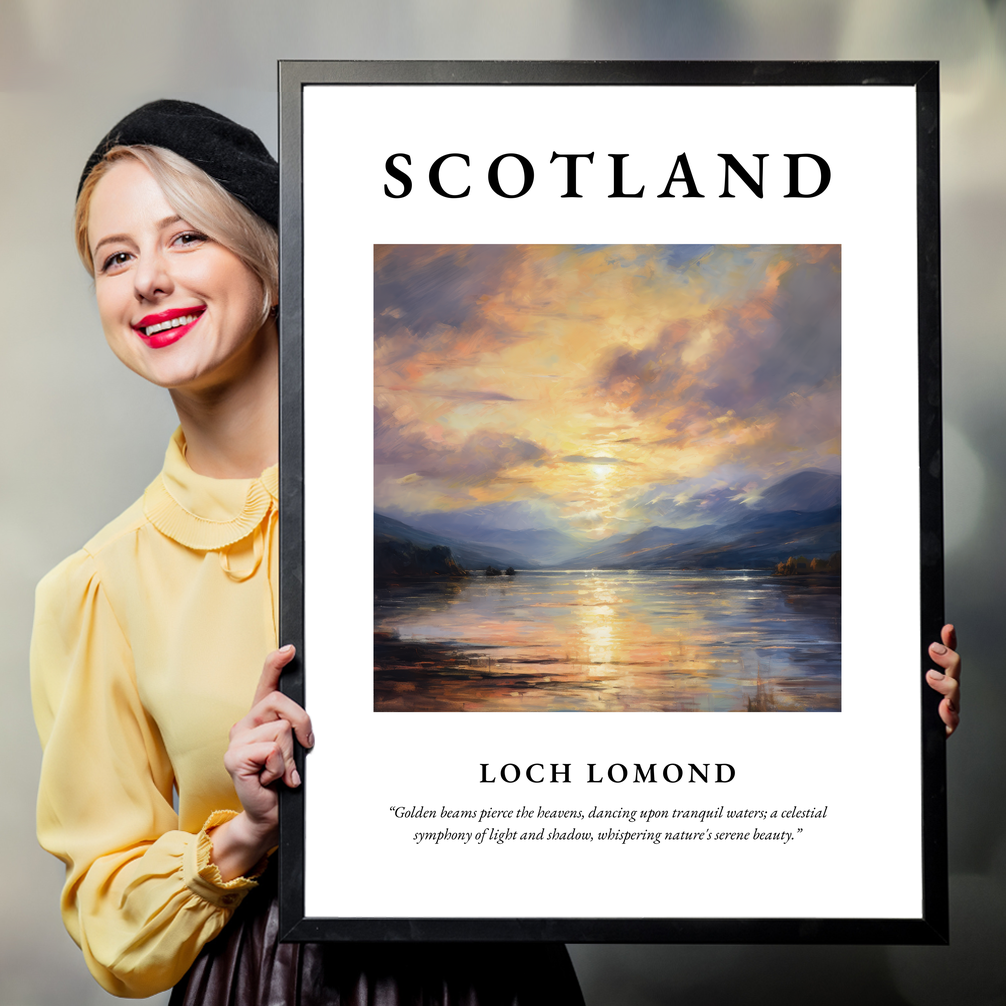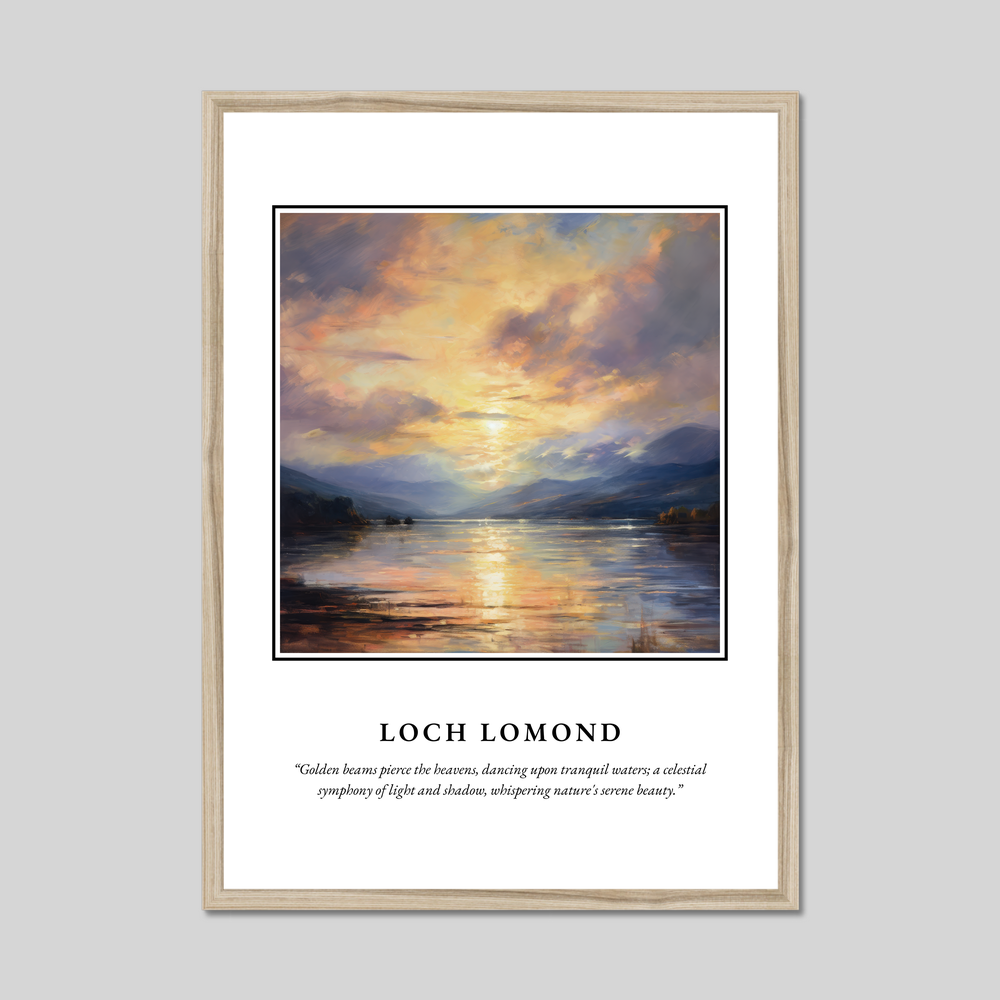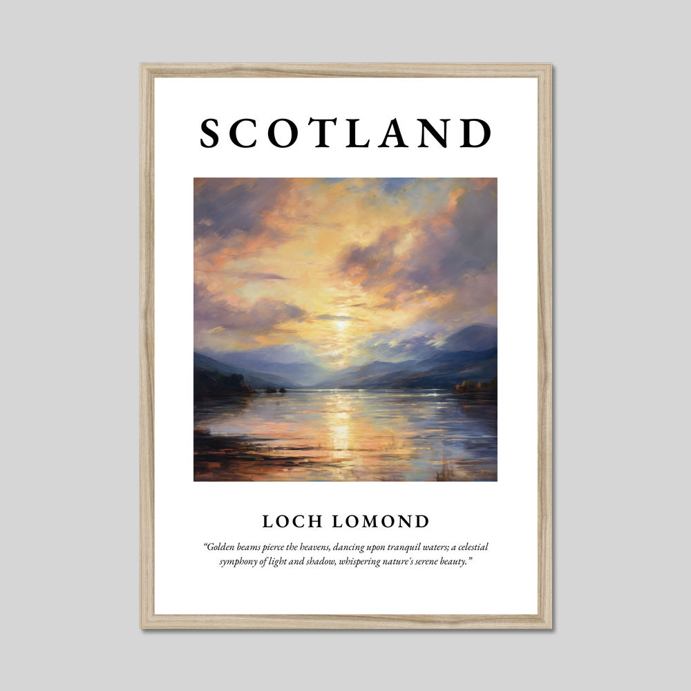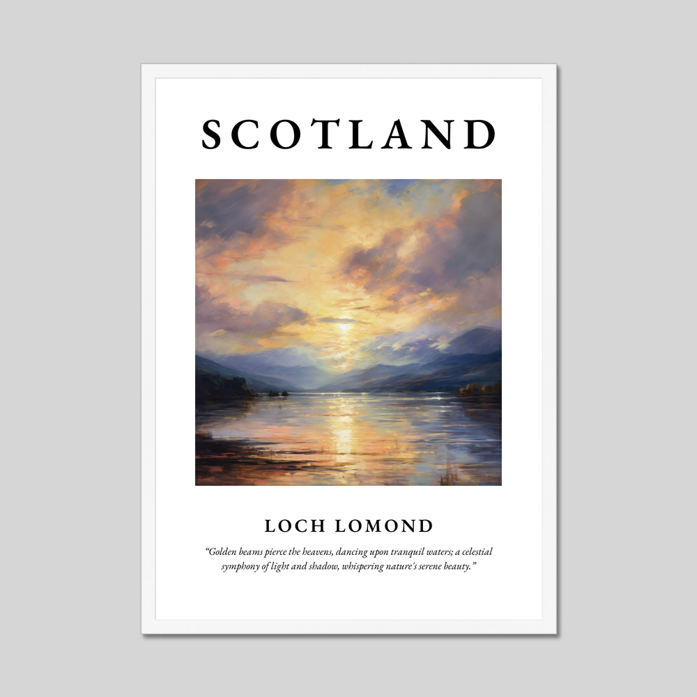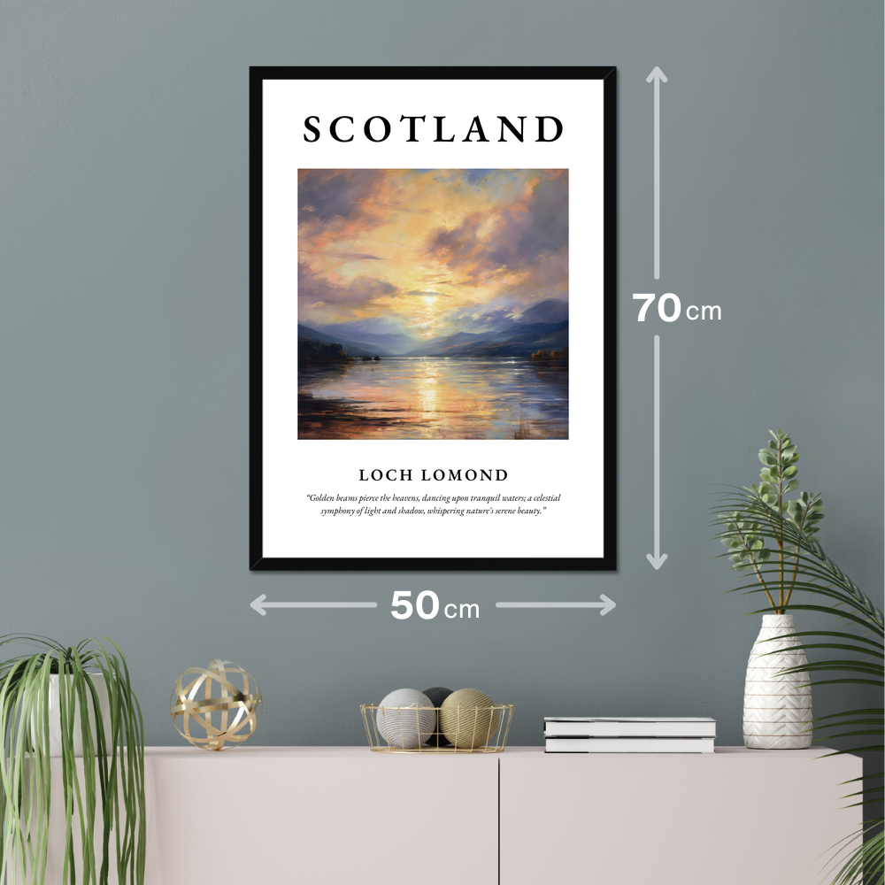 Capture the essence of Scotland's natural beauty with this stunning framed poster print, measuring an impressive 50cm x 70cm. A reflection of elegance and style, it features the majestic Loch Lomond in an Impressionist painting that promises to bring a touch of serene beauty to any room. Above the landscape, the word "SCOTLAND" commands attention in bold lettering, while below the painting, a poetic quote whispers the magic of nature’s symphony.