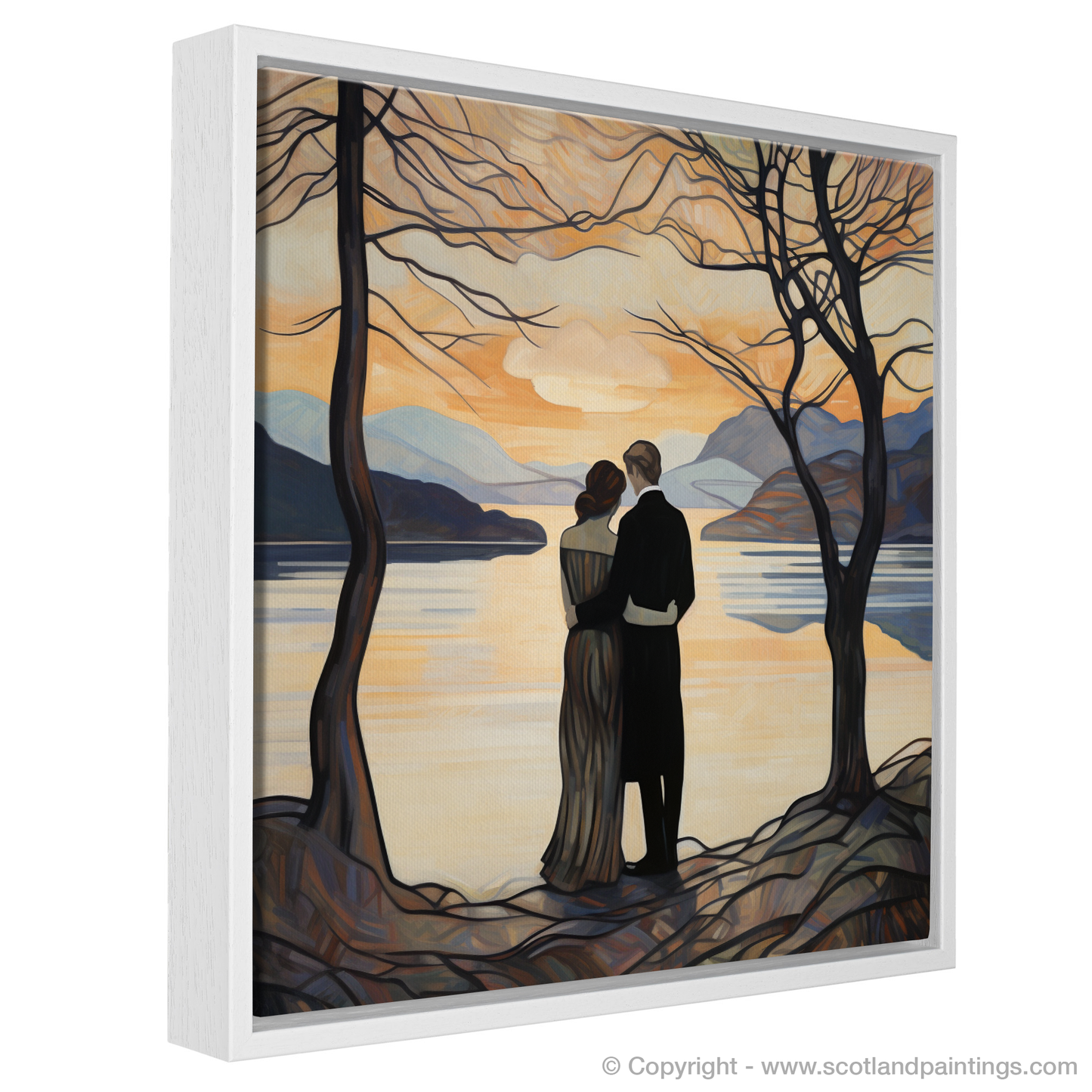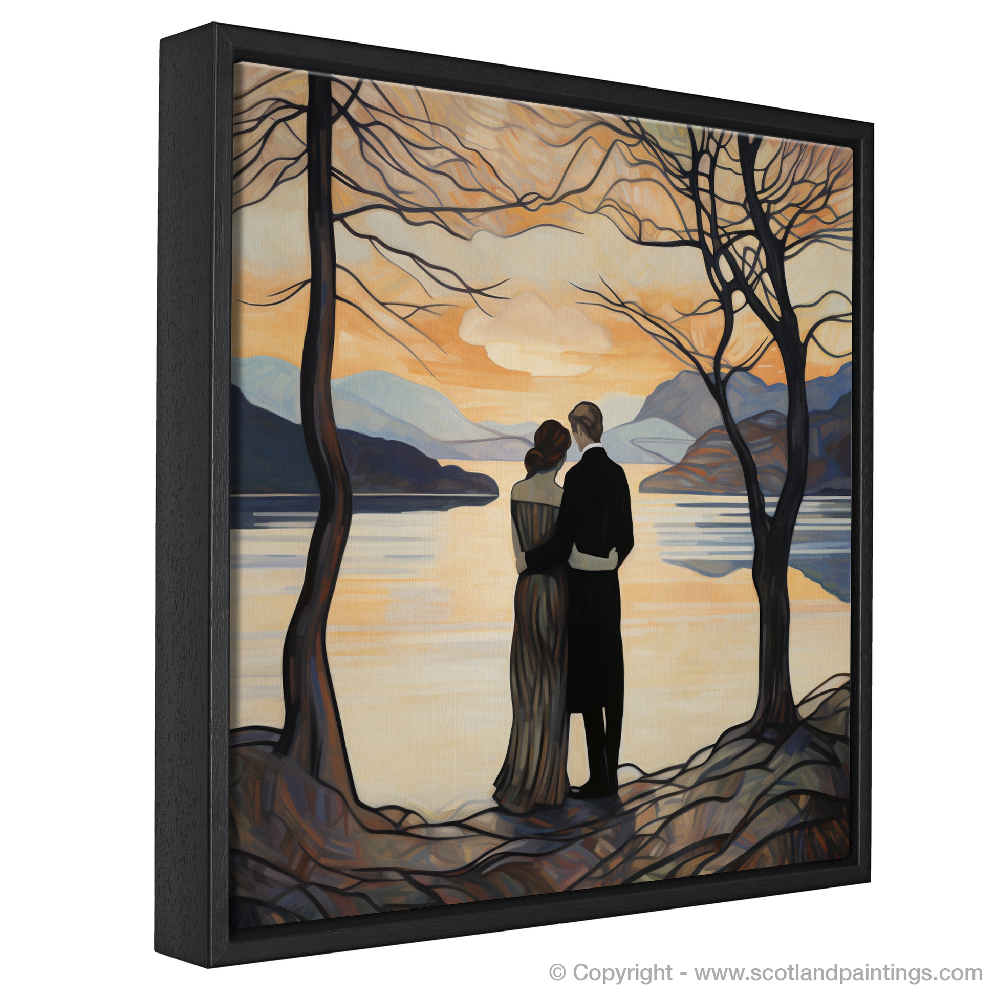 Capture the serene beauty and romantic allure of Loch Lomond with this enchanting print. The illustration depicts a couple standing closely, hands entwined, as they gaze across the tranquil waters of the loch. The timeless moment is framed by the delicate silhouettes of trees, their bare branches weaving a lace-like pattern against the warm hues of the sky.