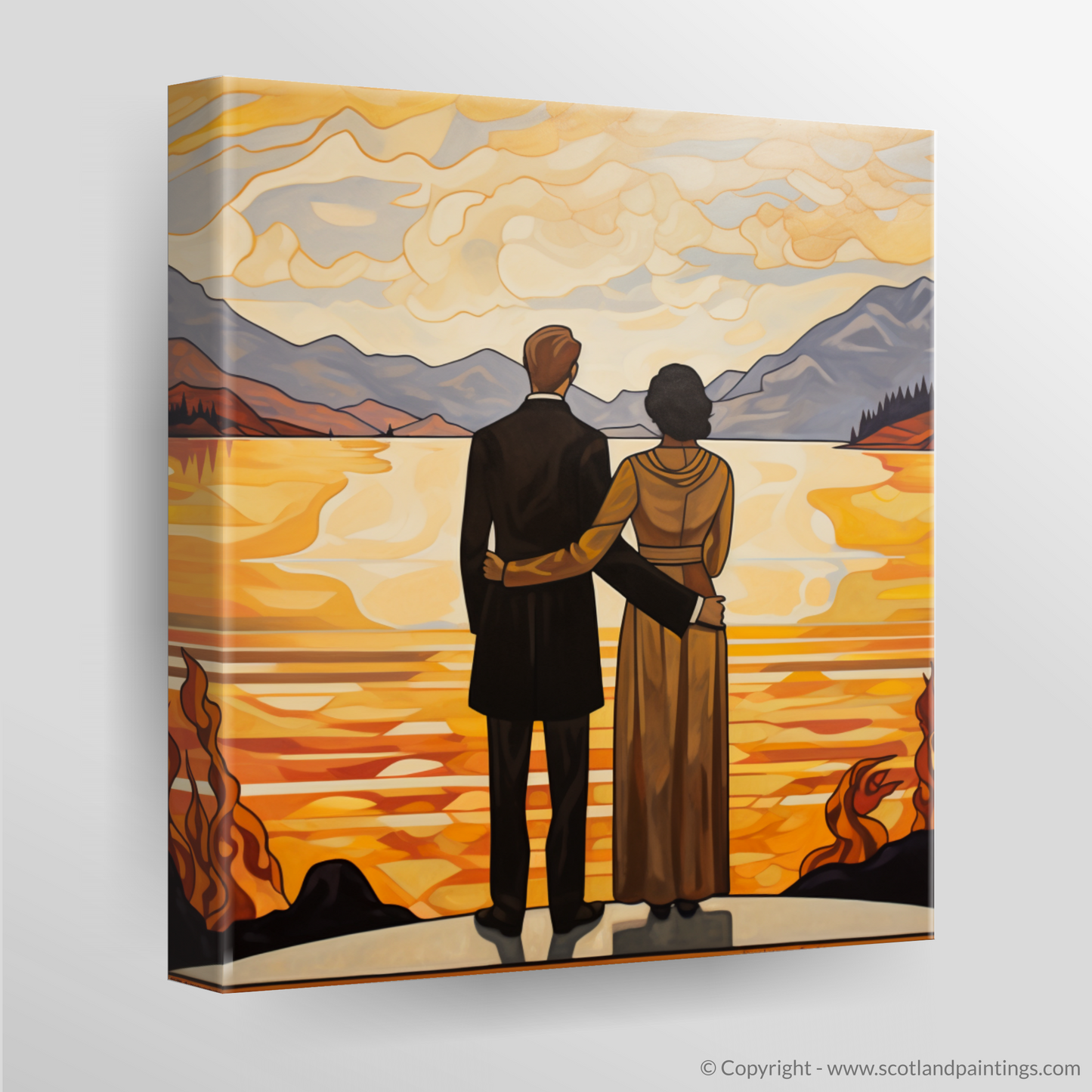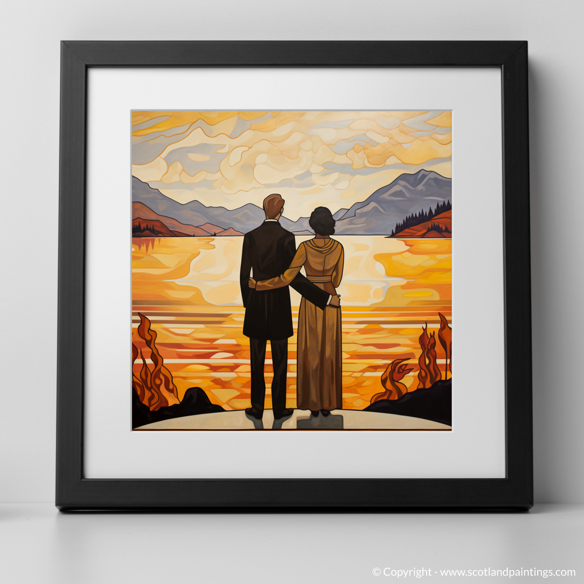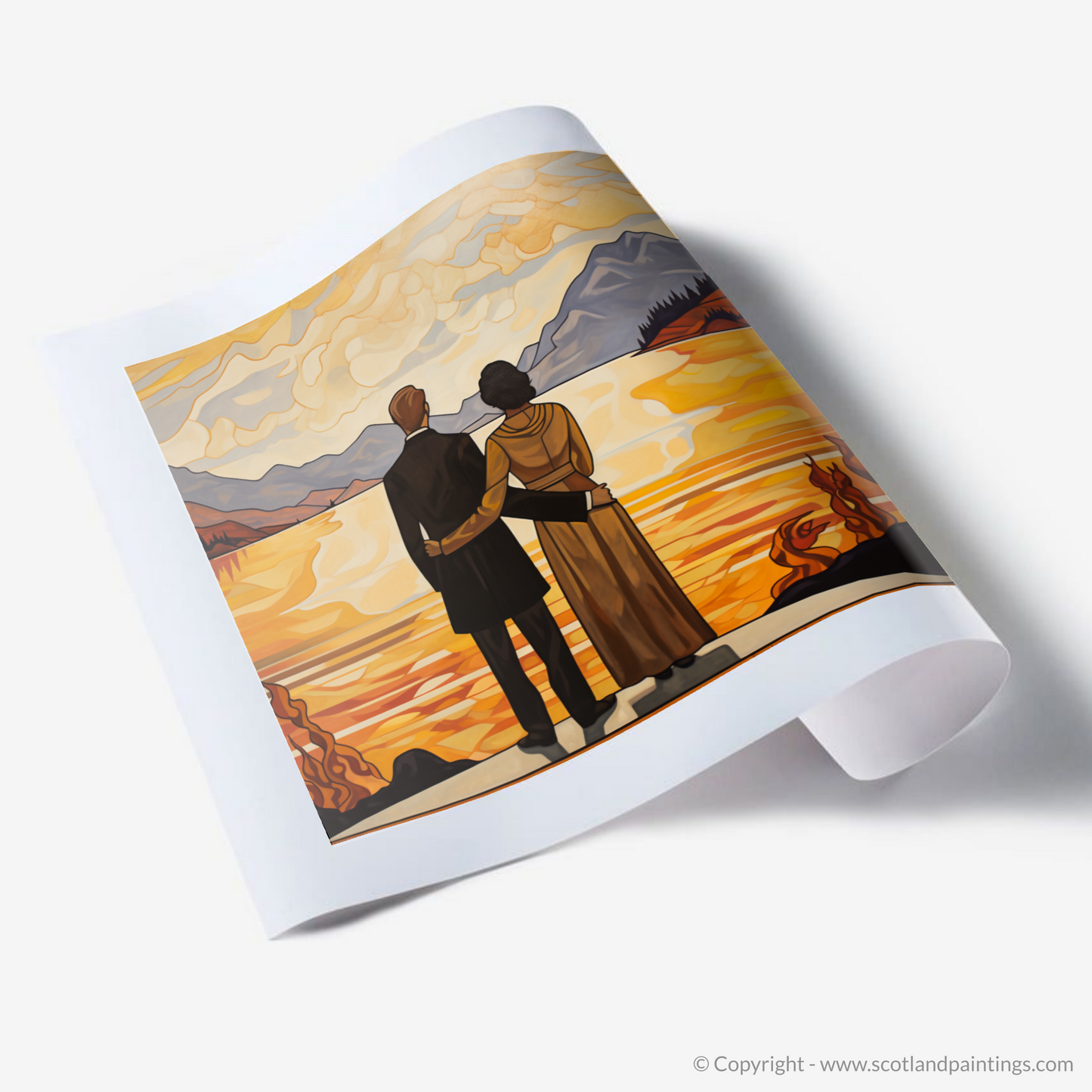 Crafted in the elegant and curvilinear style of Art Nouveau, this striking print captures the essence of romanticism and the sublime natural beauty of Loch Lomond. The piece features a couple, united by their clasped hands, as they gaze out over the tranquil waters that mirror the golden hues of twilight. The man, dressed in a classic black suit, and the woman, adorned in a long, draped gown with hints of warm amber, stand together on a vantage point that affords them an uninterrupted view of the vastness before them.