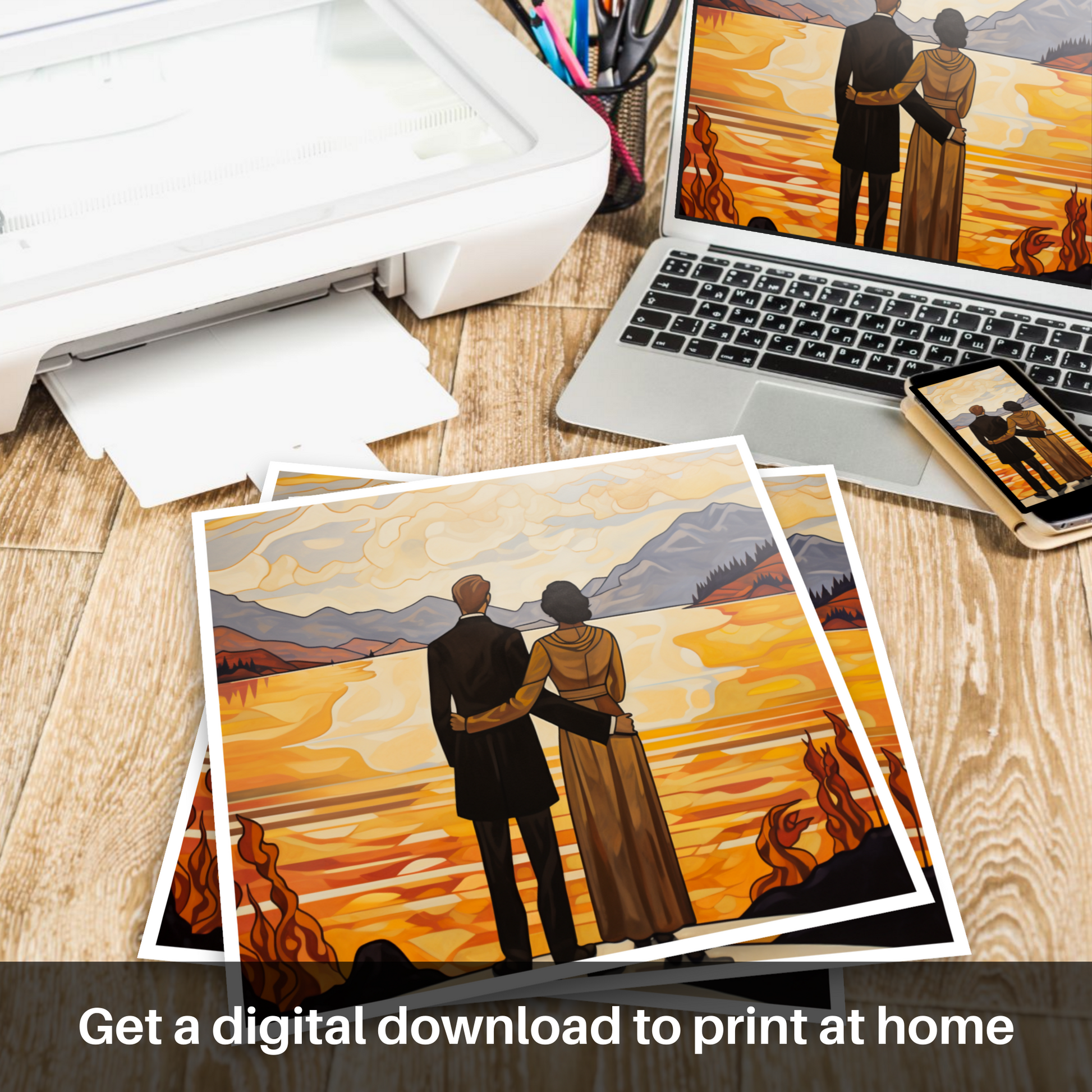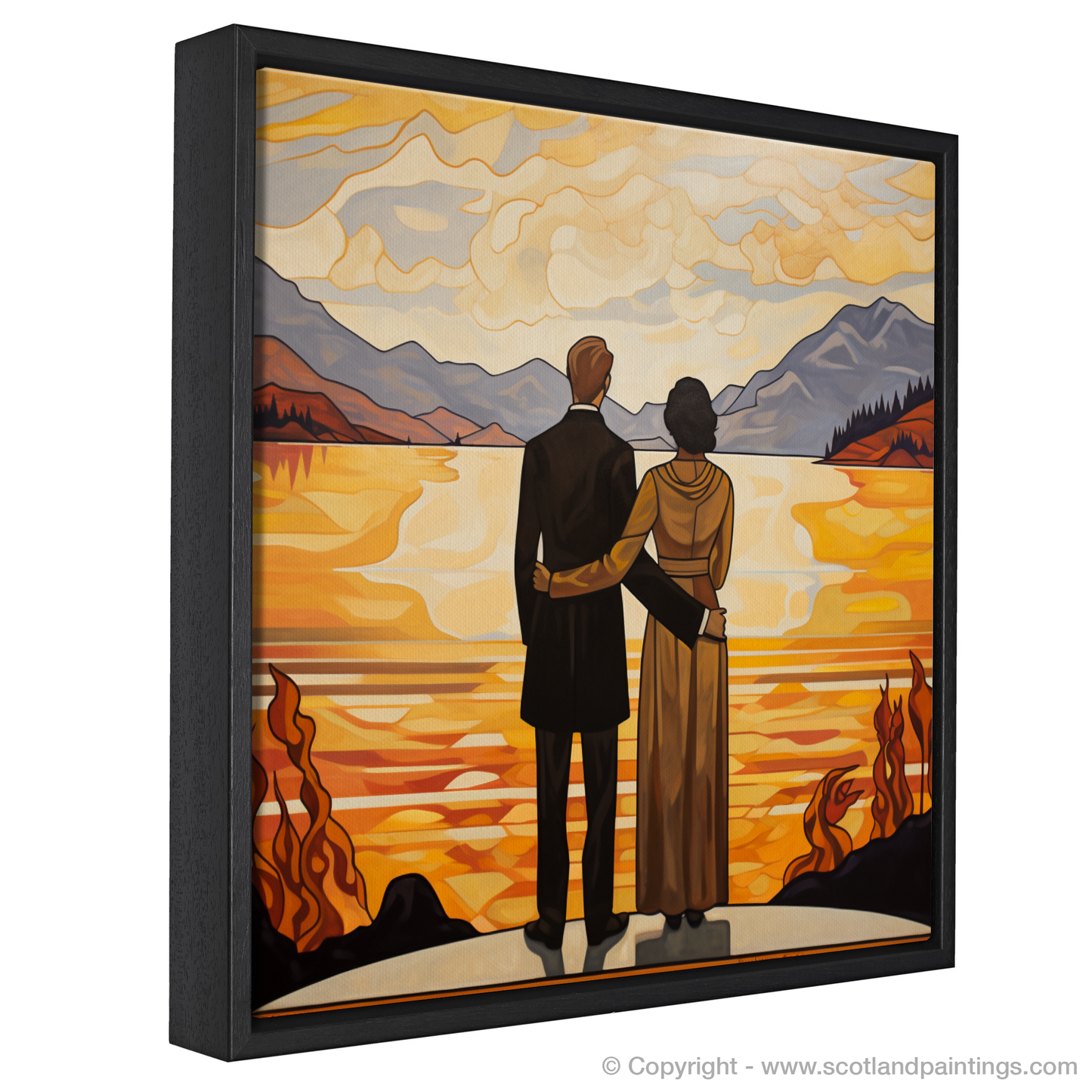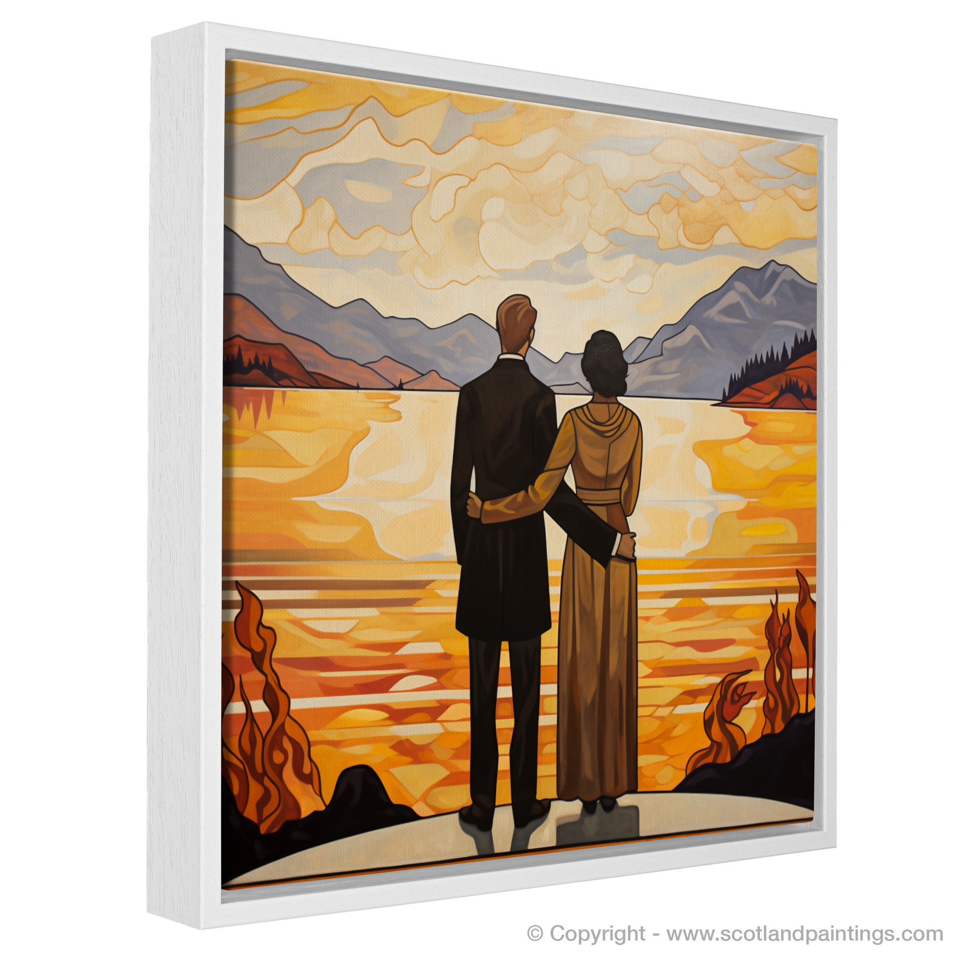 Crafted in the elegant and curvilinear style of Art Nouveau, this striking print captures the essence of romanticism and the sublime natural beauty of Loch Lomond. The piece features a couple, united by their clasped hands, as they gaze out over the tranquil waters that mirror the golden hues of twilight. The man, dressed in a classic black suit, and the woman, adorned in a long, draped gown with hints of warm amber, stand together on a vantage point that affords them an uninterrupted view of the vastness before them.