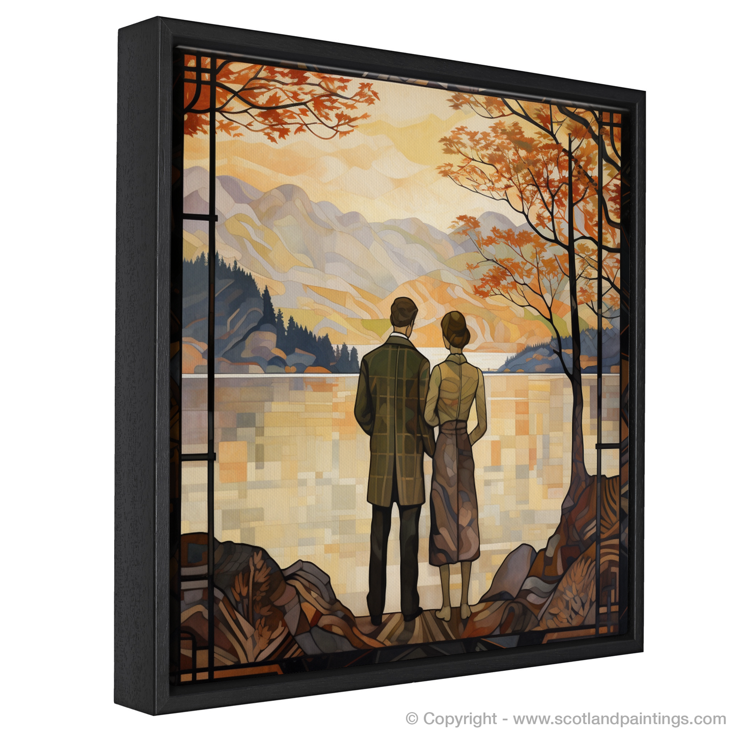 This captivating print presents a serene scene of a couple standing hand-in-hand, gazing out at the majestic Loch Lomond. The style is reminiscent of Art Nouveau, with its fluid lines, natural forms, and ornamental details. The piece features a rich colour palette, dominated by warm hues that encapsulate the changing leaves of autumn.