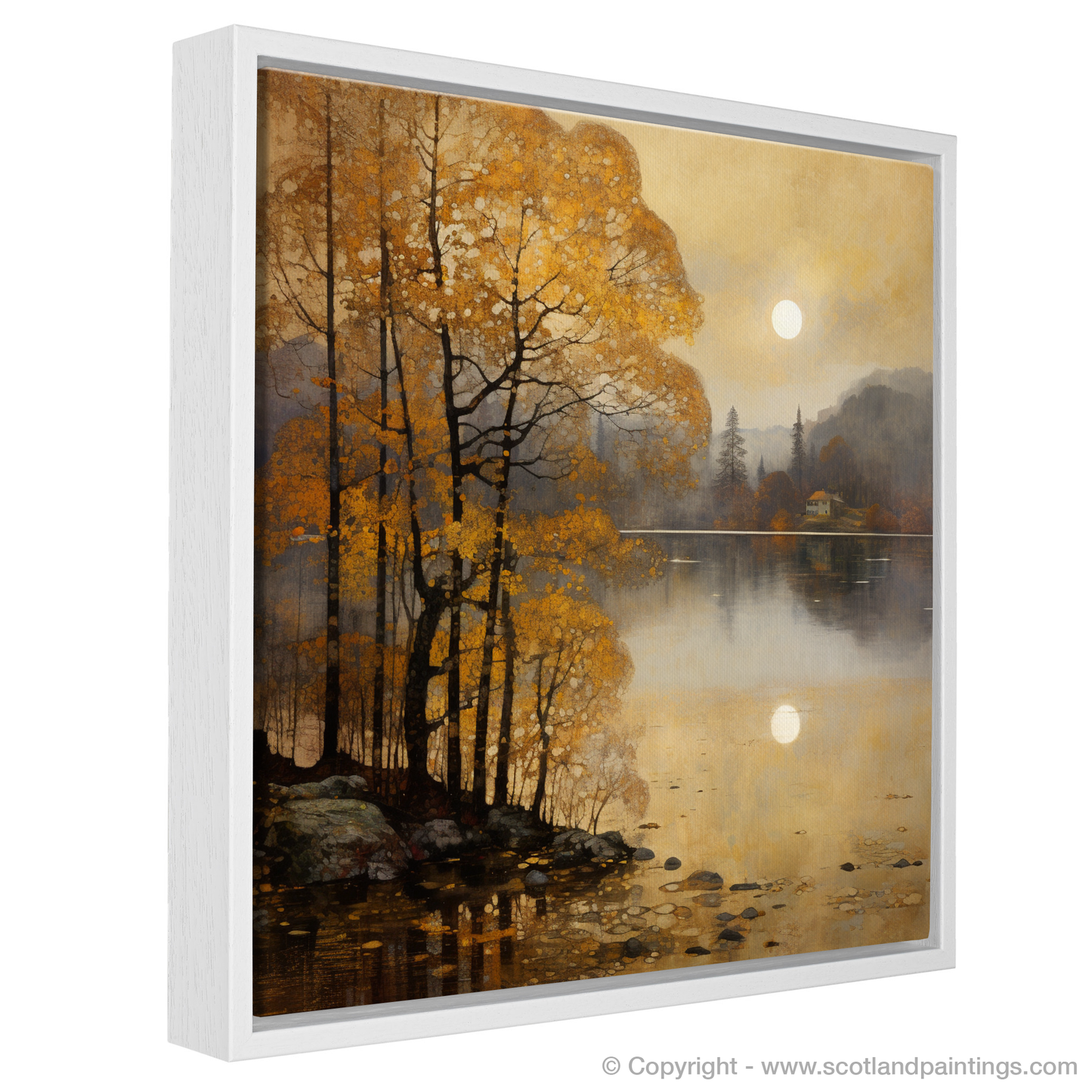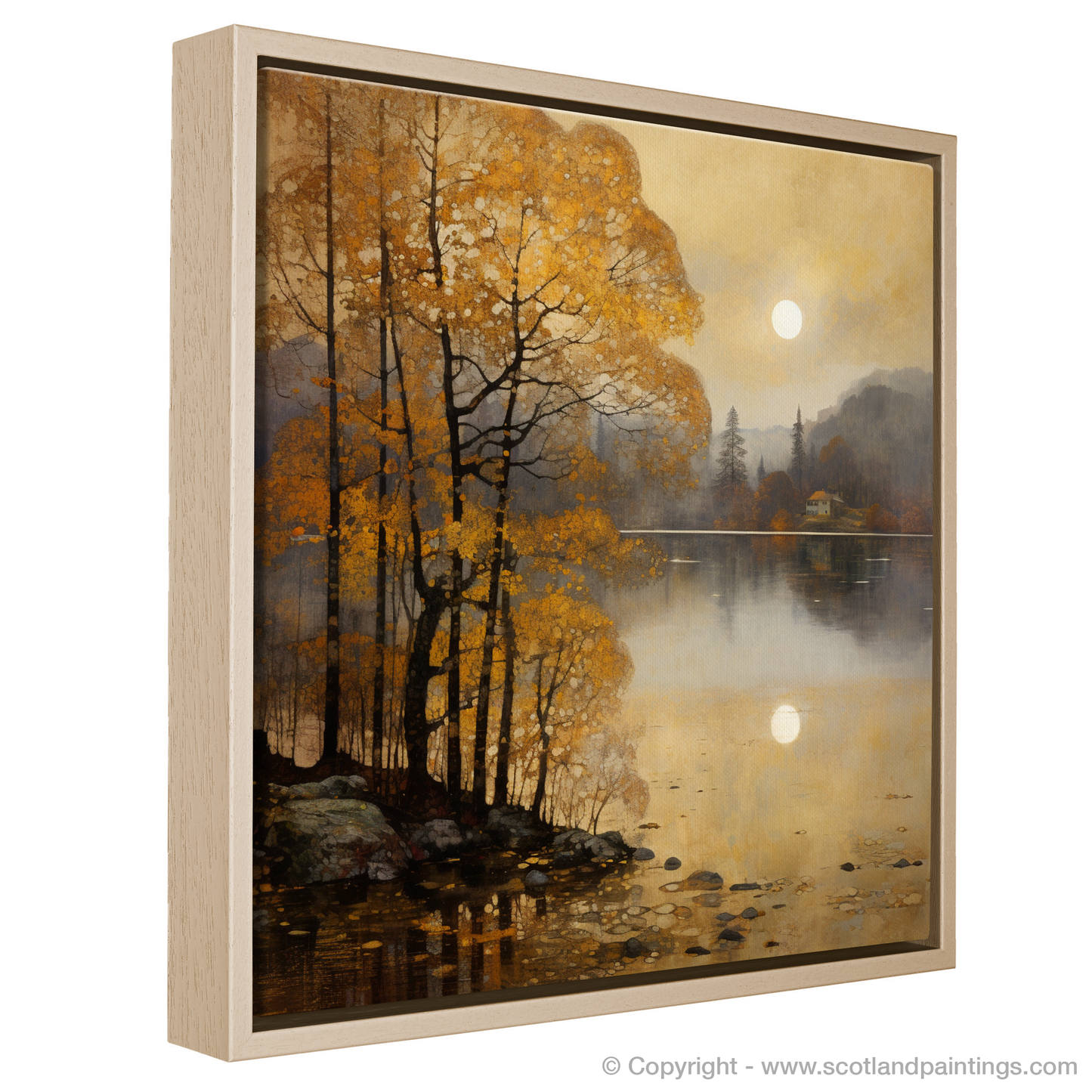 Standing sentinel on the water's edge, a collection of trees adorned in autumnal splendour dominates the left side of the scene. Their leaves, a tapestry of fiery oranges and yellows, appear to light the scene with an inner radiance, contrasting dramatically against the misty backdrop. The intricate branches reach skywards, weaving a delicate pattern that echoes the natural artistry of the Art Nouveau style.